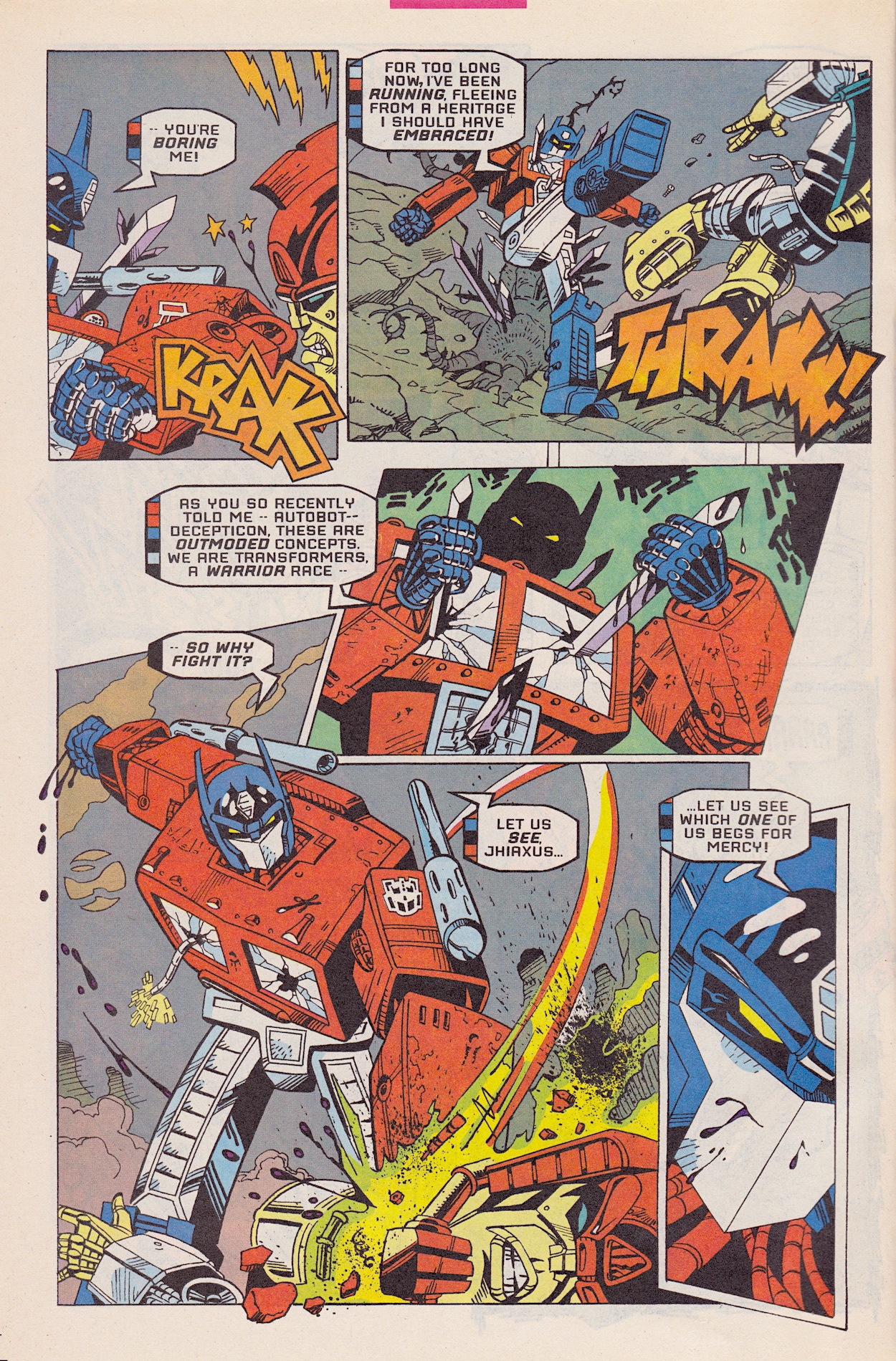 First we get a moment of reflection with Jhiaxus bemoaning the fact that “tact and diplomacy” haven’t worked. If what he’s done was tactful and diplomatic then the comic successfully predicted some of our idiotic world leaders today. While the Deceptions are the ones to initiate the fighting, it’s actually their ship that’s boarded by Jhiaxus’ troops. What follows is nothing short of a massacre!
