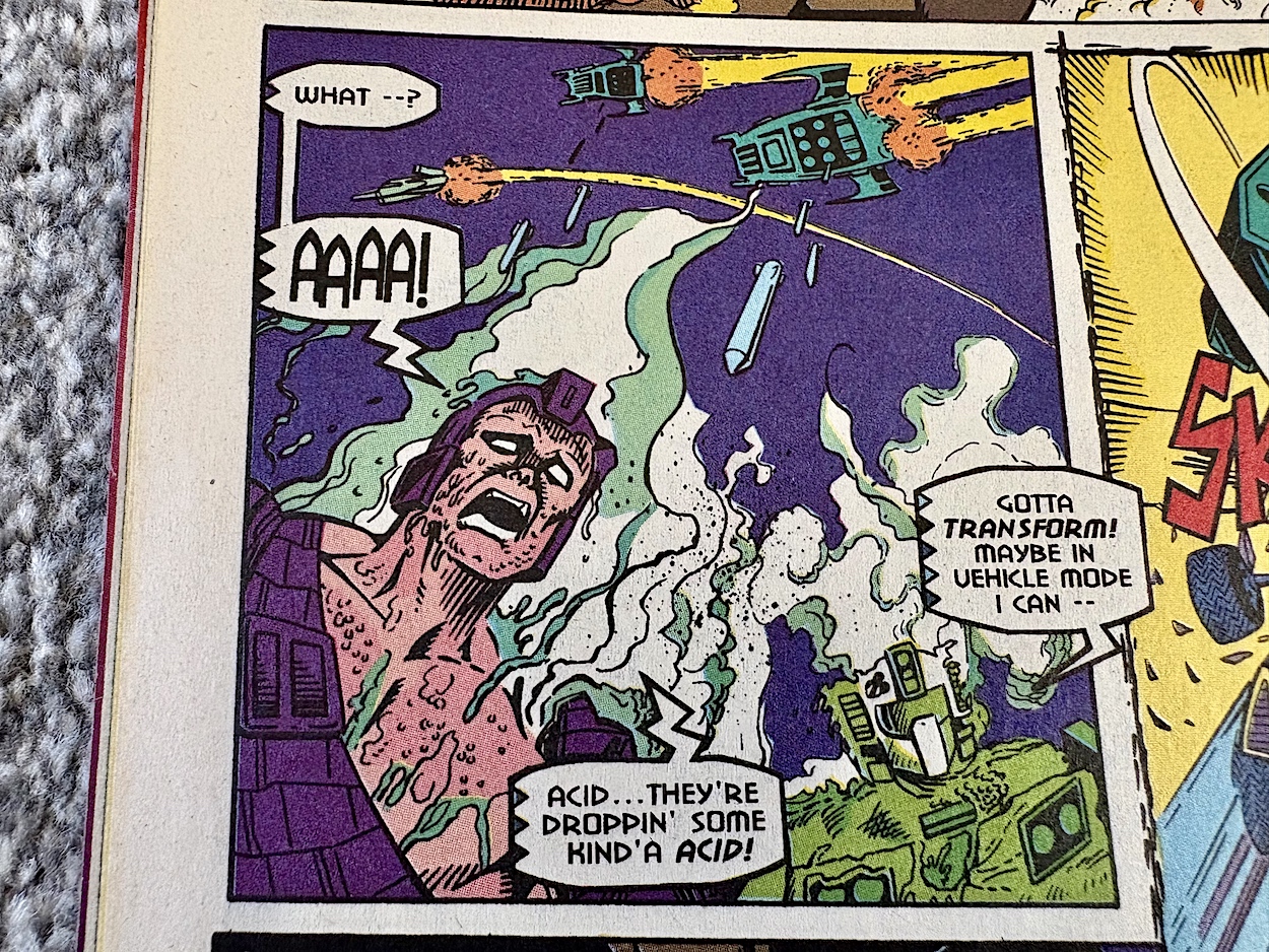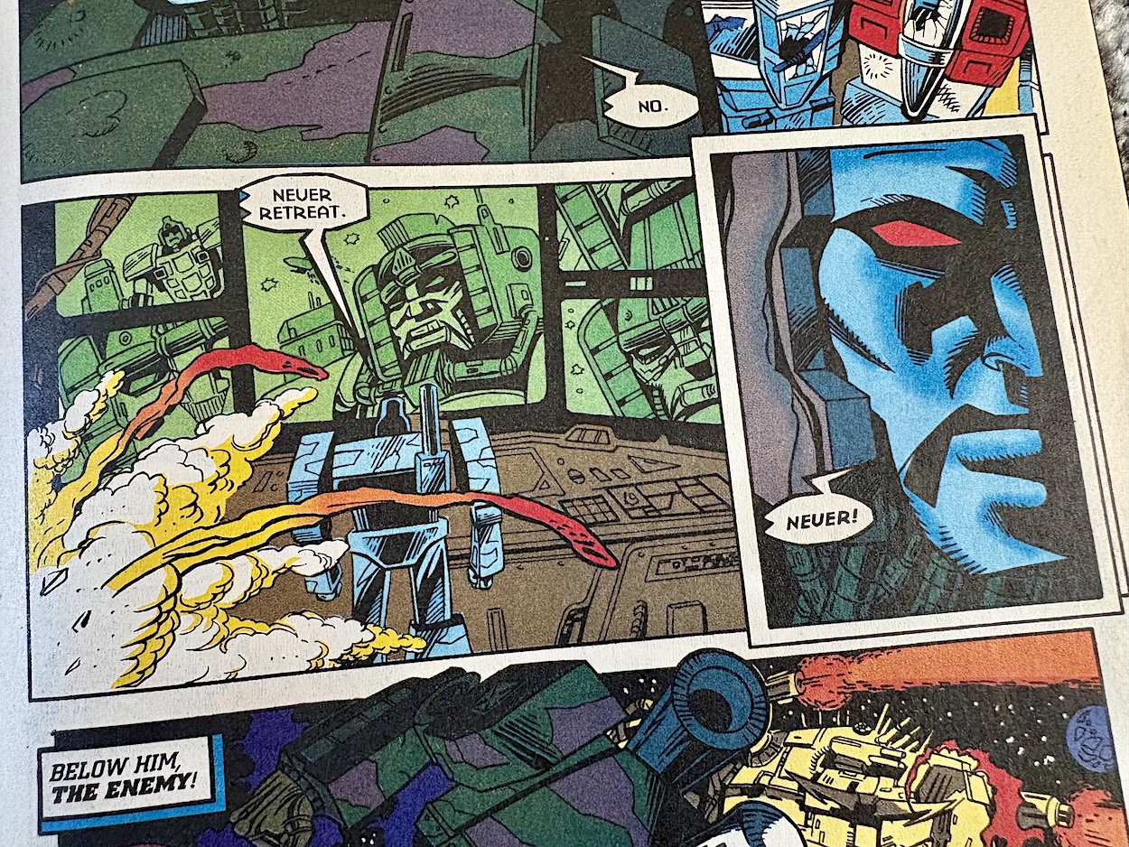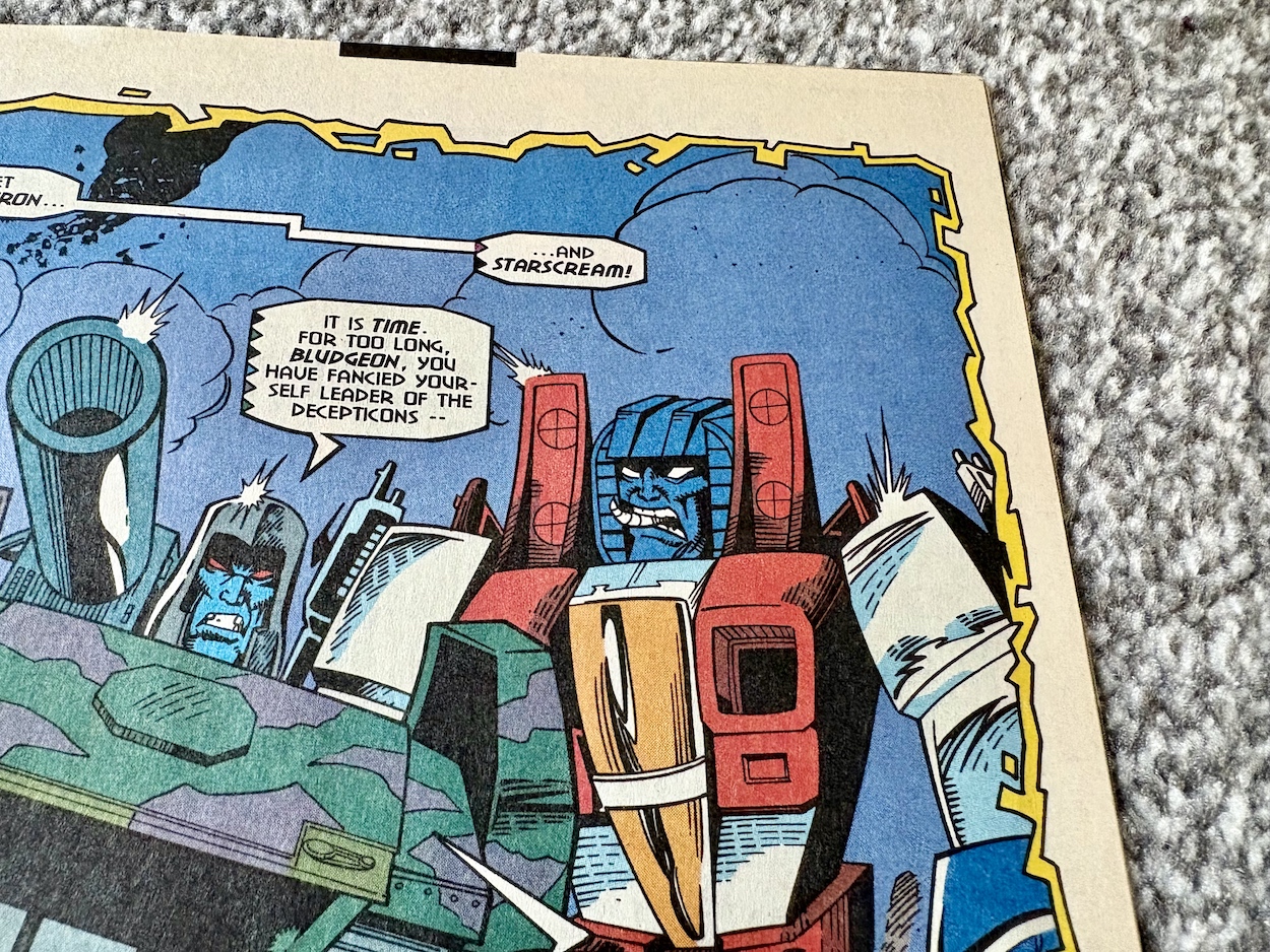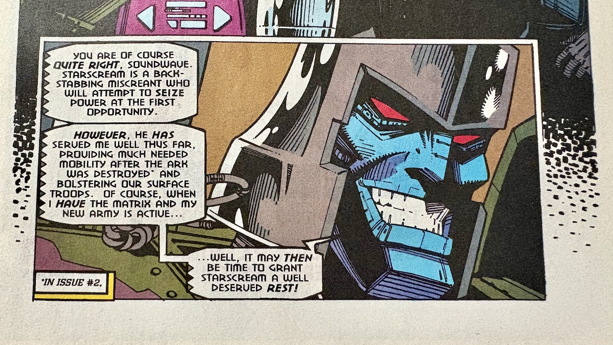 The attack goes flawlessly for the Decepticons but in the background one of their ilk isn’t happy with how he’s being used; he’s been resurrected for a single-minded purpose just to be disposed of when the job is done. No prizes for guessing it’s Starscream, once more raising the questions of why Megatron chose him in the first place and why has he a head full of human teeth.