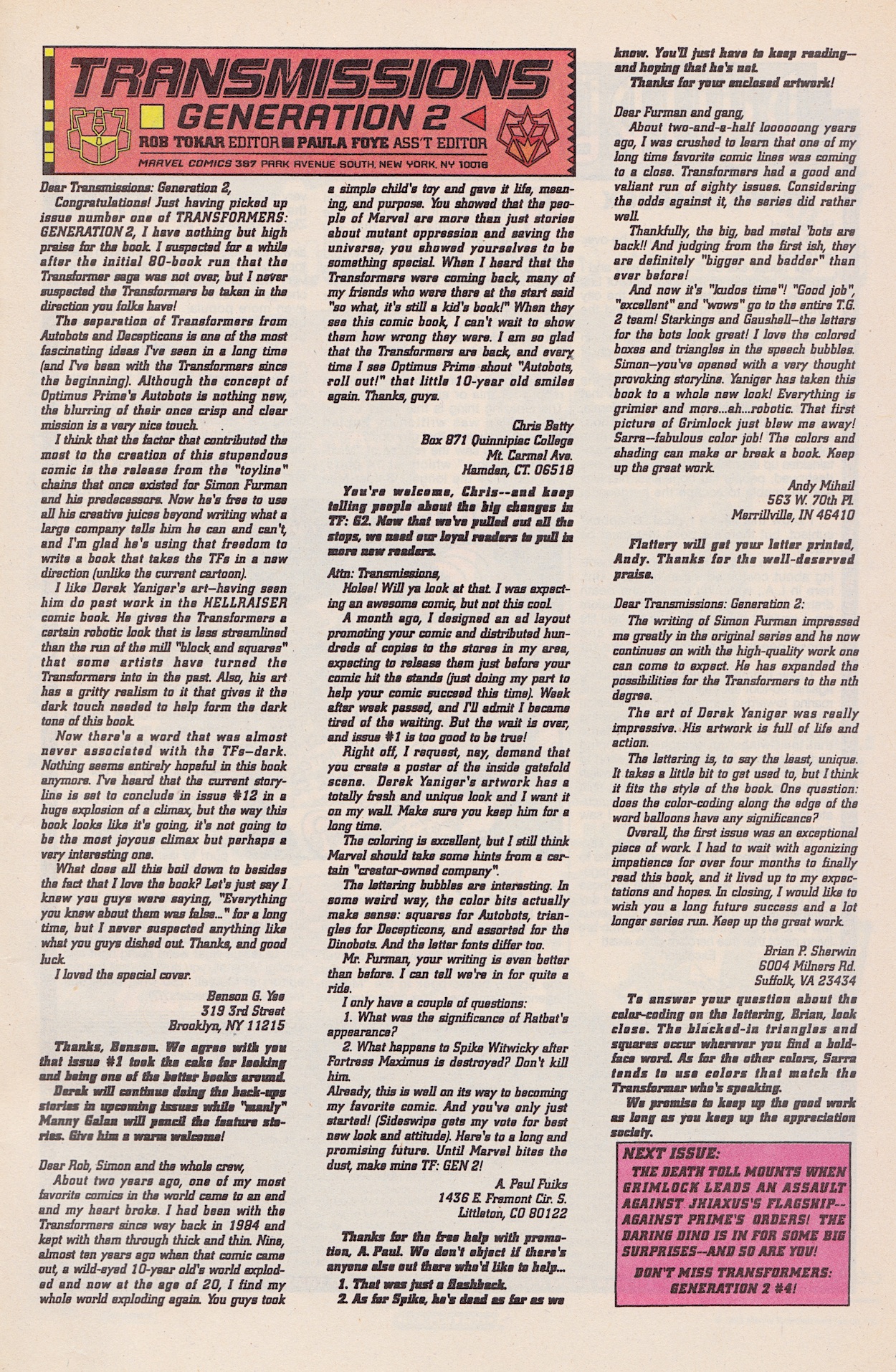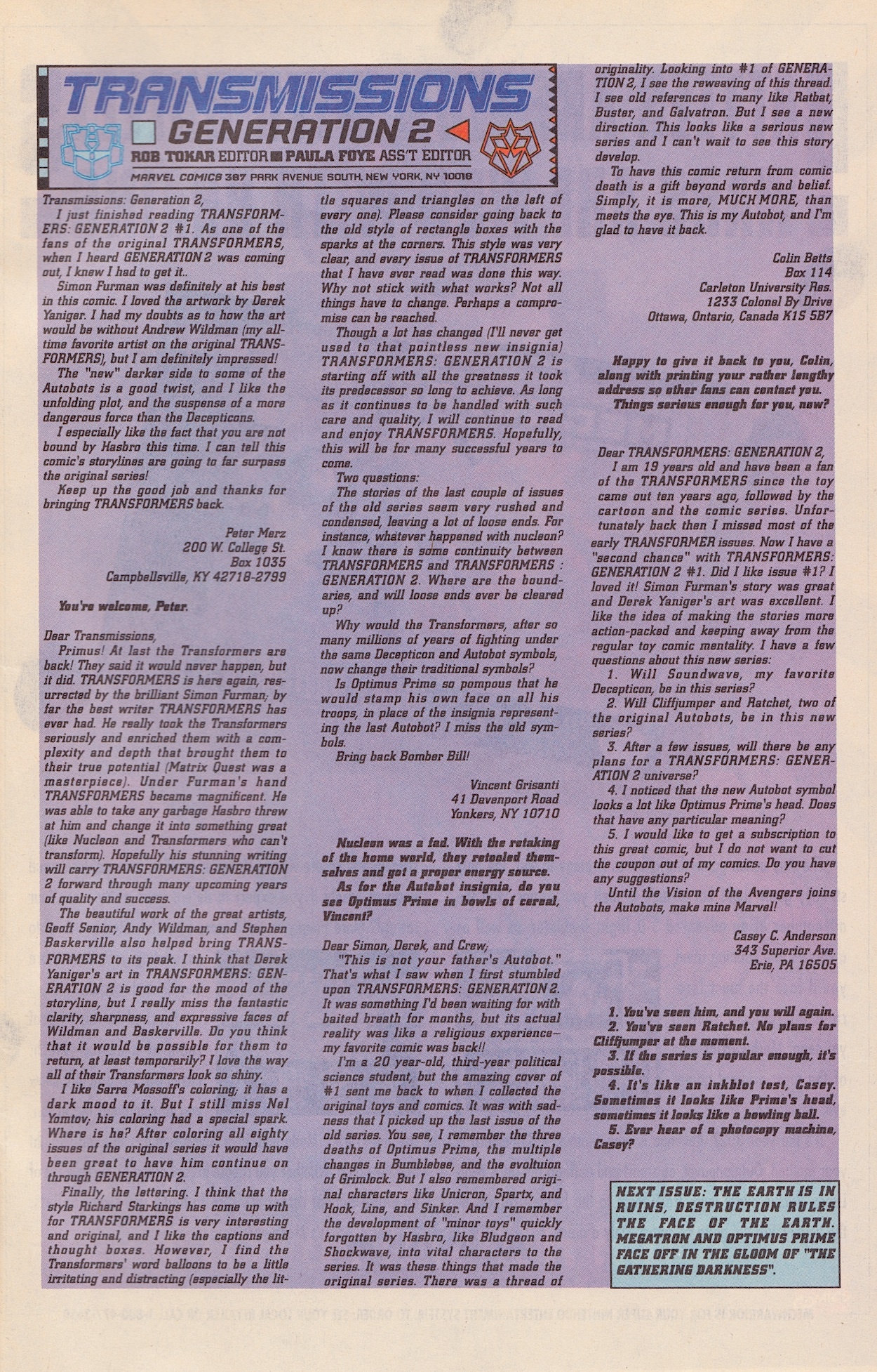 In G1 Darkwing and the UK letter answerer Dreadwind combined into the giant jet toy called Dreadwing. It’s this name Hasbro went with for this stealth bomber Decepticon in the G2 range but Simon has named it Darkwing. Just to add more confusion, back in #5 Darkwing was named as a downed Decepticon jet (hence he needed rebuilt by the power of the Matrix) but his colour scheme was that of Dreadwind. So that’s that cleared up!