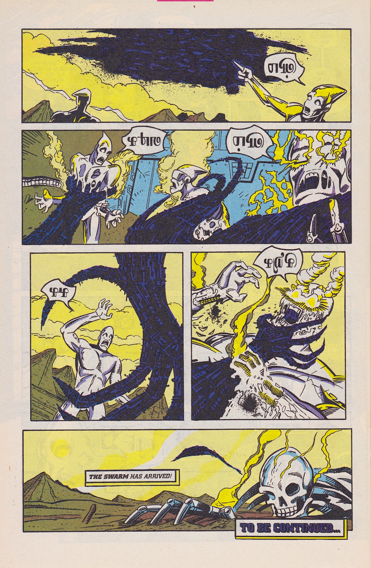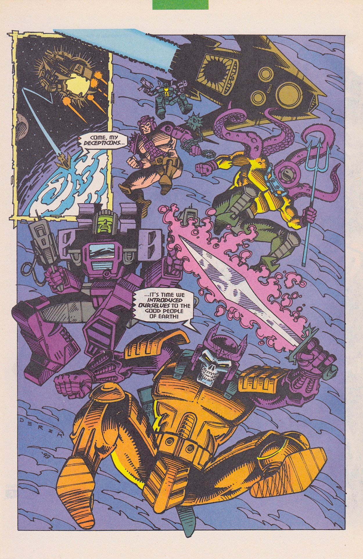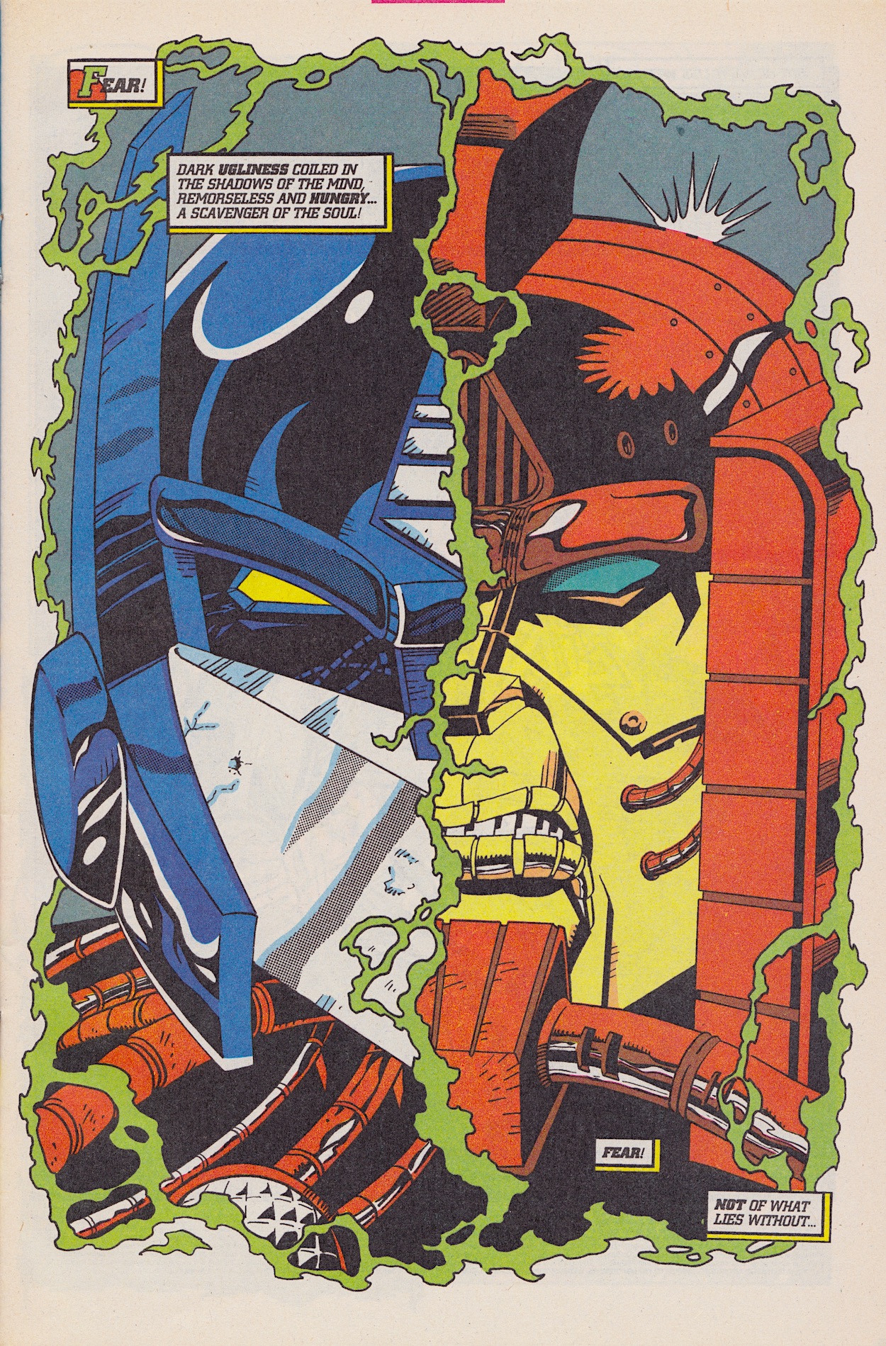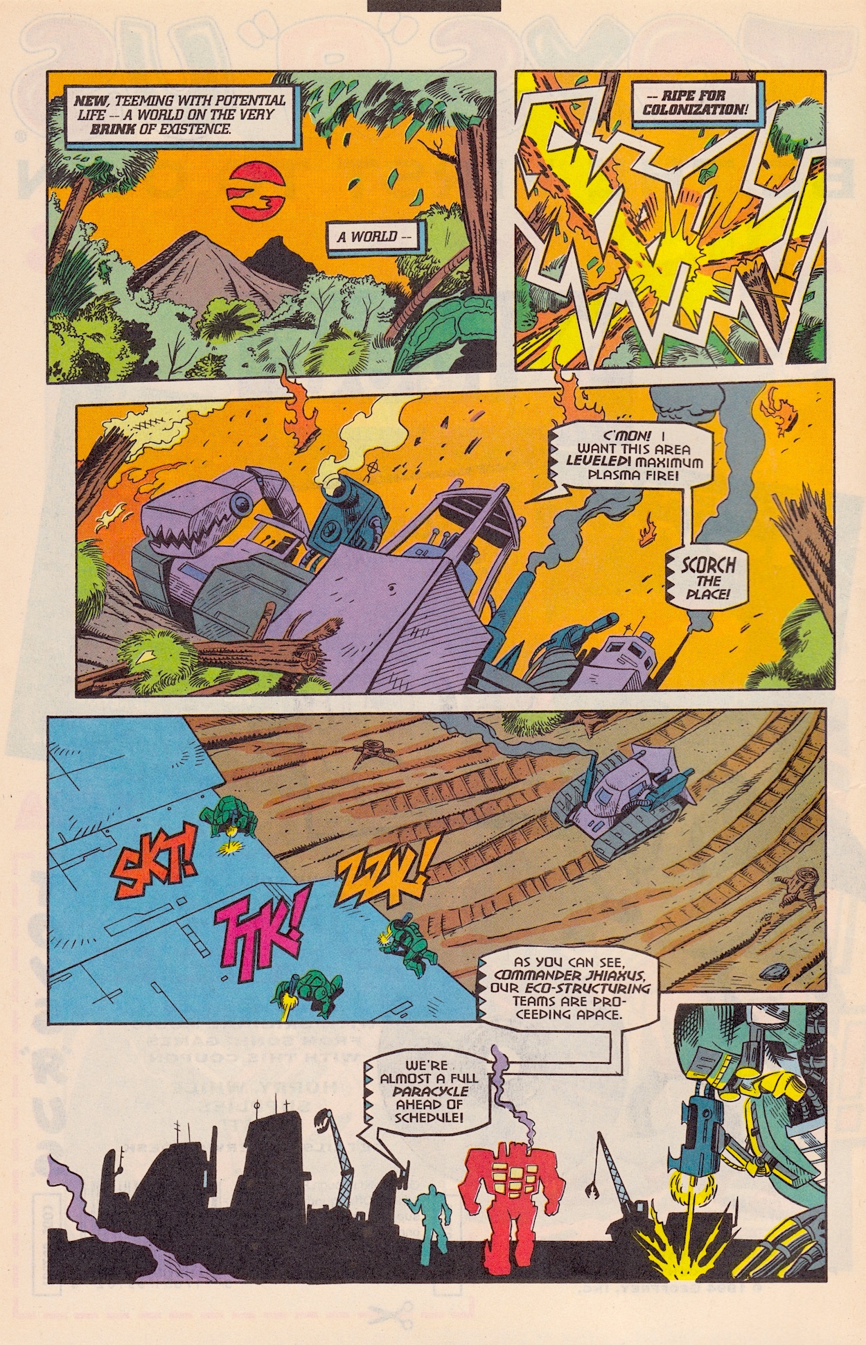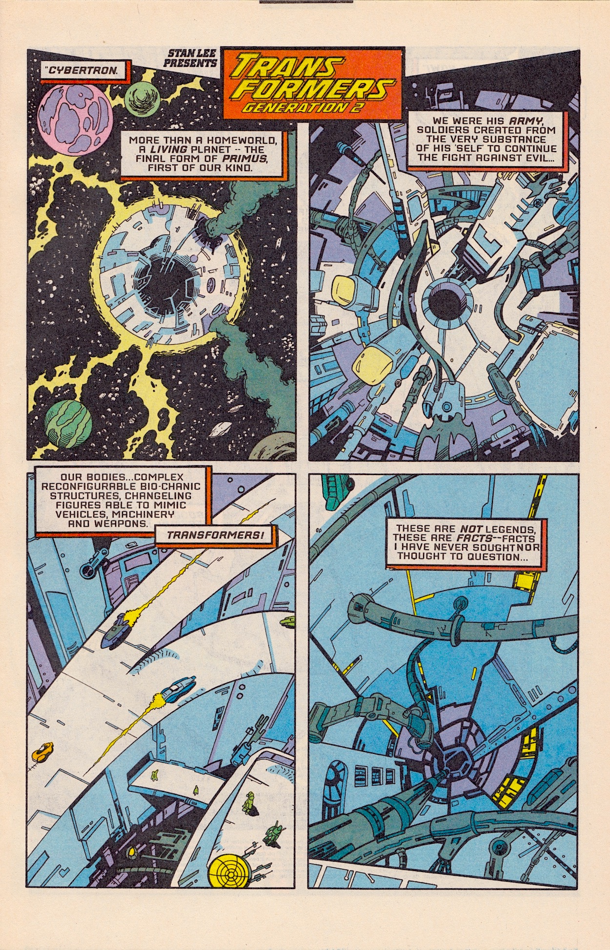 Once more Derek Yaniger‘s art is a storming start to the latest issue of Marvel US‘ Transformers: Generation 2 comic from 1994 and inside it’s all-action. Written by Simon Furman, New Dawn begins with Megatron‘s Decepticons purging a planet of its robotic life in order to steal its natural resources, giving penciller Manny Galan, inker Jim Amash and colourist Sarra Mossoff a chance to introduce some of the new G2 toys as dramatically as possible!