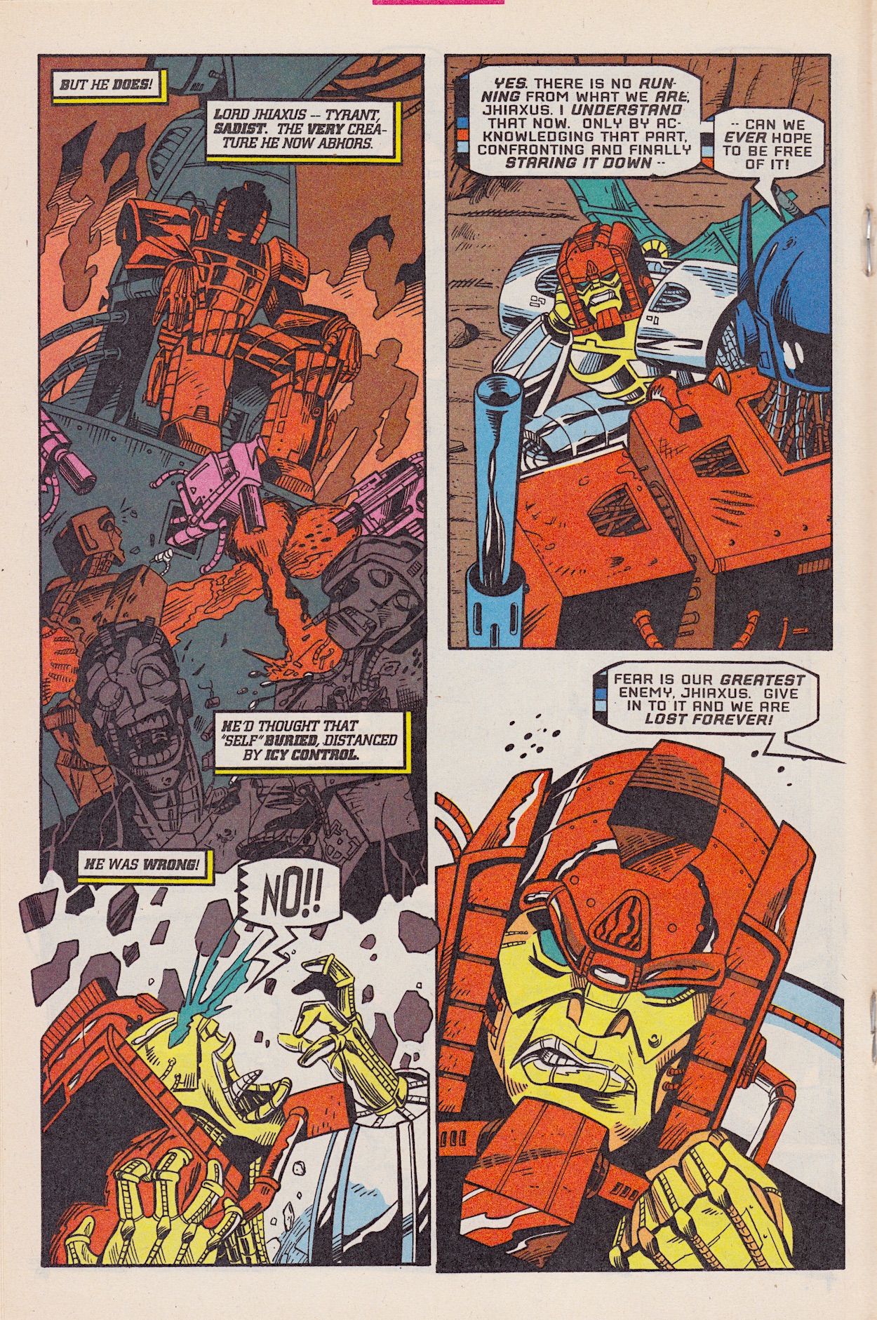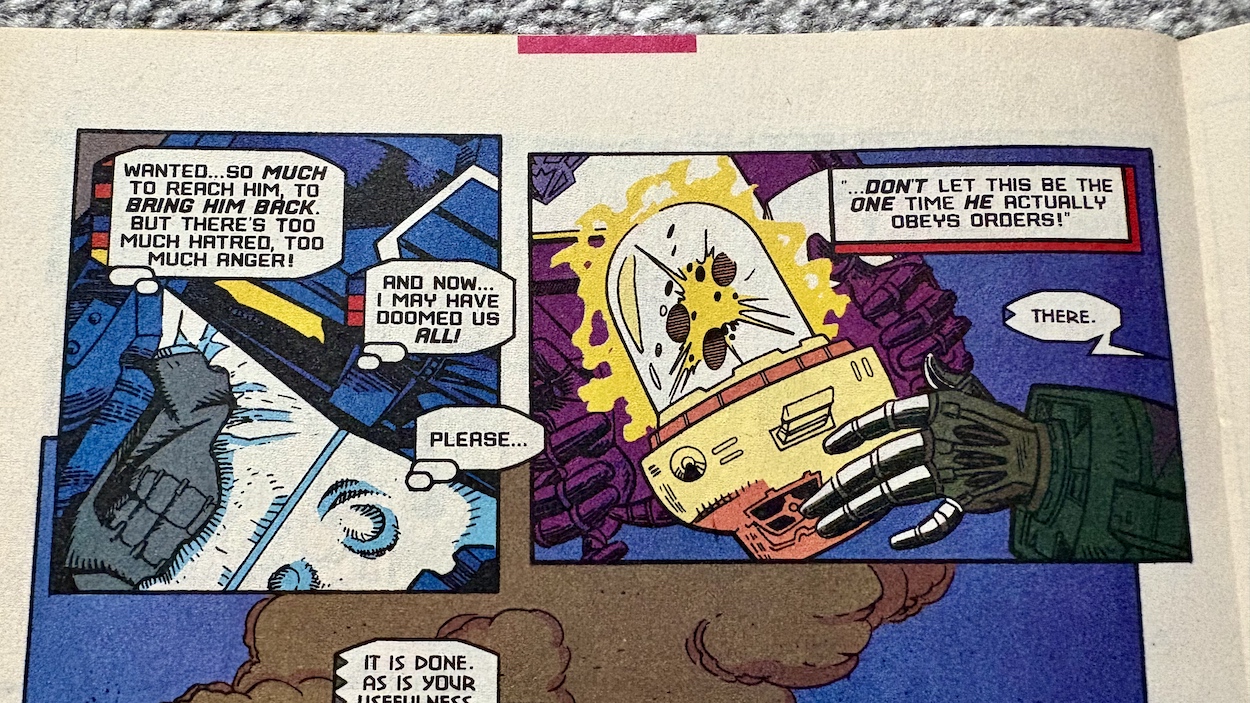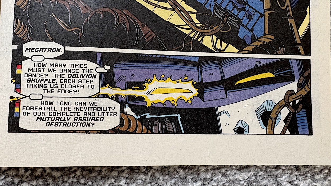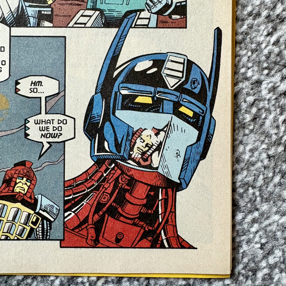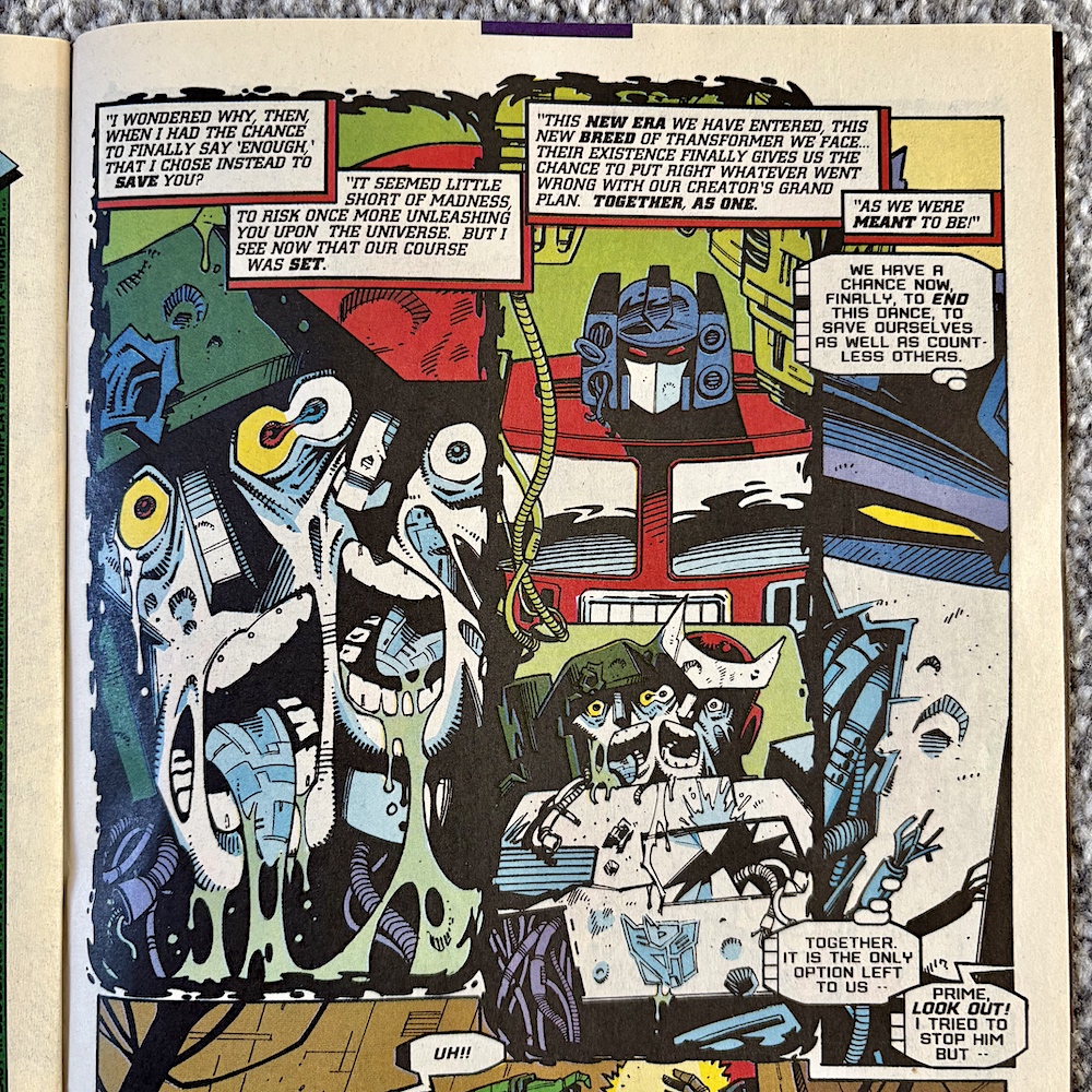Having been close to death so many times must play on your mind, right? Reading that panel above, we know Prime is thinking back over the millennia and the endless war between the Autobots and Decepticons and the futility of it all. The back and forth between wins and loses, the only winner will surely be death, for them and their race. They’ve even saved one another upon occasion. Do they somehow know they actually need each other?