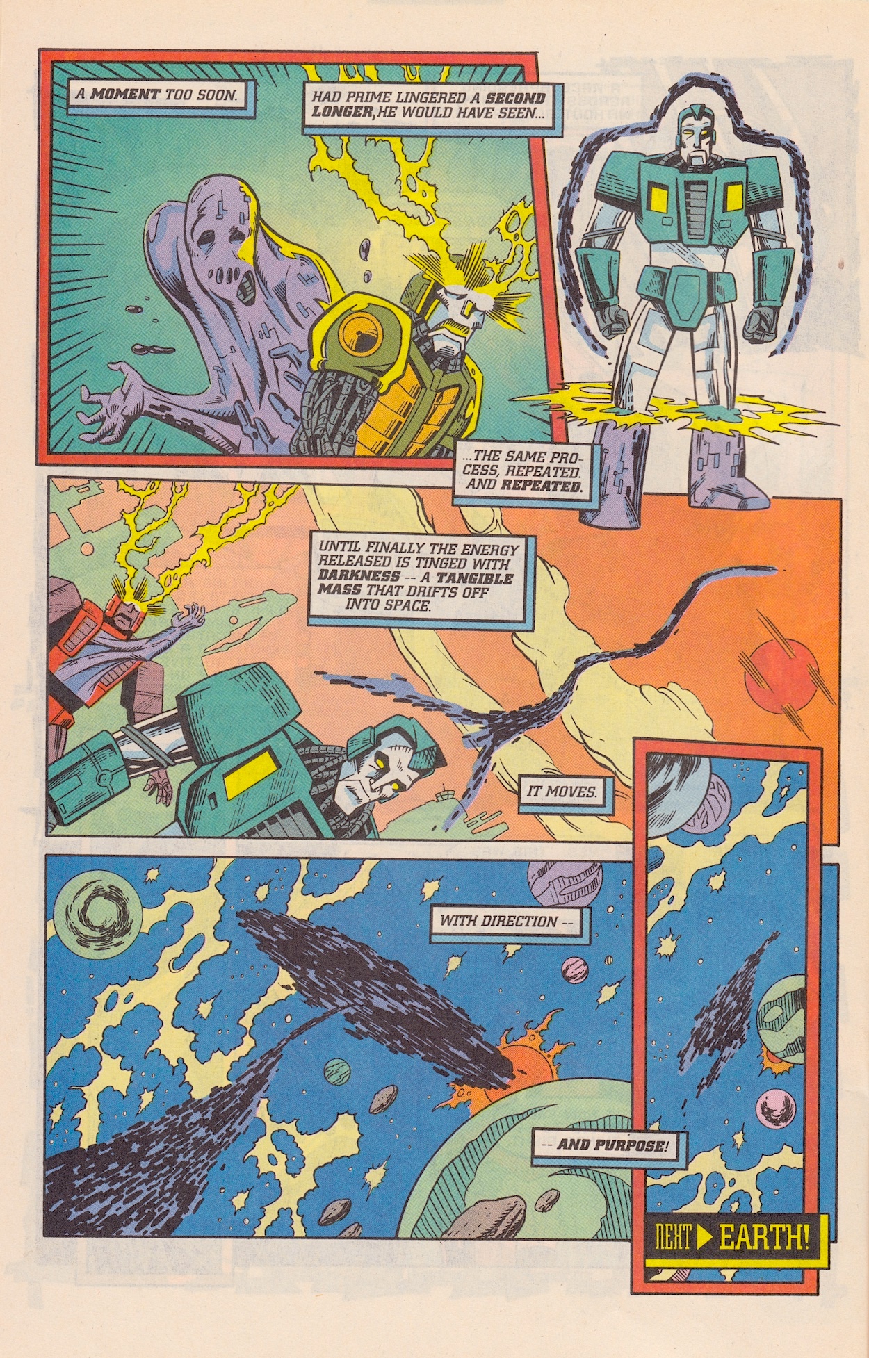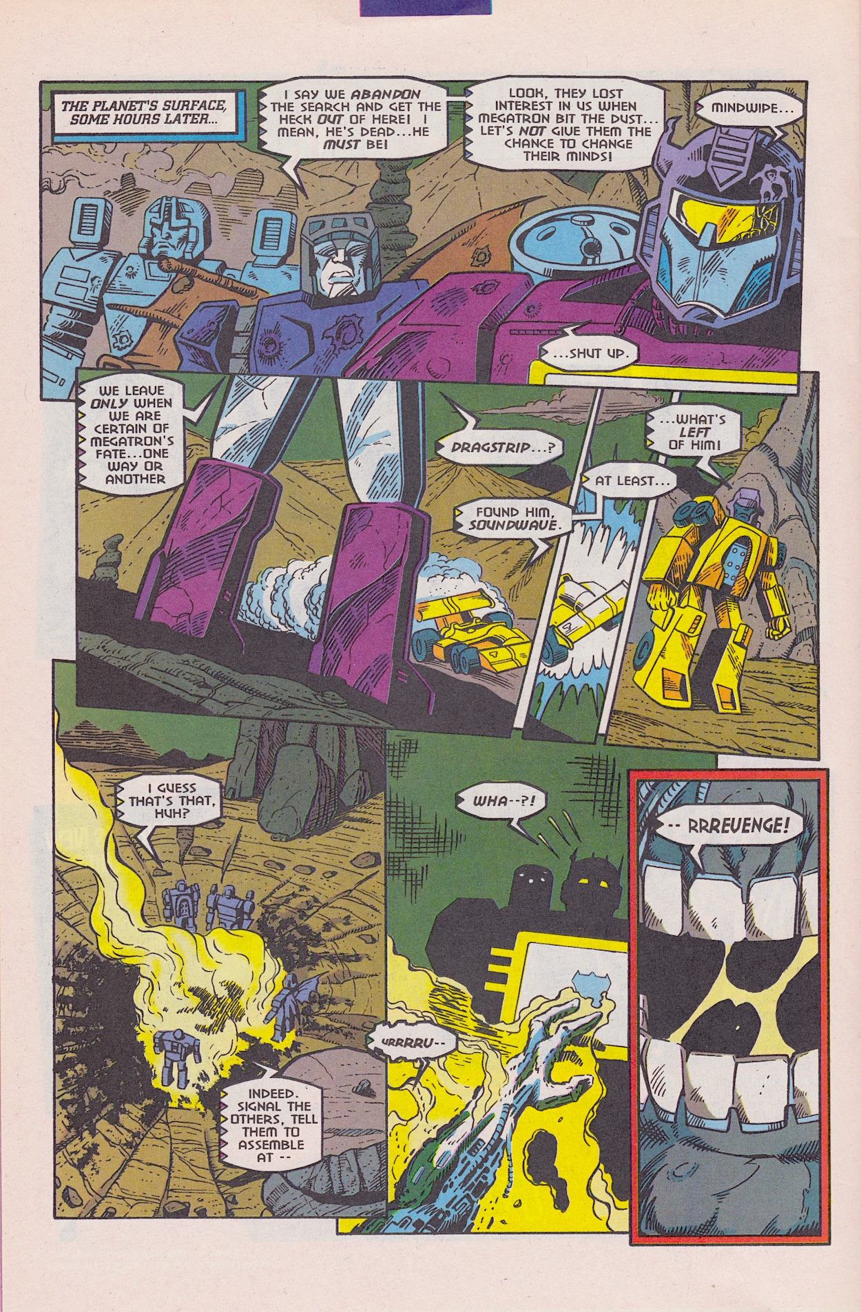 But it’s a testament to the quality of the comic that despite this it’s still so damned enjoyable. Soundwave takes some troops (including one of my favourite childhood Transformers toys, Dragstrip) down to the planet and discovers what they initially think are Megatron’s remains. However, as you can see it takes more than a savage beating in the depths of space, unprotected planetfall and a full speed descent over many miles into the solid ground to keep a good Decepticon down.
