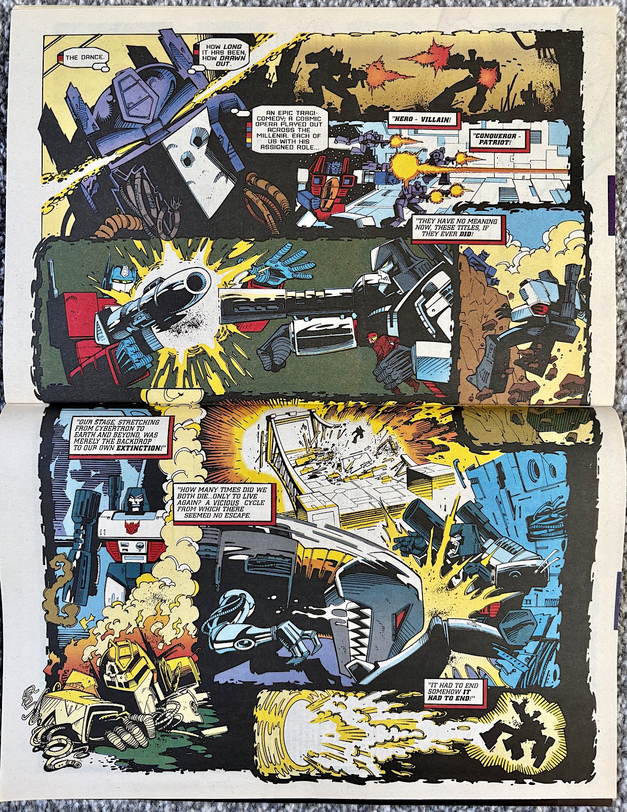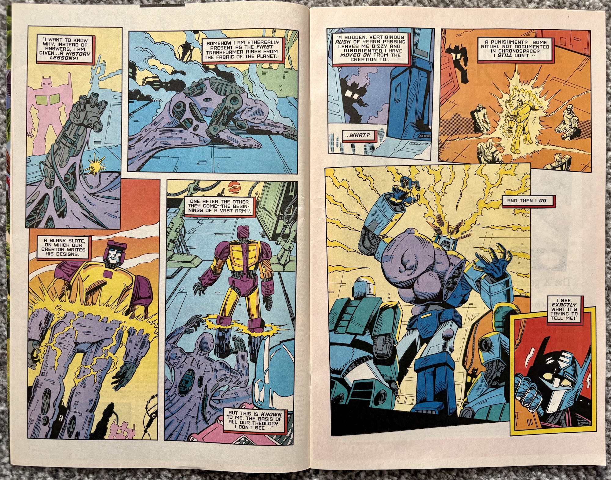All of these thoughts are interesting enough but it’s how they’re presented that really grabbed me. I’m positive readers at the time loved these next few pages just as much and I know fans reading them here for the first time will feel exactly the same. Beginning with a double-page spread presented in landscape format, Prime’s thoughts trace back over specific key moments from the seven-plus years of the original comic.