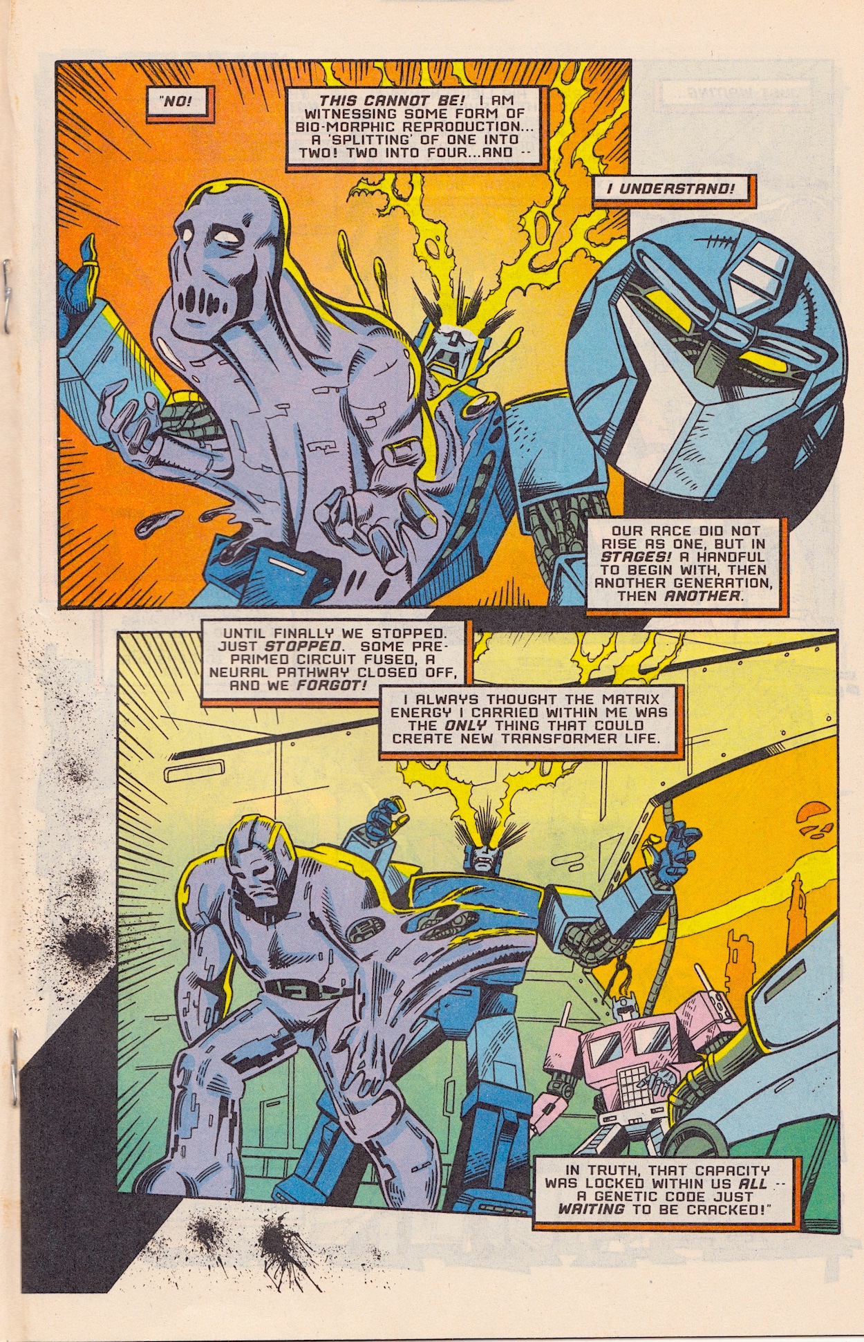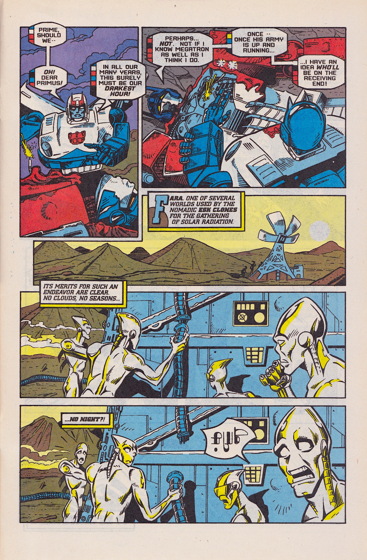 Tales of Earth continues as the backup strip and, while not an awful lot happens in part four, what it does contain are a few pages that are my absolute favourite of the whole issue, perhaps of the whole Generation 2 series so far. As Optimus Prime lies on an operating table getting slowly mended by medical drones, his thoughts wonder.