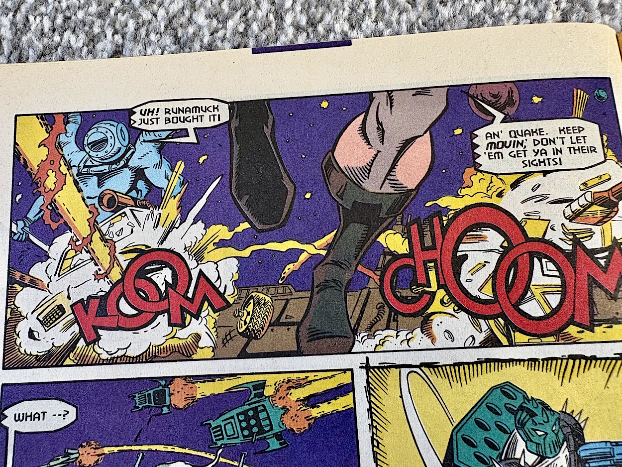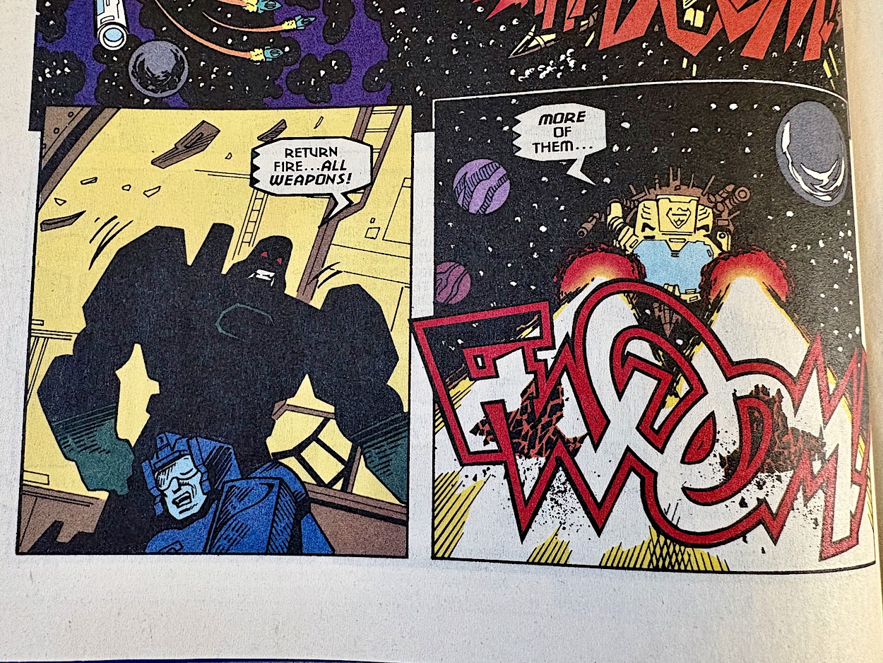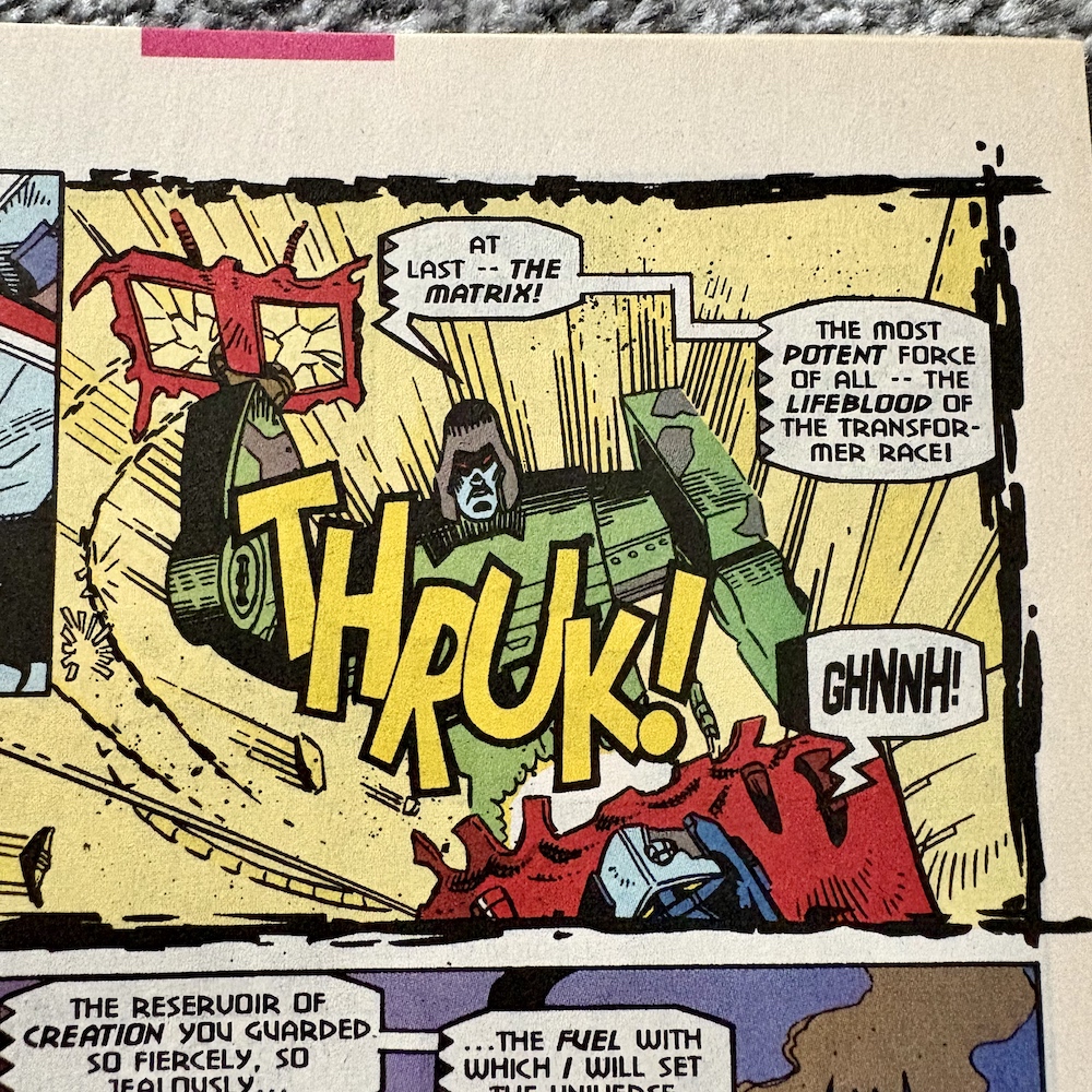 This has echoes of the Autobot Ark being boarded by Megatron and his army right back at the very beginning of the G1 comic, which adds to the dramatic outcome and the shock felt with the deaths of so many long-standing characters. Manny’s art is superb, even if an acid “drop” in zero gravity makes no sense. In the end, Megatron takes the fight to Jhiaxus… and subsequently gets seven shades of grey and green smacked out of him, as per the cover.
