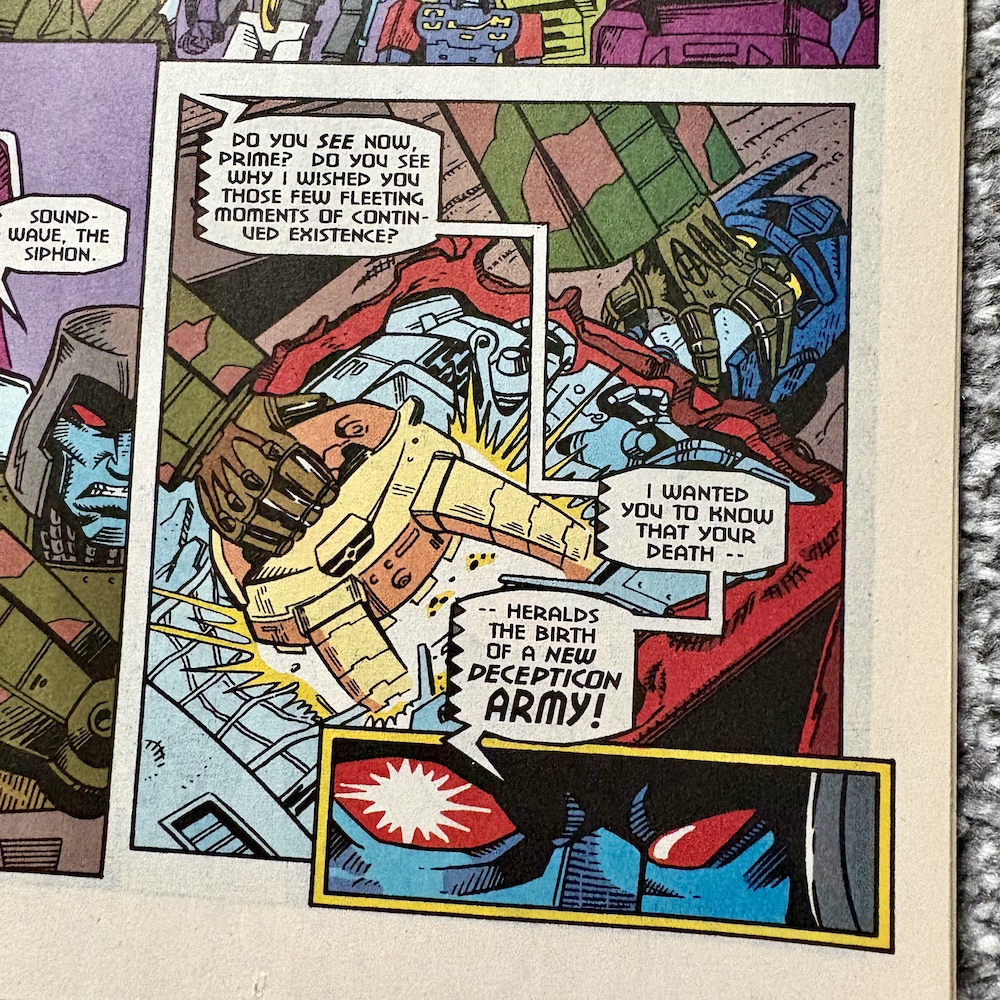 That’s a bit harsh of Megatron shouting “Death to the Pretenders!” so close to Fangry and Stranglehold, though. Not really, it’s a funny little in-joke and at least Octopunch in the bottom-right corner stops himself from inadvertently referring to his former boss! This sort of build up is something we saw a few times over the course of the epic first generation comic, which makes what happens next all the more shocking.
