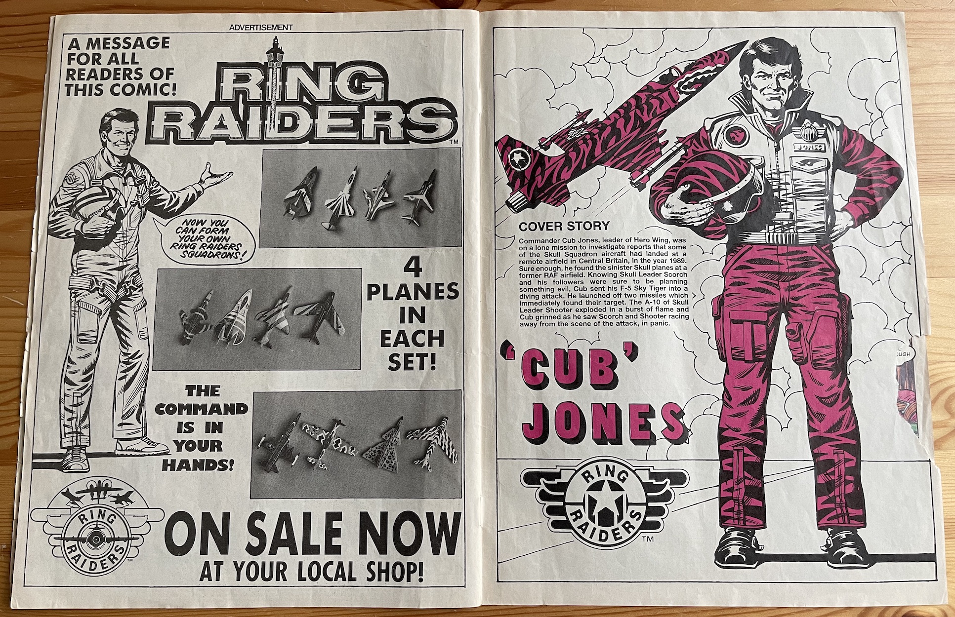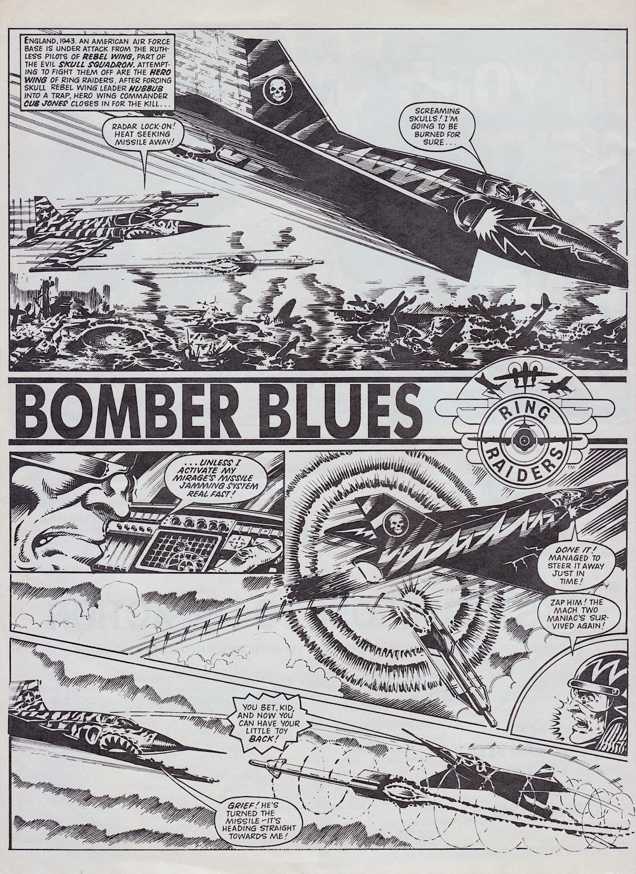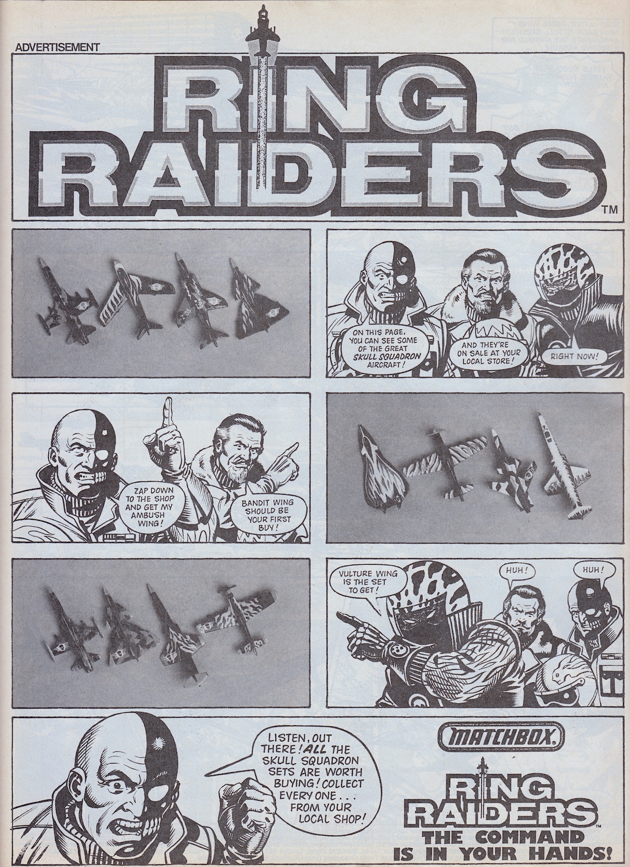This issue’s advert hasn’t got much in the way of original art this time that’s for sure, just a tiny F-9 ‘Sky Tiger’ taken from Bomber Blues. But what it does contain is a lot of memories. Looking back at this I’m thinking, “Oh I had that, and that, and that!” In fact, I had everything shown here! Well, except my Battle Blaster was a Ring Raiders model and not the Skull Squadron one.