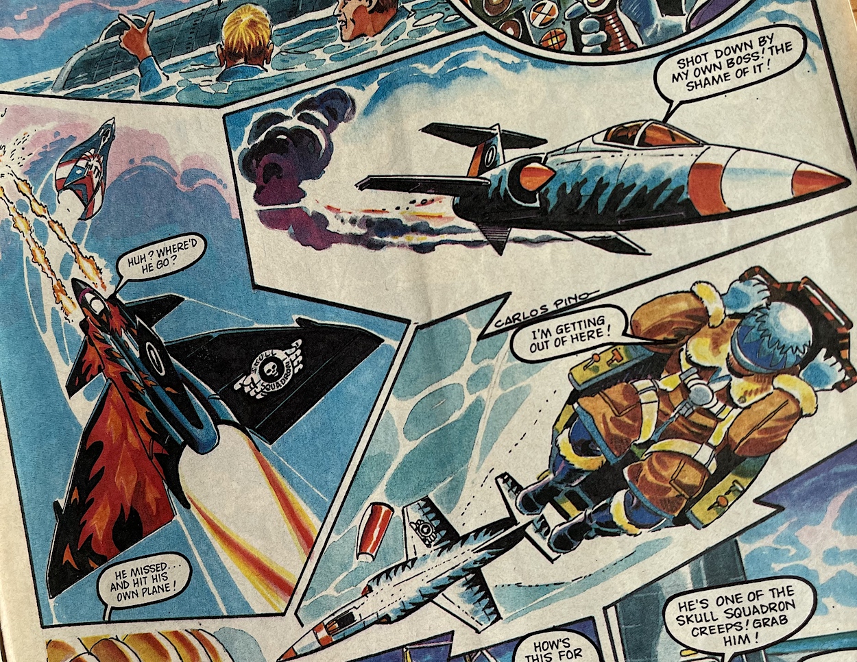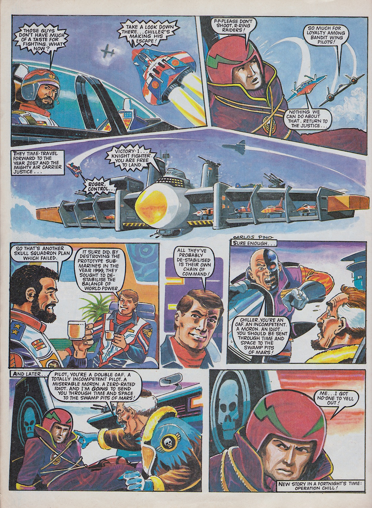 Carlos Pino‘s work has been colourful and fun throughout, perfectly suiting the fast action script and bringing the comedic moments in the air to life. But in this final part there’s something of an anomaly. Chiller’s wingman just doesn’t look right, does he? It’s a mystery, the answers lost in the mysts of time that were the late 80s, but it looks like he’s been altered after the fact. Perhaps the wrong character was drawn originally?