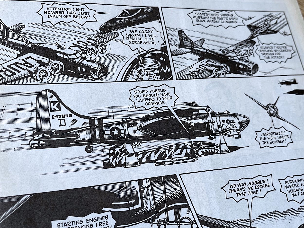 After Ring Raiders was cancelled the new year brought a new partwork to my newsagents called simply Airplane and I collected the first handful of issues. My interest was in no small part thanks to how the comic would treat these fantastical airplanes in as real a way as possible, always referencing them by their proper code numbers and names, and then there were historical scenes like these and other real world conflicts. A new series of pin-ups next issue heightened my enthusiasm too. I’ll talk more about that next time, but for now just look at those final few panels, making the transition from Vietnam to the world of the Skull Squadron via the different aircraft Hubbub used. Beautiful imagery to end an engaging and fun little story with surprising depth.
