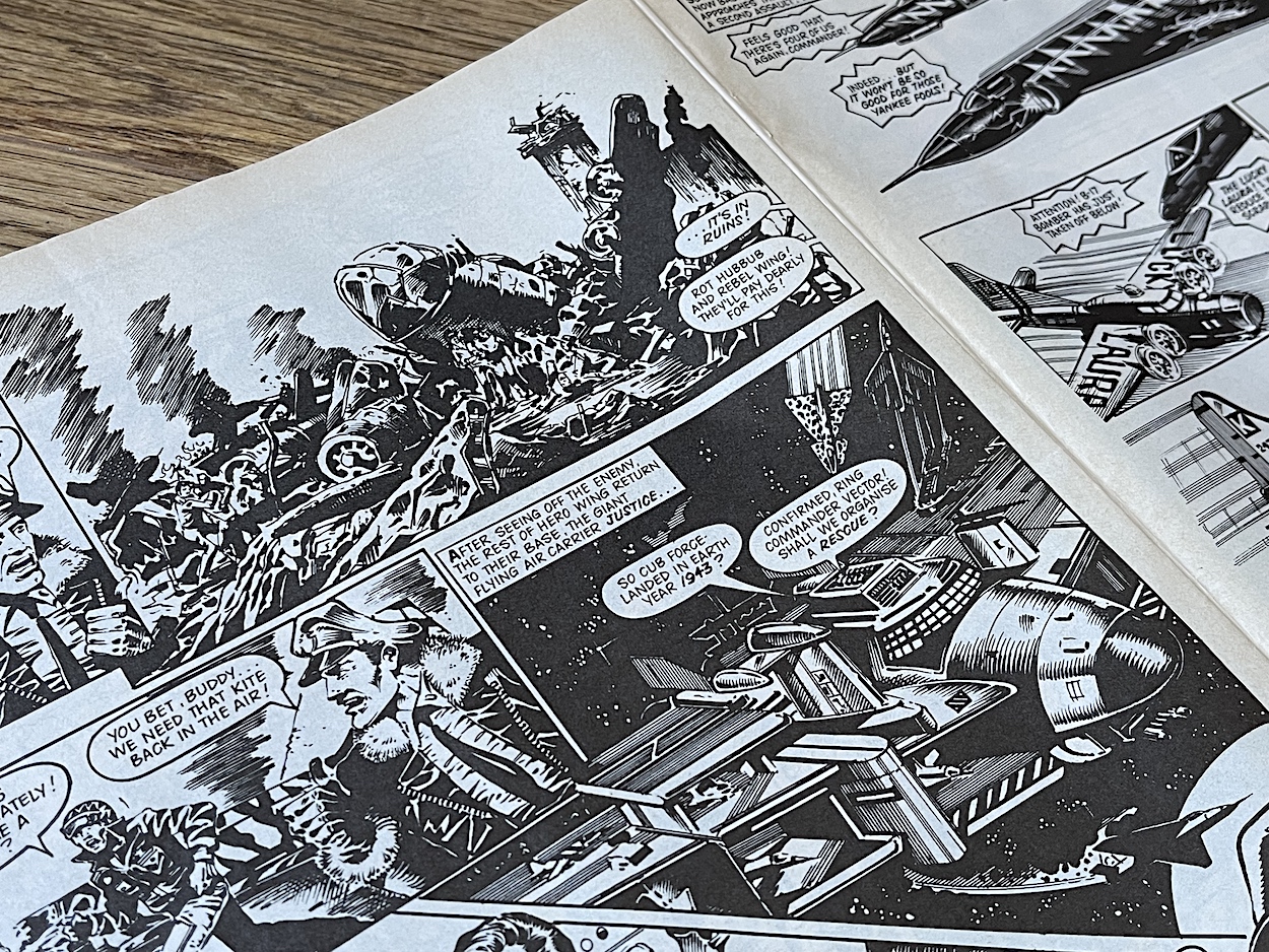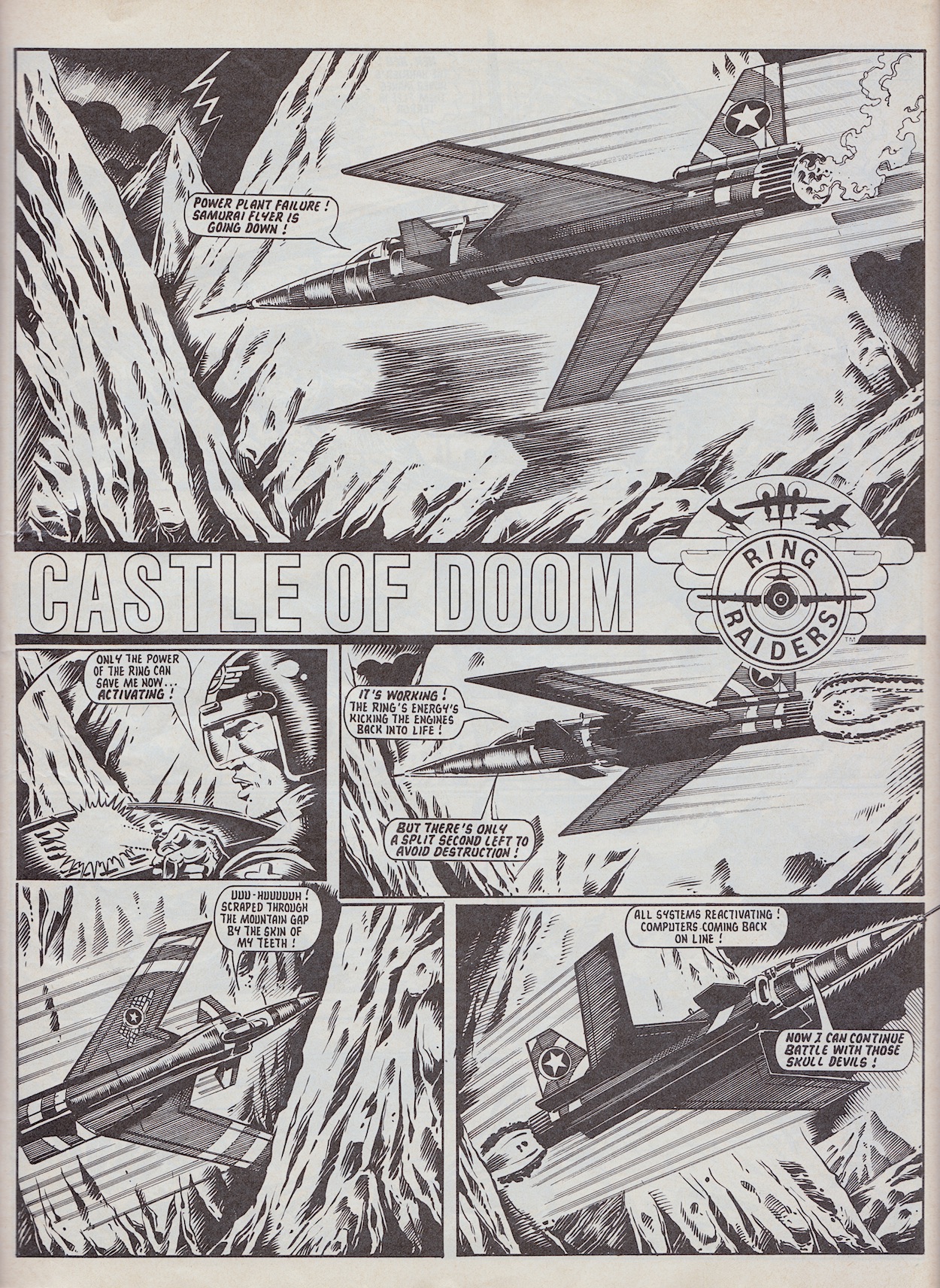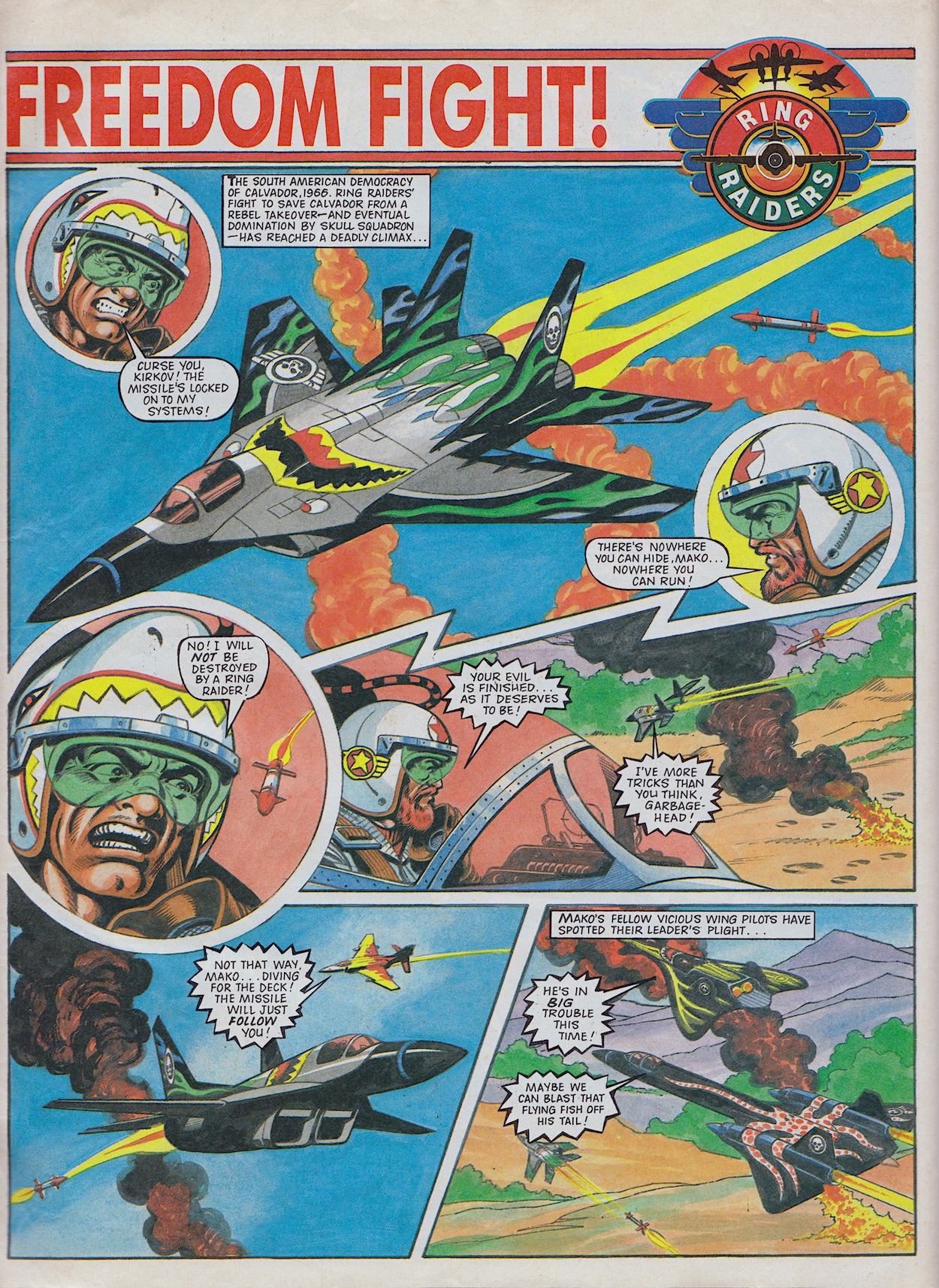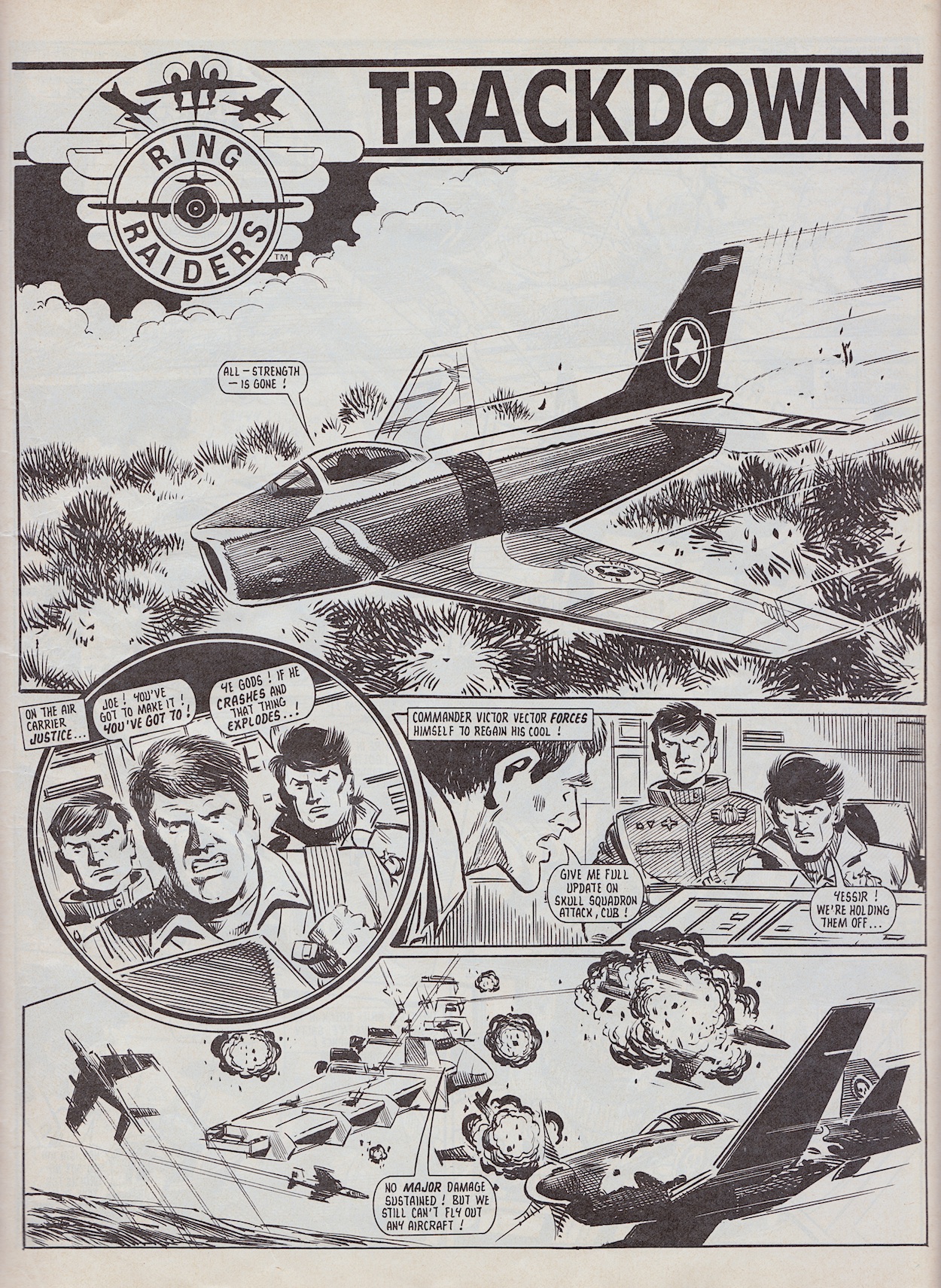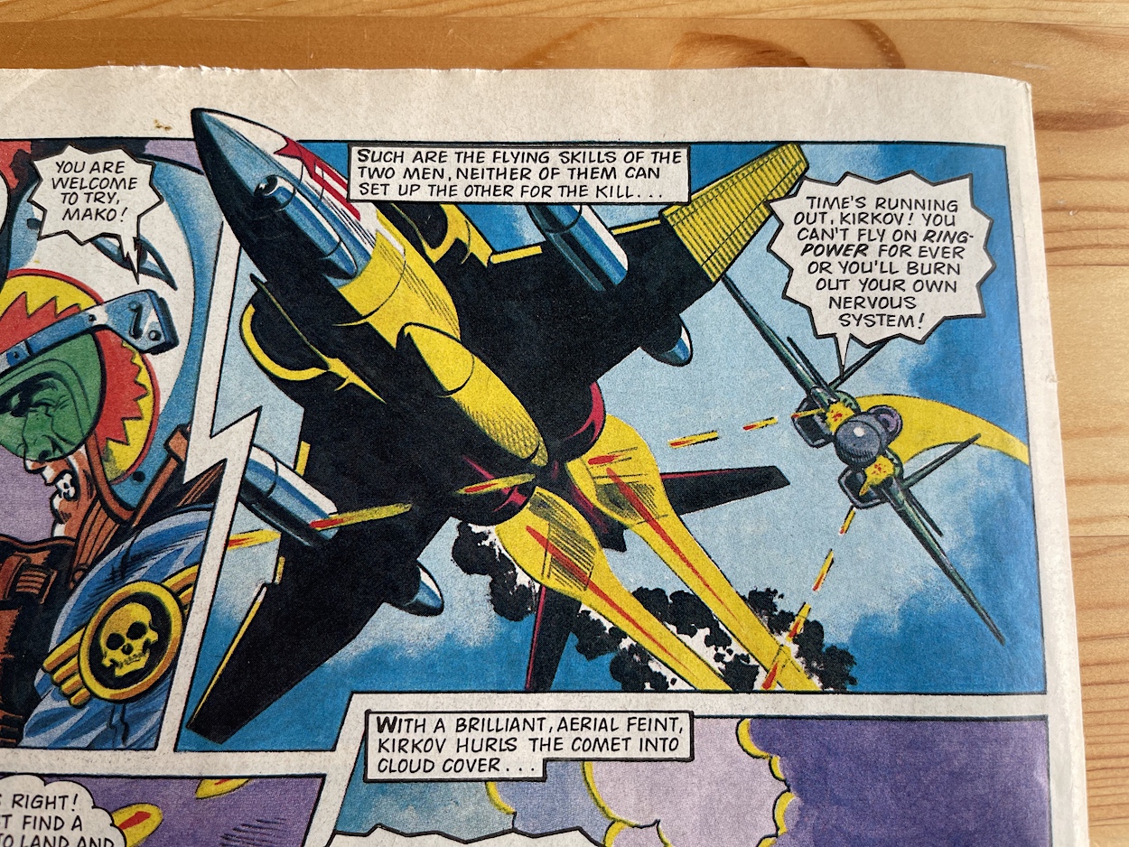 How amazing was this scenario for young comics fans? Ring Raiders deserved a much larger audience than it got in the end because this was top comic action with or without the licence. But as a fan of the toys this was the most amazing thing I’d ever read in my young life as far as I was concerned. (We love hyperbole as kids.) It was a story I’d replay with my Matchbox planes over and over. I think I even created a tiny biplane out of Lego so it could be cut in half, that’s how much I loved this.