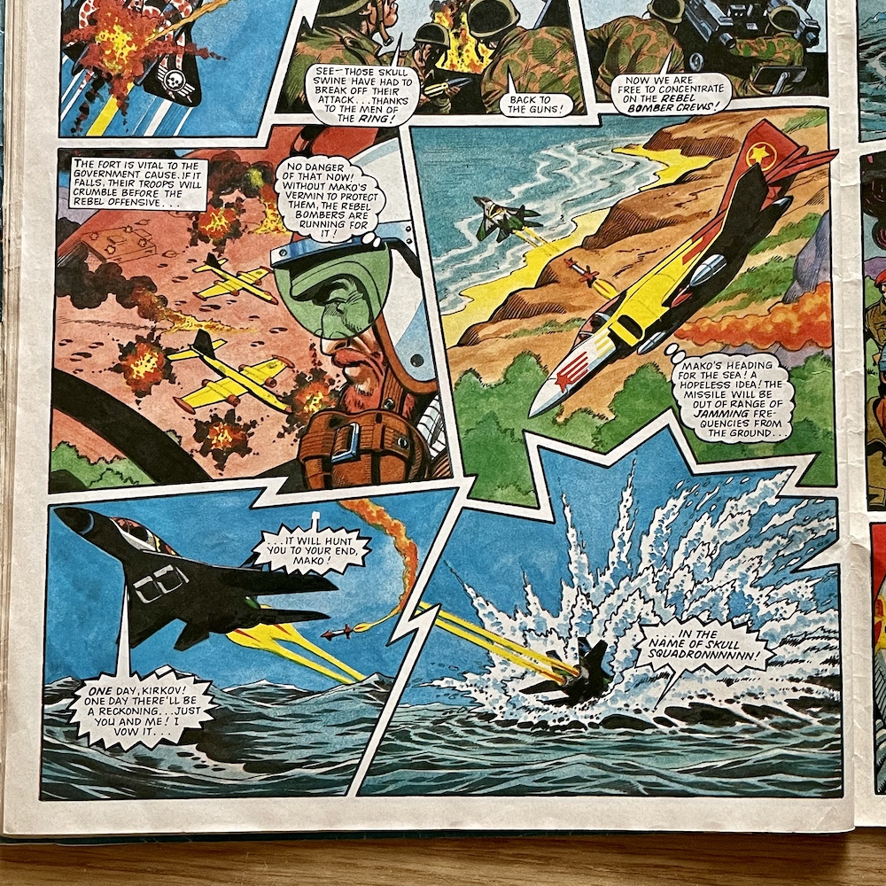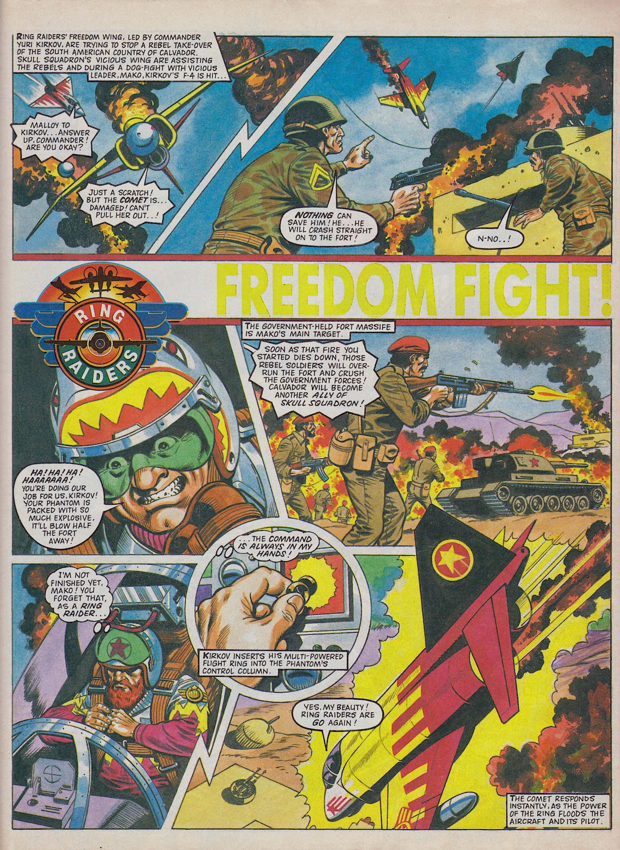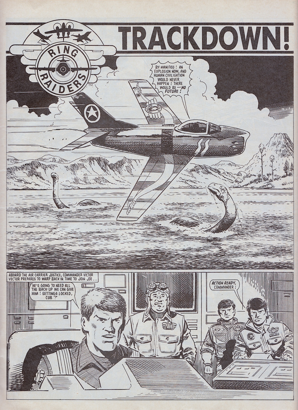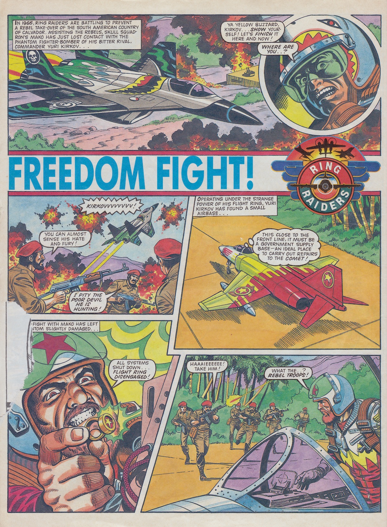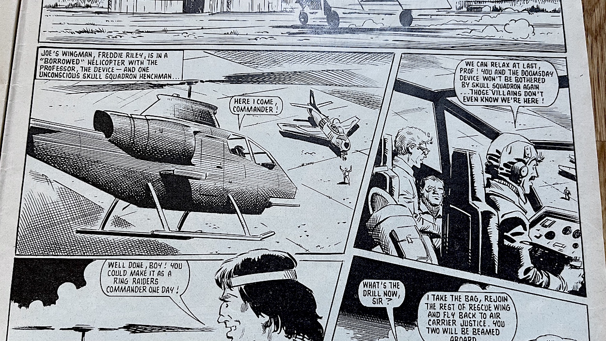 How amazing was this scenario for young comics fans? Ring Raiders deserved a much larger audience than it got in the end because this was top comic action with or without the licence. But as a fan of the toys this was the most amazing thing I’d ever read in my young life as far as I was concerned. (We love hyperbole as kids.) It was a story I’d replay with my Matchbox planes over and over. I think I even created a tiny biplane out of Lego so it could be cut in half, that’s how much I loved this.