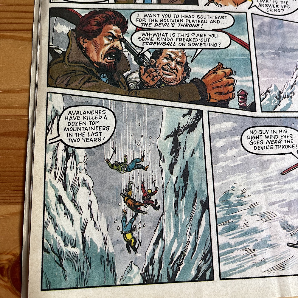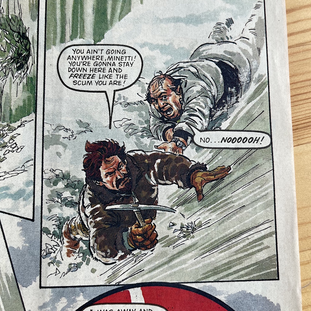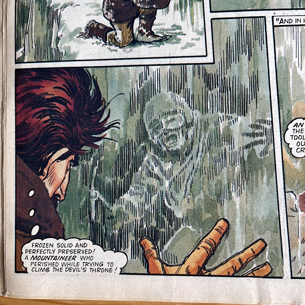 John Gillat‘s art certainly sent a shiver down my spine when I first read this back in 1989. It was the most adult tale the comic would produce in its short life and cemented Chiller as the best villain and the most defined. It looks like the Devil’s Throne is going to encase him and the criminal who hired him until he sees a mountain climber, dead and perfectly preserved in the ice. Chipping away with his knife for a long time he lets the smuggler (whose leg broke in their fall into a newly opened crevasse) tell him what he needs to do to lift him out.