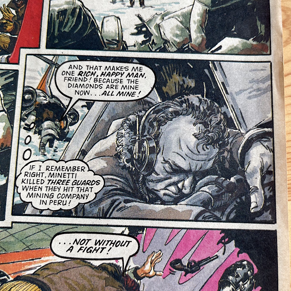 Leaving with the diamonds, when he was approached to join Skull Squadron he helped fund their efforts and I’m sure they welcomed him, given how his appearances seem to be amassing the biggest death toll in the whole comic. In addition, though it isn’t confirmed, the way he berates the American makes me think he’s actually British. Given his dress sense I think this could very well be the case and I hear a British accent every time I read his stories. A brilliant character.