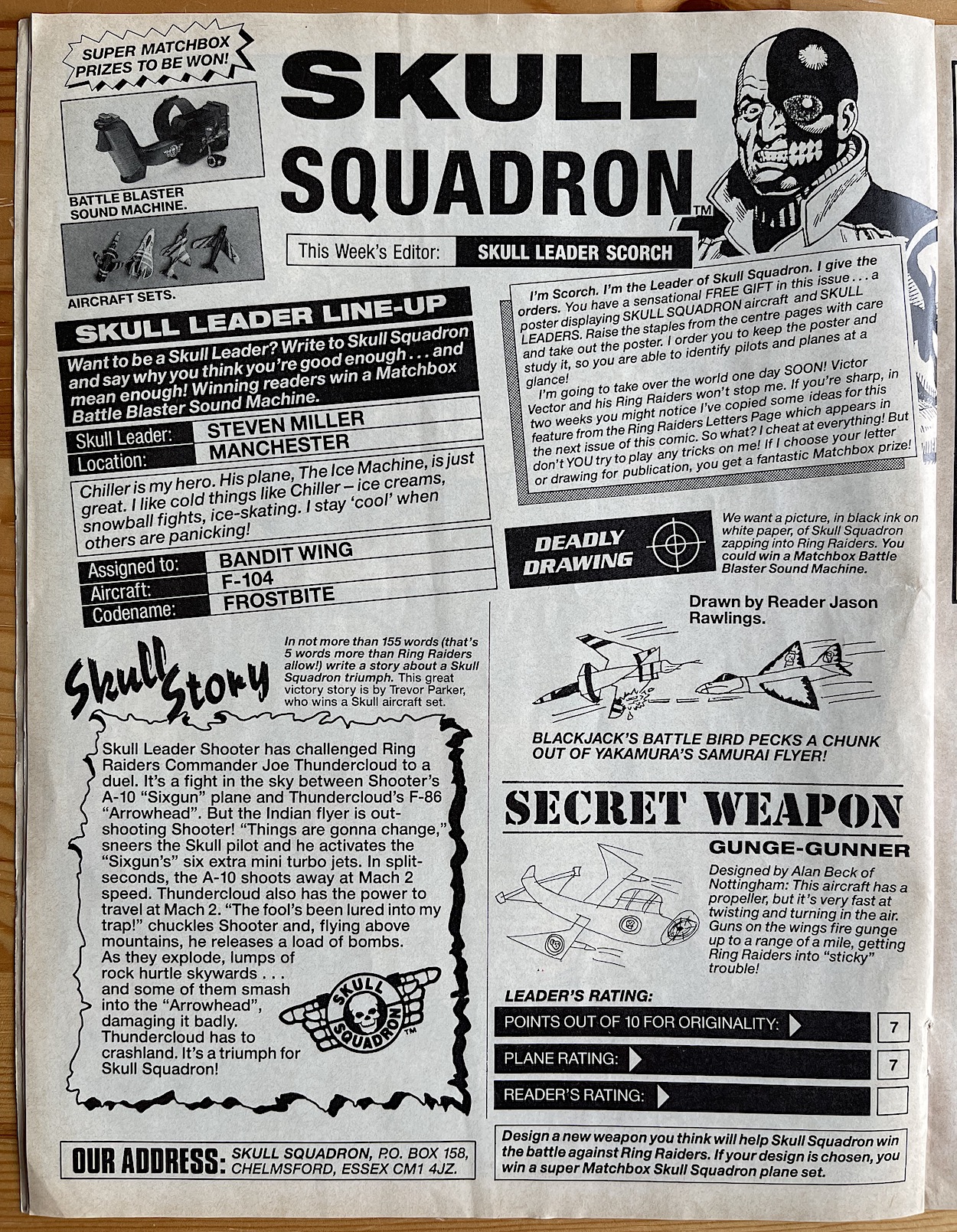 The Skull Squadron weren’t just the stars of the letters page, they also had a full page advert all to themselves. With illustrations by Sandy James and some rather lacklustre toy photographs, it was still enough to elicit excitement for the upcoming Christmas season in this young reader. With my birthday four days before Christmas Day it was a bumper Matchbox festive season so these adverts were all hype to me, tying these tiny planes into the characters from my new favourite comic.