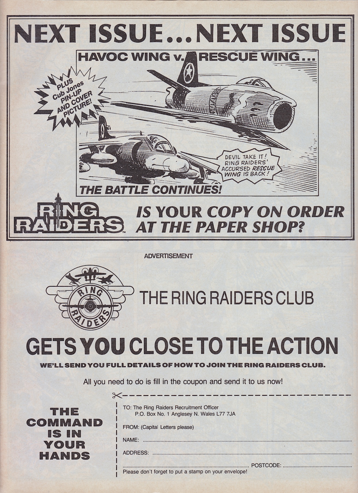 Just below this is a coupon for The Ring Raiders Club. This was just a preliminary coupon to show interest, a bit like when we sign up for updates on new websites or Kickstarters today. When the final issue of the comic arrived I was desperate for more Ring Raiders action and sent off my own coupon but I never heard anything back. With a different address to the comic this wasn’t a Fleetway club and in fact I’m unsure who was actually planning it, but unfortunately it looks like it never took off (ba-doom-tish).