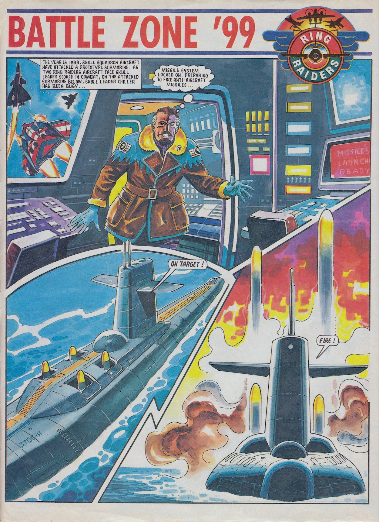 In part two of Barrie Tomlinson‘s Battle Zone ’99 the remaining gravity-powered submarine is still under attack, as part of Skull’s aim to destabilise the governments of the world. This is a vital part of their overall goal of assuming control through a mix of all-out warfare and covert operations. Here, dozens are already dead but while trying to fire upon the sub Skull Leader Scorch accidentally damages Chiller’s F-104 ‘Ice Machine’ when Ring Commander Vector expertly dodges an attack, forcing his comrade to eject and abandon his craft to the waters below.