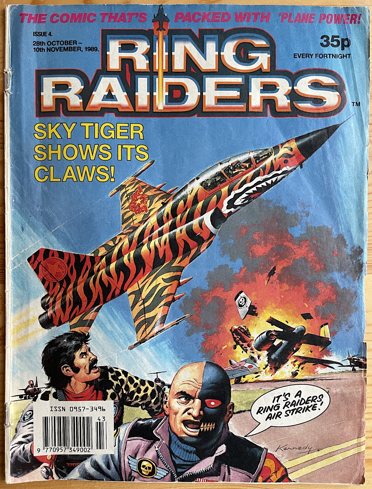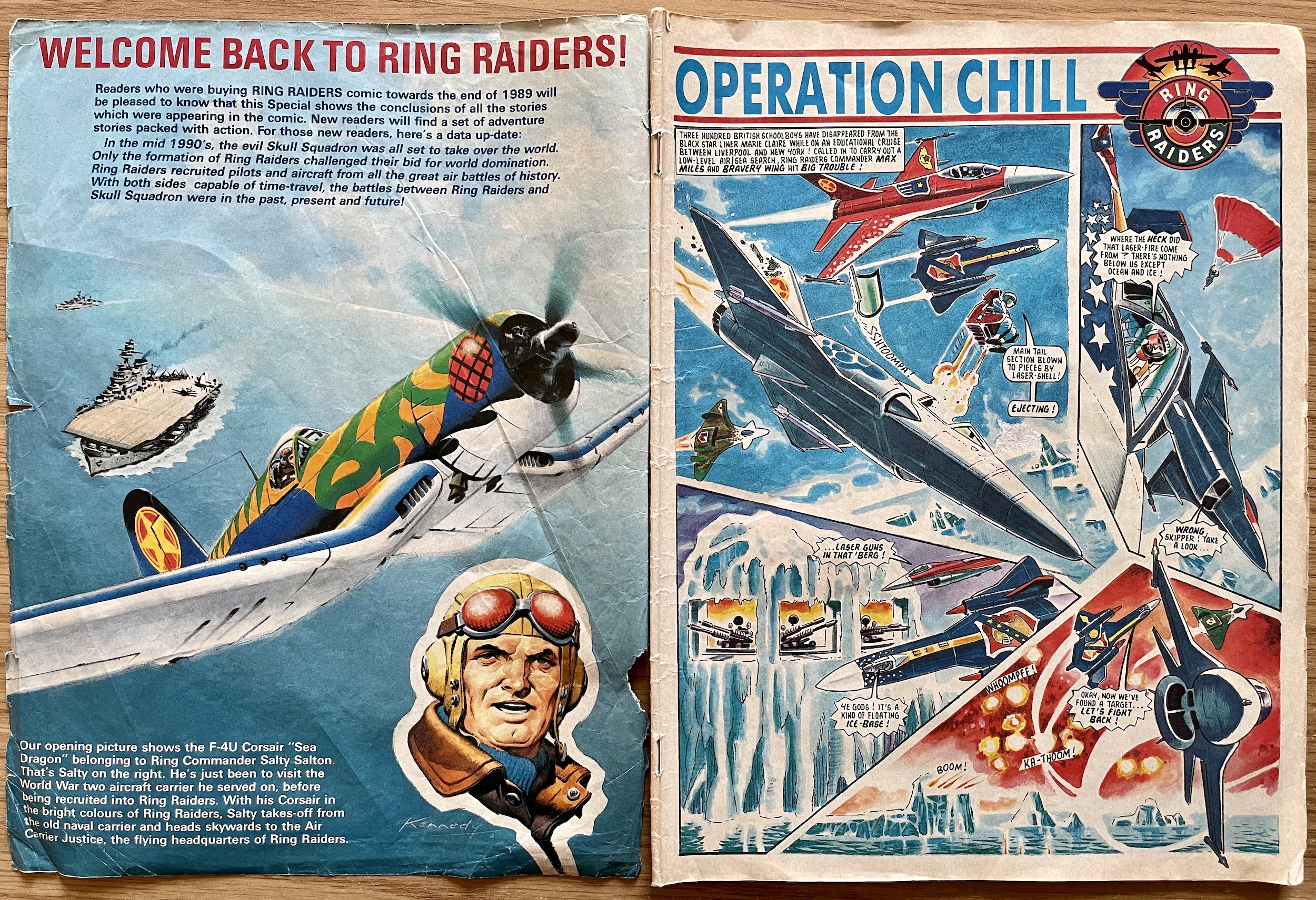 When editor Barrie Tomlinson gave us the bad news that #6 of Fleetway‘s Ring Raiders was to be the last, he told us they hoped to produce a special the following year to finish off all the stories frustratingly left on cliffhangers. Given how comic specials usually appeared in April or May, and the fact I didn’t know if it’d even be published, you can imagine my surprise when my parents came back from the shops with this some time in February of 1990. With its gorgeous Ian Kennedy cover and a hefty weight to it, I immediately ran to my room where all my planes and bases could be found.
