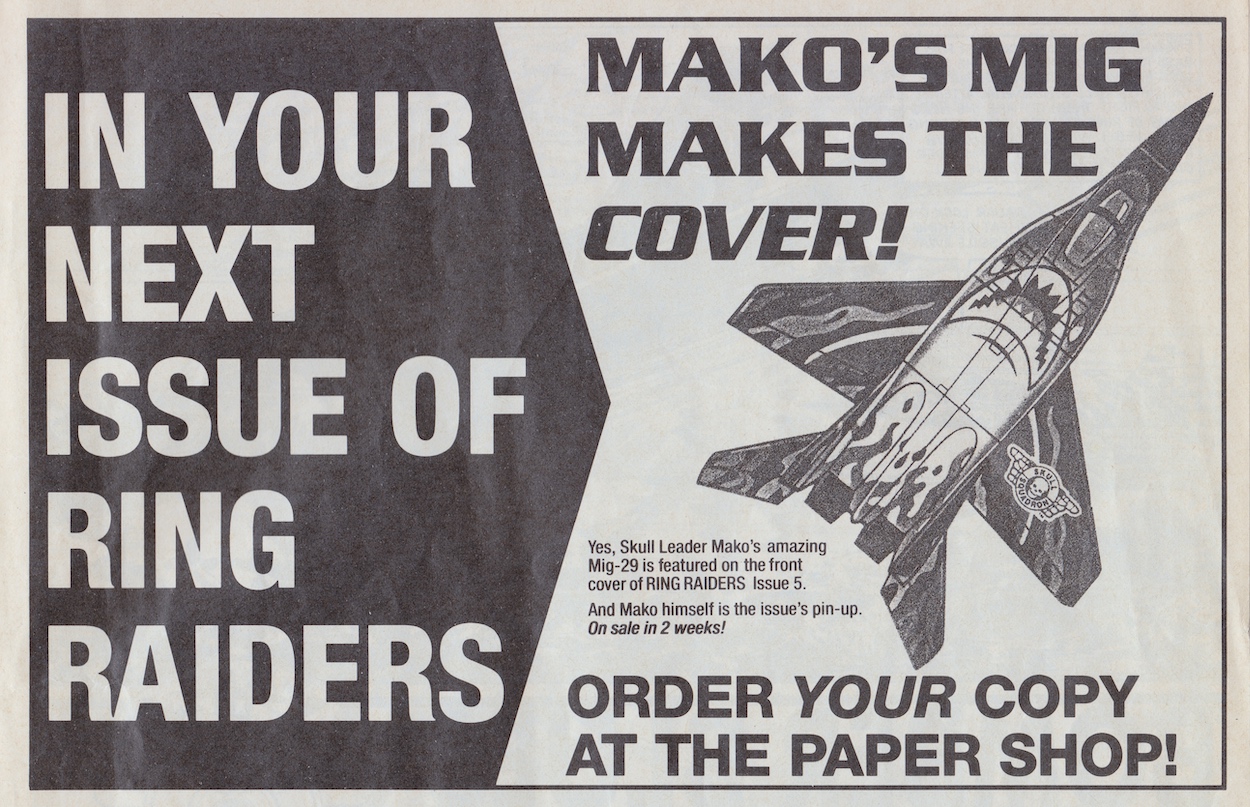 After the letters page the Next Issue promo feels retro even for this 1989 comic. Featuring a biplane, a big banner to the left and a headline along the wings of the plane, it reminds me of what Barrie might have used to promote an issue of Battle for example and I love it! If the Ring Raiders toys had been more successful I honestly believe this comic could easily have been seen as a modern, high-tech version of those classic war comics. It certainly had the writing and artistic talent for it.