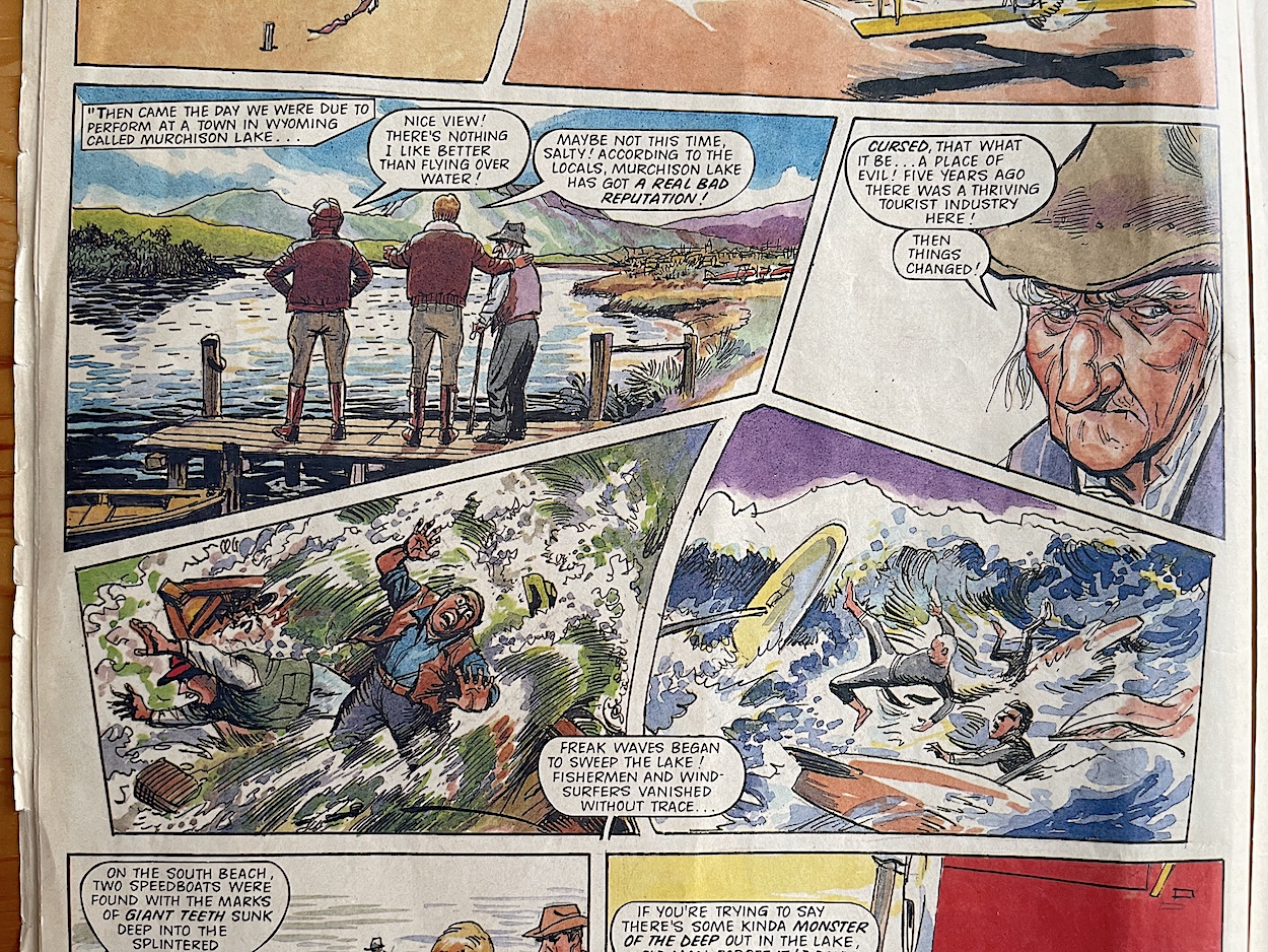 After being freaked out by a set of clockwork toy teeth in the dining hall of the Air Carrier Justice, Salty relates a story of the death of one of his stunt partners. Due to perform low-level aerobatics over the idyllic Murchison Lake in Wyoming, a local tells Salty of missing people, dead bodies on the shore and giant teeth marks on the sides of sunken boats. Not believing any of it, Salty watches in disbelief as one of his best friends flies behind an island in the lake and, instead of pulling up to do his stunt, his plane explodes while he’s out of sight.