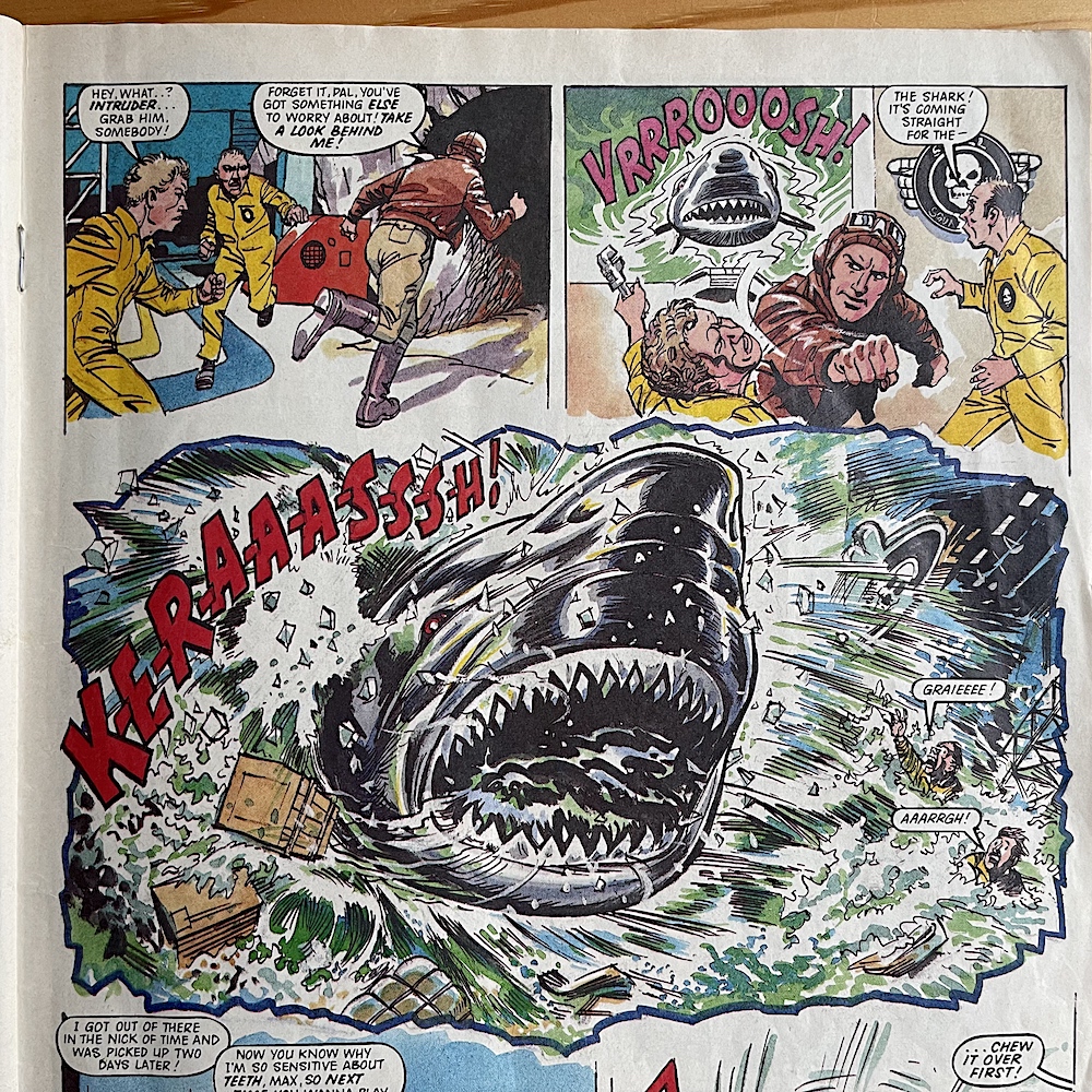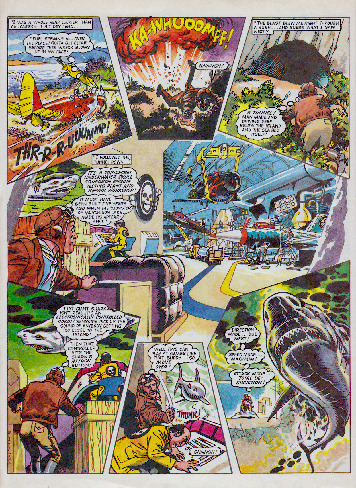 Crashing on the island and noticing a manmade cave entrance, Salty soon discovers a secret Skull Squadron base under the lake and a control centre for a huge robotic shark, used to terrify locals into staying away. This is all revealed through this wonderful panel arrangement above, the lair taking up the middle of the page while the story plays out around it. What a wonderful design and a fun way to tell the story as Salty programmes the shark to home in on the base and crash through the observation window, flooding everything. Below is part of the final page of the story and this is where that important word above comes in.