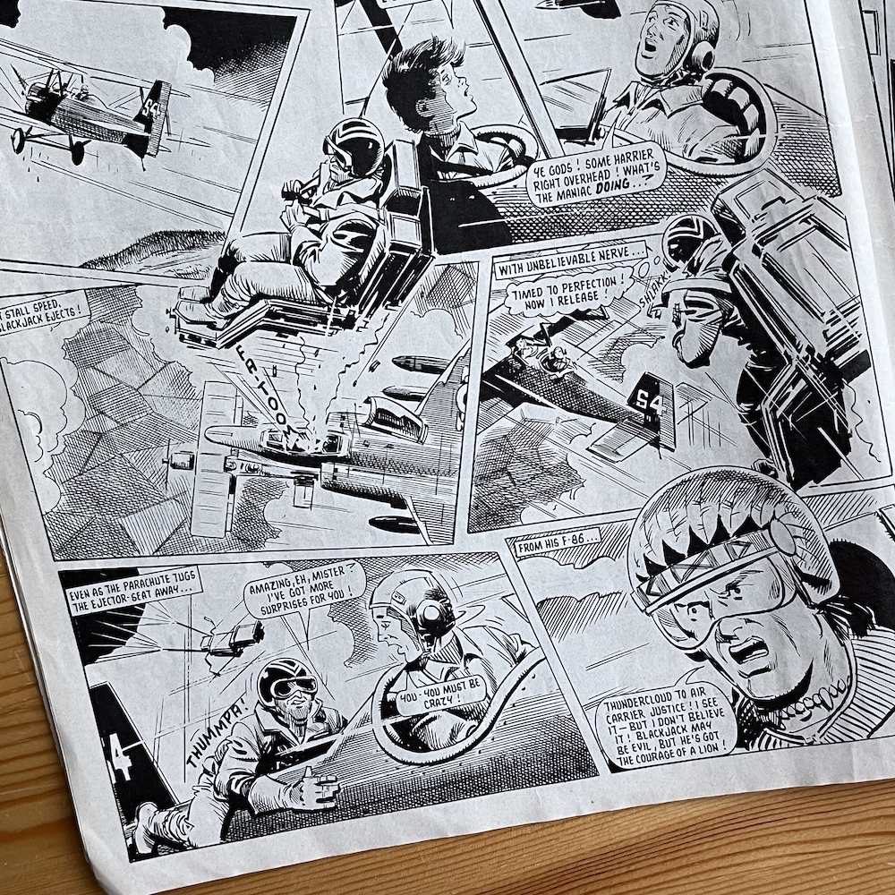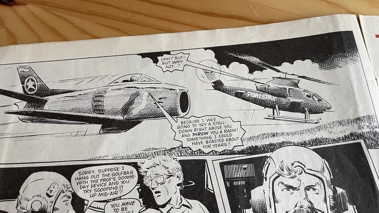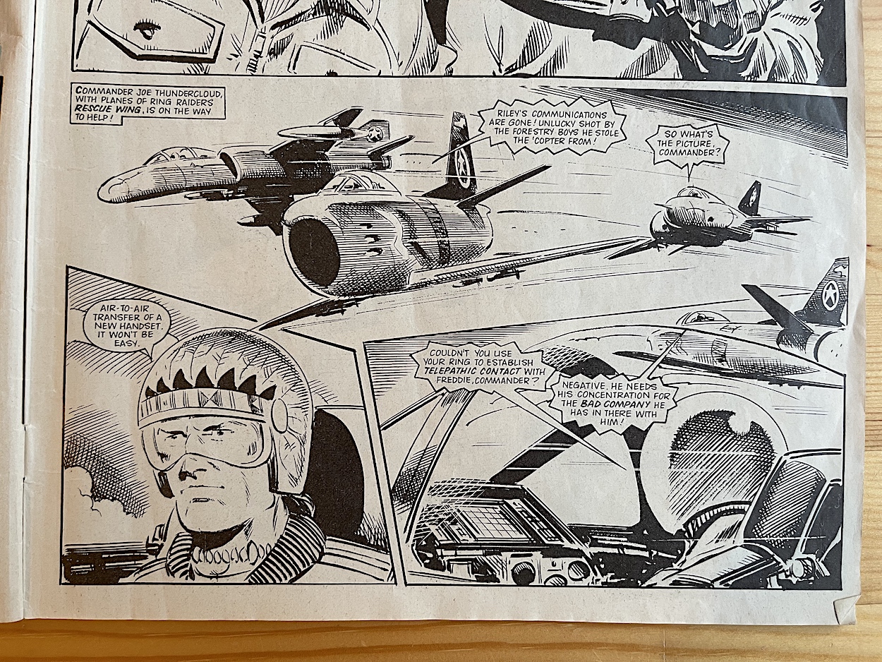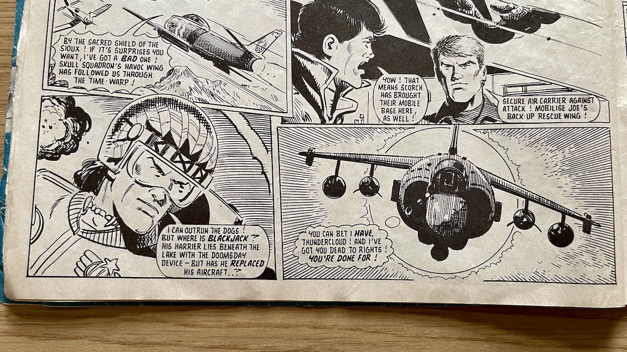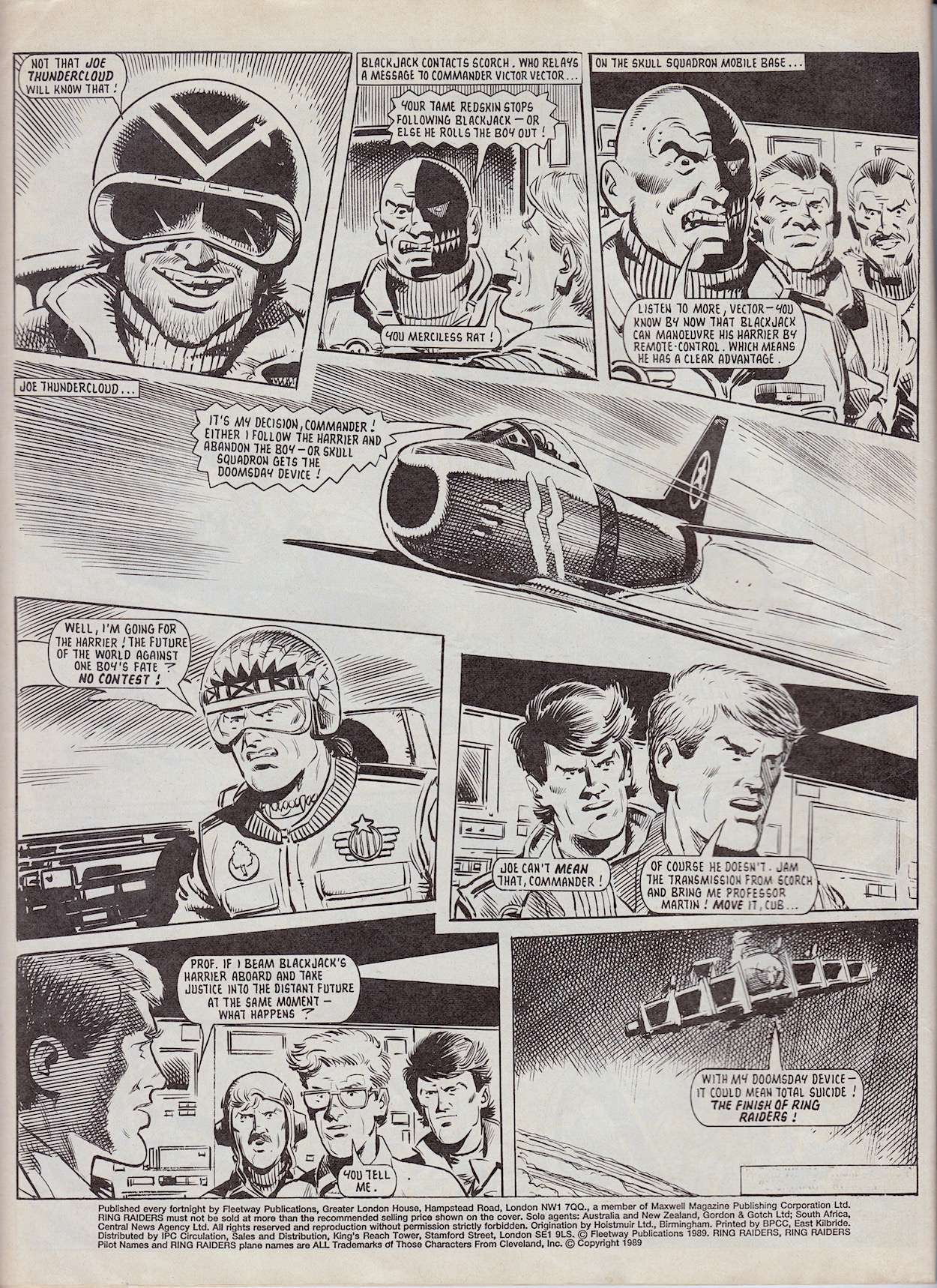 In fact, the very first part here (which we’d have enjoyed in #7) would’ve sealed the deal for Ring Raiders as one of the very best action adventure comics in the UK. The Doomsday Device is on its way back to Skull Squadron in Blackjack’s auto-piloted Harrier while he’s taken a young boy hostage in a biplane, threatening to throw him out. Wing Commander Joe Thundercloud of Rescue Wing can only chase one, but which one? Much to Blackjack’s surprise he takes off after the Harrier, or so it seems.