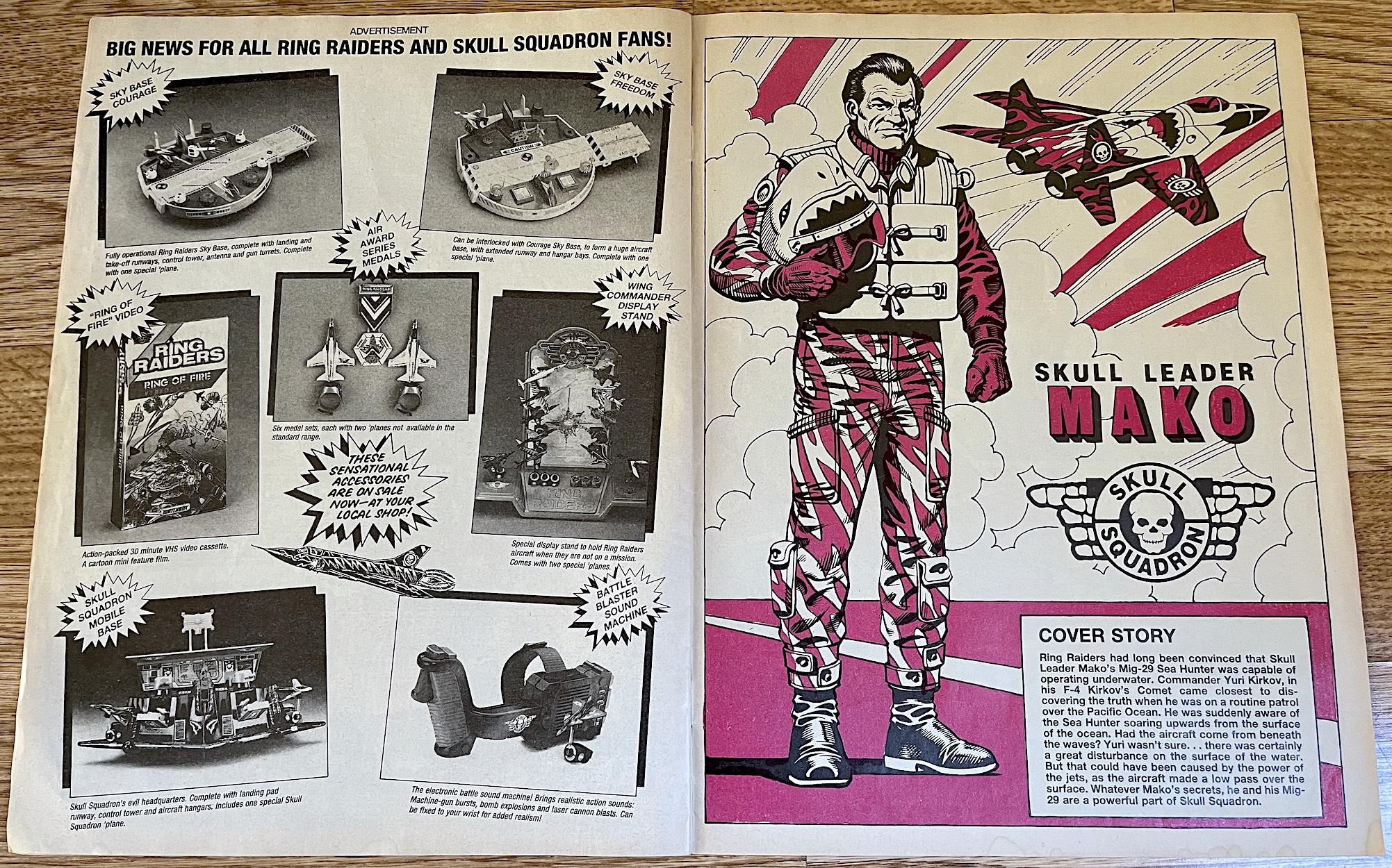 Being the only issue I somehow lost between childhood and bloghood this cost me a pretty penny a few years back but it was worth it to have the complete collection again. The superb Ian Kennedy cover featuring my favourite Skull Squadron aircraft, Skull Leader Mako‘s Mig-29 ‘Sea Hunter’ certainly softened the blow to the bank balance. Regular readers may wonder why the question on the cover is being posed when we’ve already seen the answer in #2, but that was a secret for the readers. As far as the Ring Raiders were concerned it was still unconfirmed and made Mako one to fear.