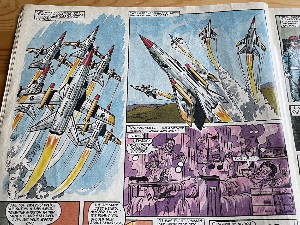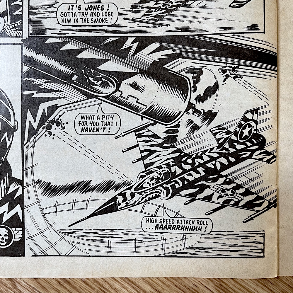 Was #7 meant to be the start of the comic recolouring the logo each issue? Or was it just for this special? Who knows? But clearly Ian had finished the next two covers and I think this inner page (likely #8’s cover) is just beautiful, evocative of the Commando covers he was so well known for but with a modern (for the time) splash of colour on the Corsair. Wonderful. You’ll have to excuse the state of the pages though. This is my original comic and it was read so many times back then, devoured over and over. The creases and tears tell a story though, of a much loved comic I couldn’t get enough of as a kid.