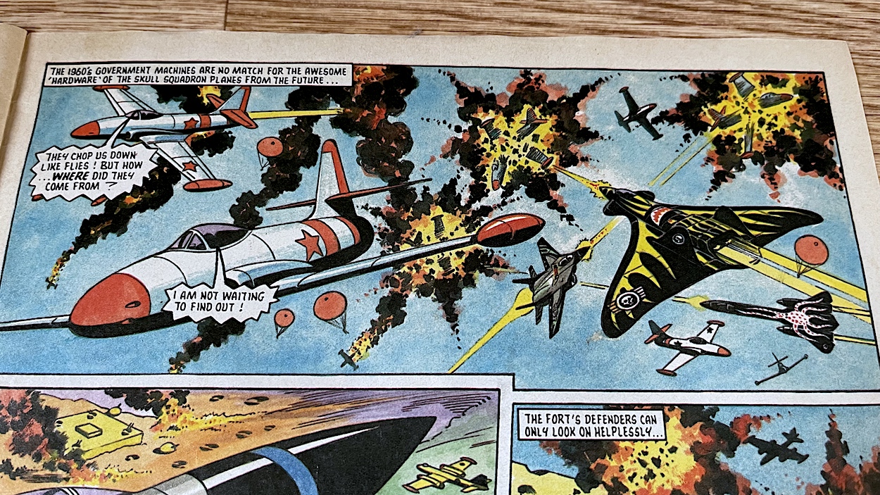 While readers had seen the base in the Trackdown strip we have to remember these are time travel stories and so, much like with Doctor Who for example, timelines can be presented out of order. Even though this takes place a few years after Trackdown in order of actual date, for the time travelling characters it occurred before it. This is when the Ring Raiders themselves first encountered Skull Squadron‘s new mobile HQ. Over time it would’ve been fun to piece together these events into a timeline.