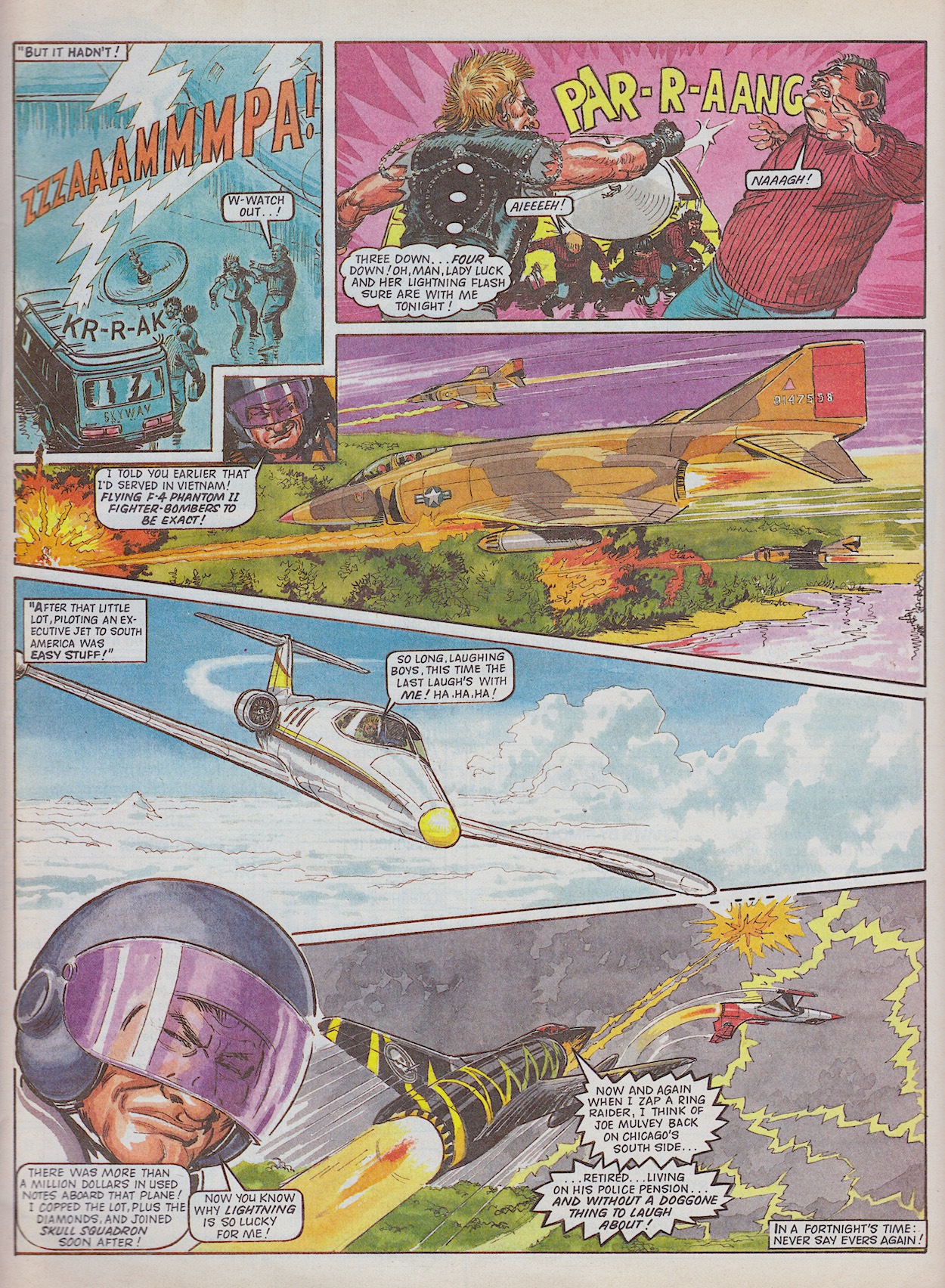 Scott Goodall‘s complete tale this issue focusses on the Skull star of the Bomber Blues serial, Hubbub the Skull Leader of Rebel Wing. We’ve seen him use his electronic weaponry in that story and here we learn of where his fascination with electricity’s power began. It all kicks off with this glorious splash page by Geoff Campion showing the kind of air battles only this comic could be capable of. The lightning, Vector’s stealth fighter powering into the scene, even another Harrier doing a daring manoeuvre with those vertical jets, it’s all there in one panel. Exciting stuff!