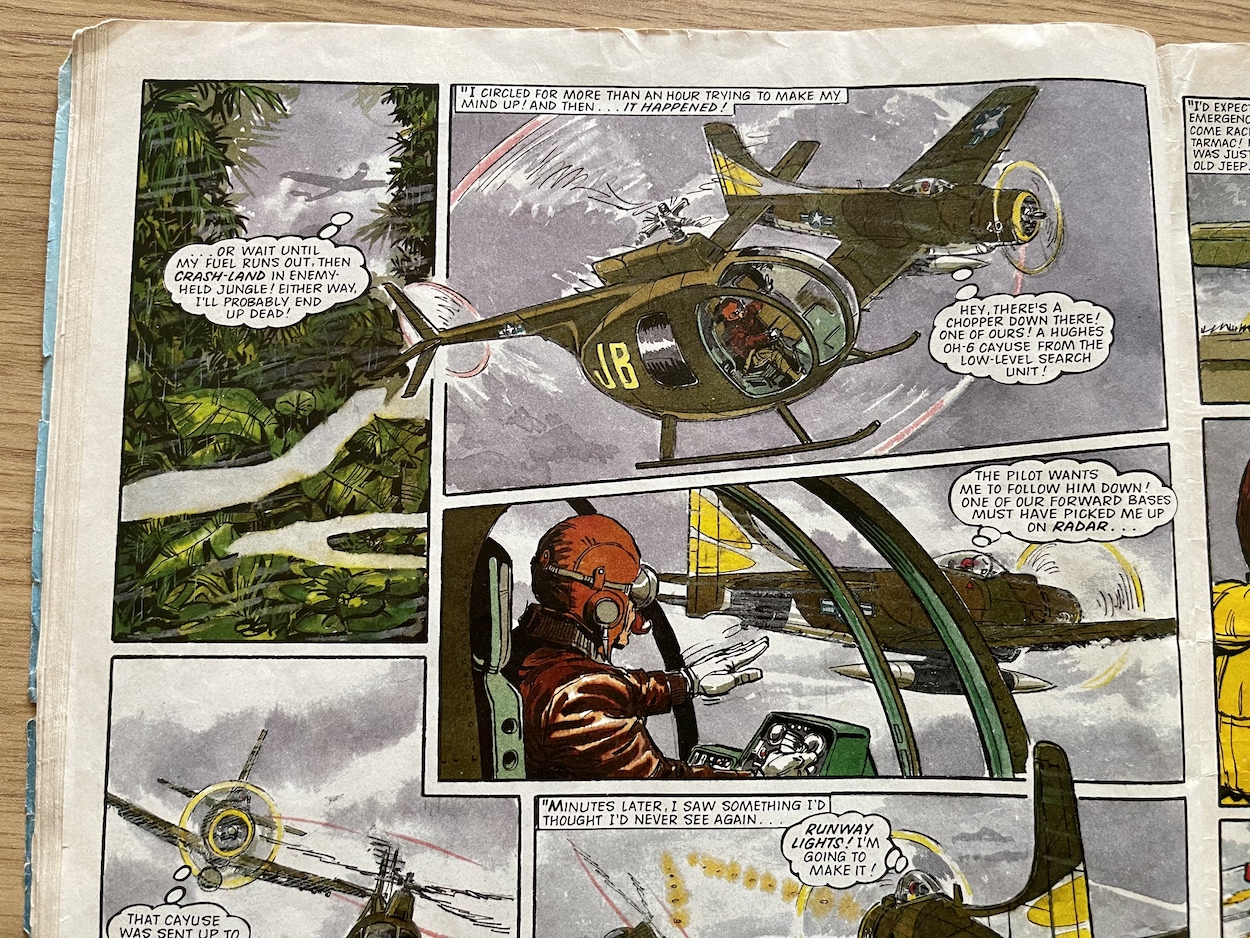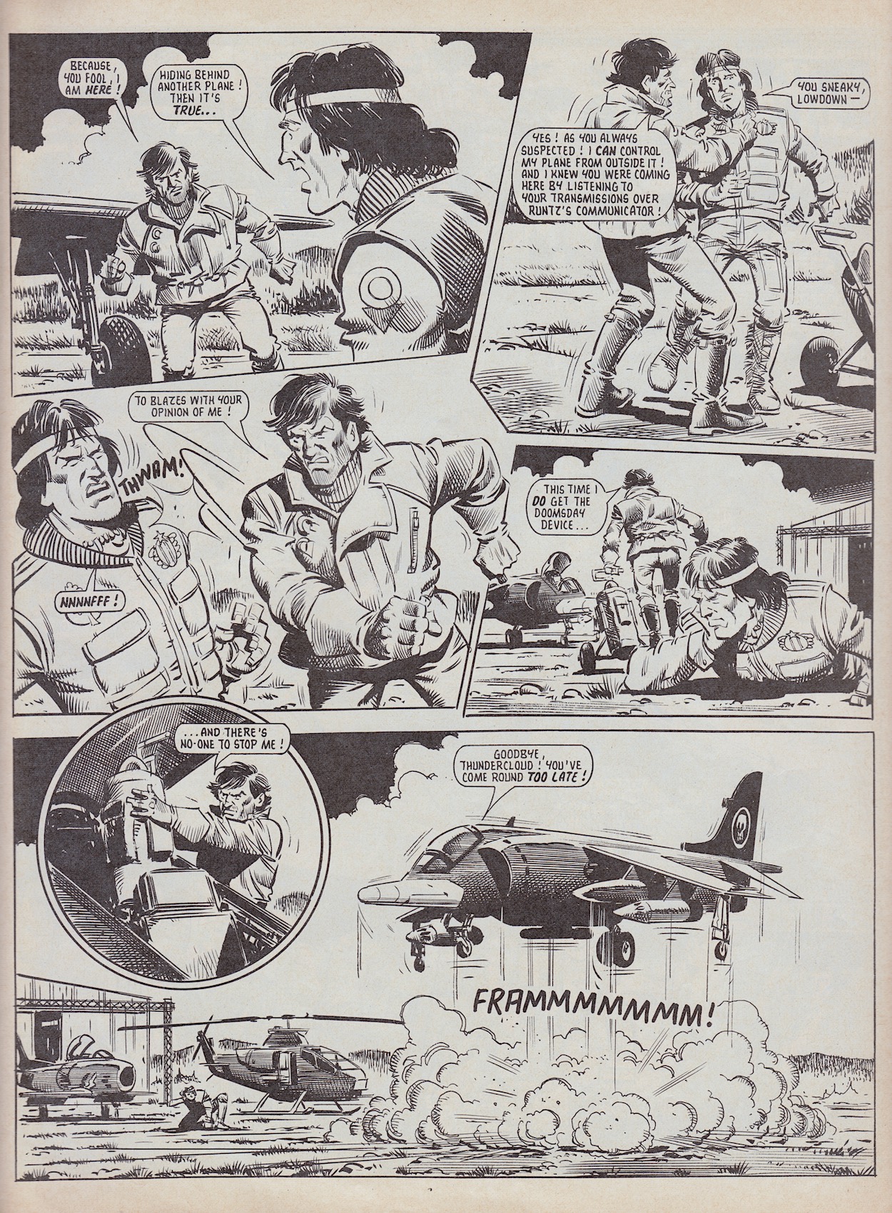 In the continuing Trackdown written by Angus Allan and illustrated by John Cooper it looks like Freddie Riley and the professor’s adventure is coming to an end as they approach Wing Commander Joe Thundercloud on a supposedly deserted airstrip, unaware Blackjack and his Harrier ‘Battle Bird’ lie in wait. The panels showing the Ranger helicopter and then Riley’s point of view feel like the camera (for want of a better word) has zoomed inside in one fluid movement. Just me? Well, that’s how it felt to me. John Cooper was certainly cinematic in his storytelling.