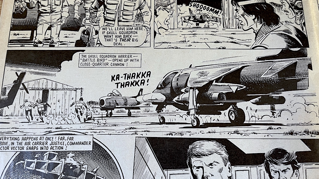 Part six of writer Angus Allan and artist John Cooper‘s Trackdown is our penultimate strip. Wing Commander Thundercloud is right on the tail of Skull Leader Blackjack, but can’t do anything except follow for fear of setting off the Doomsday Device if he opens fire. All the Skull pilot has to do is wait it out until he’s home free, but suddenly he dives and stands his Harrier jet on its nose! It’s a shocking move but in the end it shows how tactical Blackjack can be.