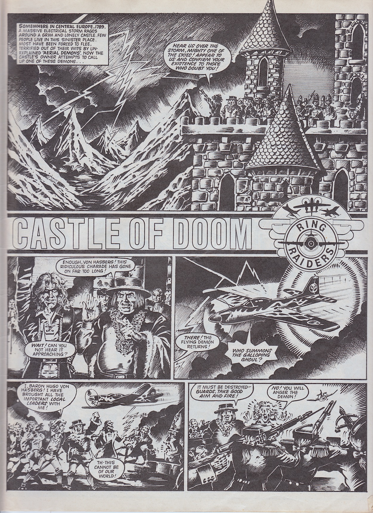 Set in 1789 it sets up a fascinating plot involving my two favourite characters. Wraither (from the cover) in his P51 Mustang ‘Galloping Ghoul’ appears in the skies over a hauntingly atmospheric castle proclaiming to be a sky demon. The owner of the castle is already a disciple of this winged deity, but the local mayor sees him as a threat. After Wraither fires upon him, pushing him over the edge of the castle wall (and over the cliff it’s perched atop) he turns on his hypnotising mind control ray, instructing the assembled masses that on this exact night two hundred years hence their descendants must rise up and assassinate every single person in the castle.
