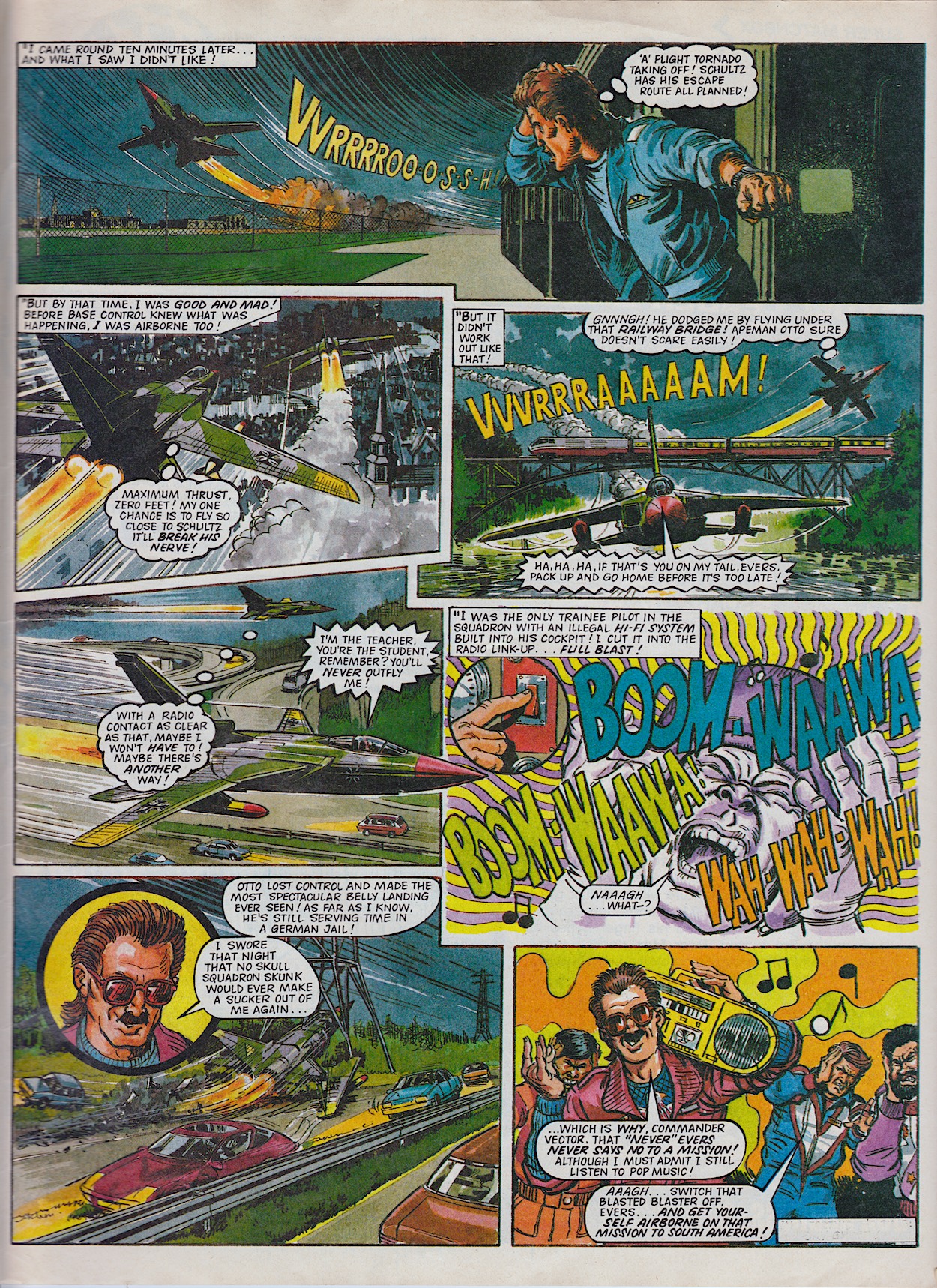 Now, Evers loves his rock and roll, especially playing it so loud he’d annoy everyone around him. His imprisonment takes place at the far end of the base in unoccupied accommodation which just happens to be beside NATO’s records department. In the end we find out the arrest was deliberate, his instructor is working for Skull Squadron. But when Evers’ hifi speakers blow a fuse and silence engulfs the area he hears a noise and discovers the theft of computer records in process. His instructor was using Evers’ relocation and his loud music to cover his tracks, you see.