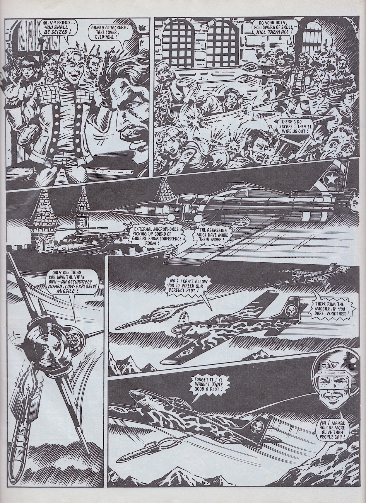 I joke, of course. The strip is packed full of action and plenty of twists and turns, the reader never quite sure who’s going to come out on top. If there’s one thing the comic had taught us already it was the good guys can get shot down just as often as the bad guys. Even last issue’s cliffhanger for this story was the missile homing in on Hubbub, for all those young Skull Squadron fans. So the outcomes of individual battles was never certain.