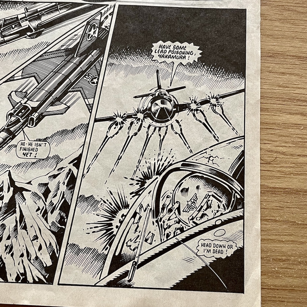That’s it pretty much summed up but there are two main reasons I love this strip so much: the fact it’s full of great action between my two favourite pilots and planes and how it was delving into some of the backstory, taking tentative steps at setting up some mythology. It reads as an important early chapter in what I’d hoped would be a long-running comic. Wraither and Yakamura were likely chosen because they formed a special two-plane Matchbox Starter Pack (my Starter Pack in fact) and because of this it seemed they were destined to duke it out forever.
