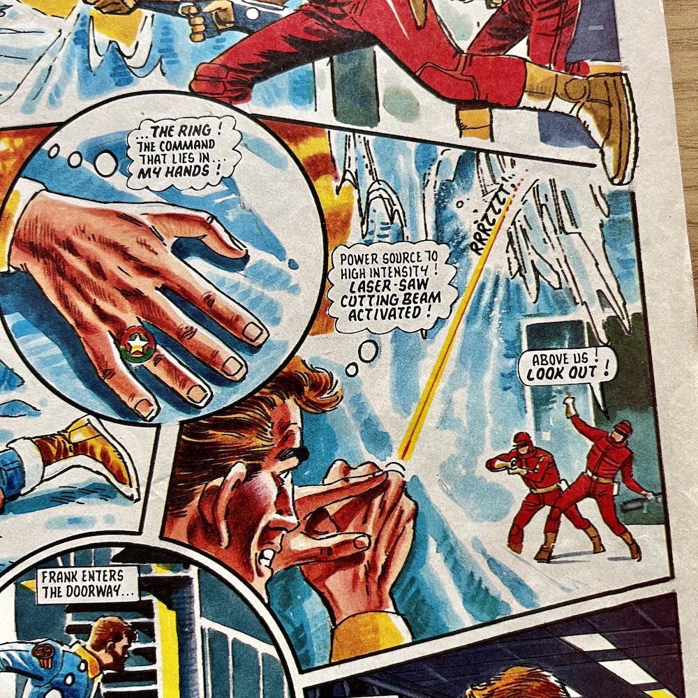 His wing ended up over chilly Arctic waters and fired upon from an unknown source, with only giant icebergs beneath them. On the first page of this issue’s strip you can see gun ports in one of them and it’s on this that our ejected pilot Frank Turner finds himself. Another character named by the comic, Frank is soon set upon by Skull Squadron goons but he’s not as unarmed as it would seem, using another of the miniature gadgets the comic invented for the rings.