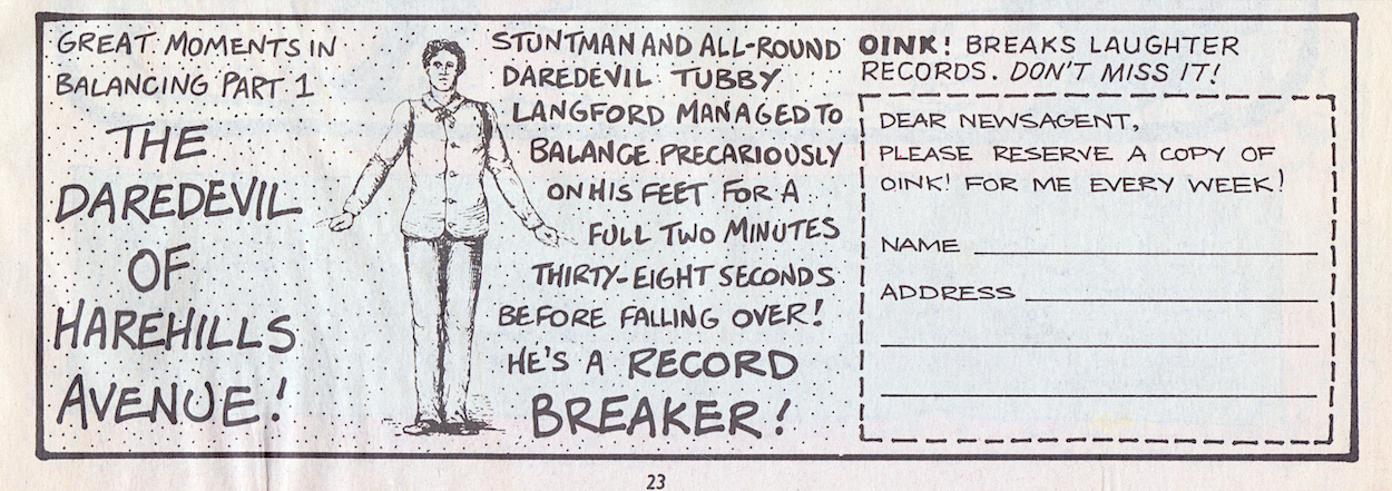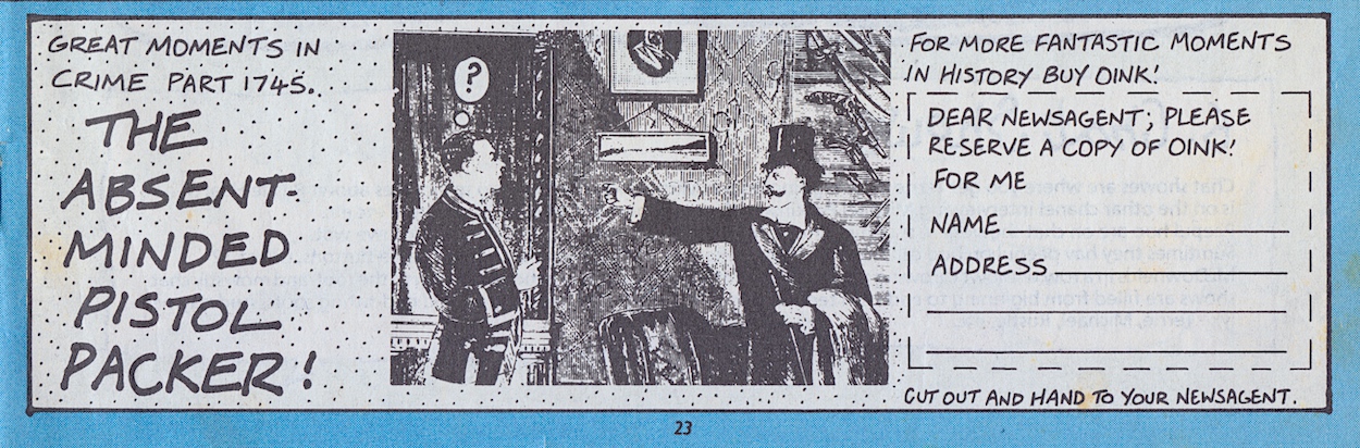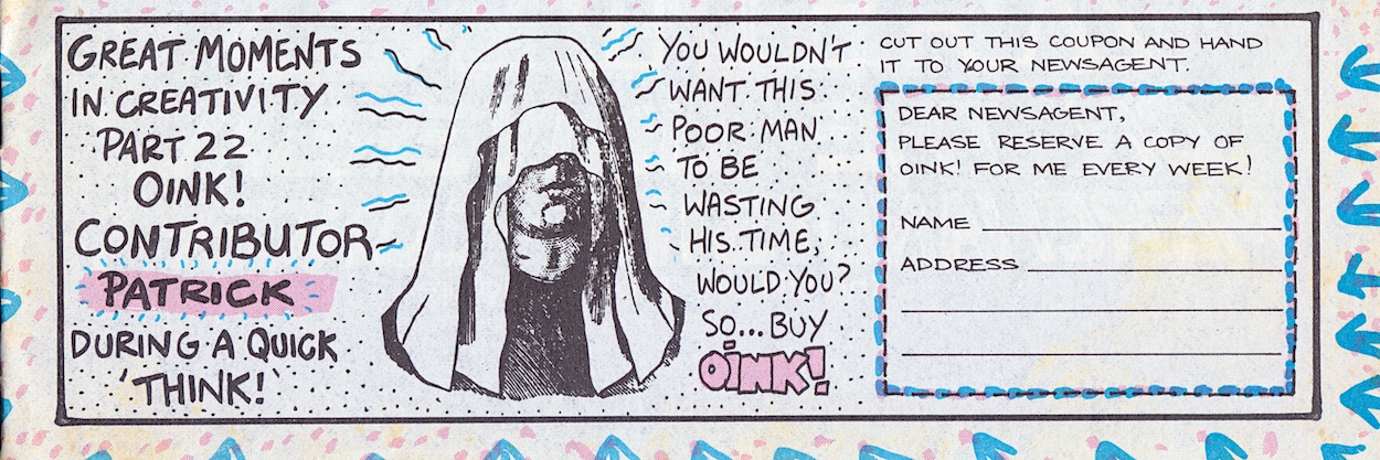 If OiNK had continued in its best format as a fortnightly under IPC, who were very happy with the sales figures and the press coverage it was creating for them as a publisher, could it have lasted longer? Perhaps. We’ll never know. For now this final issue wraps up with the first of a new series. Judging by the old OiNK logo this was created by Michael Peek when it was still a weekly and, with this being the last page (save for a Fleetway Annuals advert on the back) Patrick added a little sign-off gag with the speech balloon.