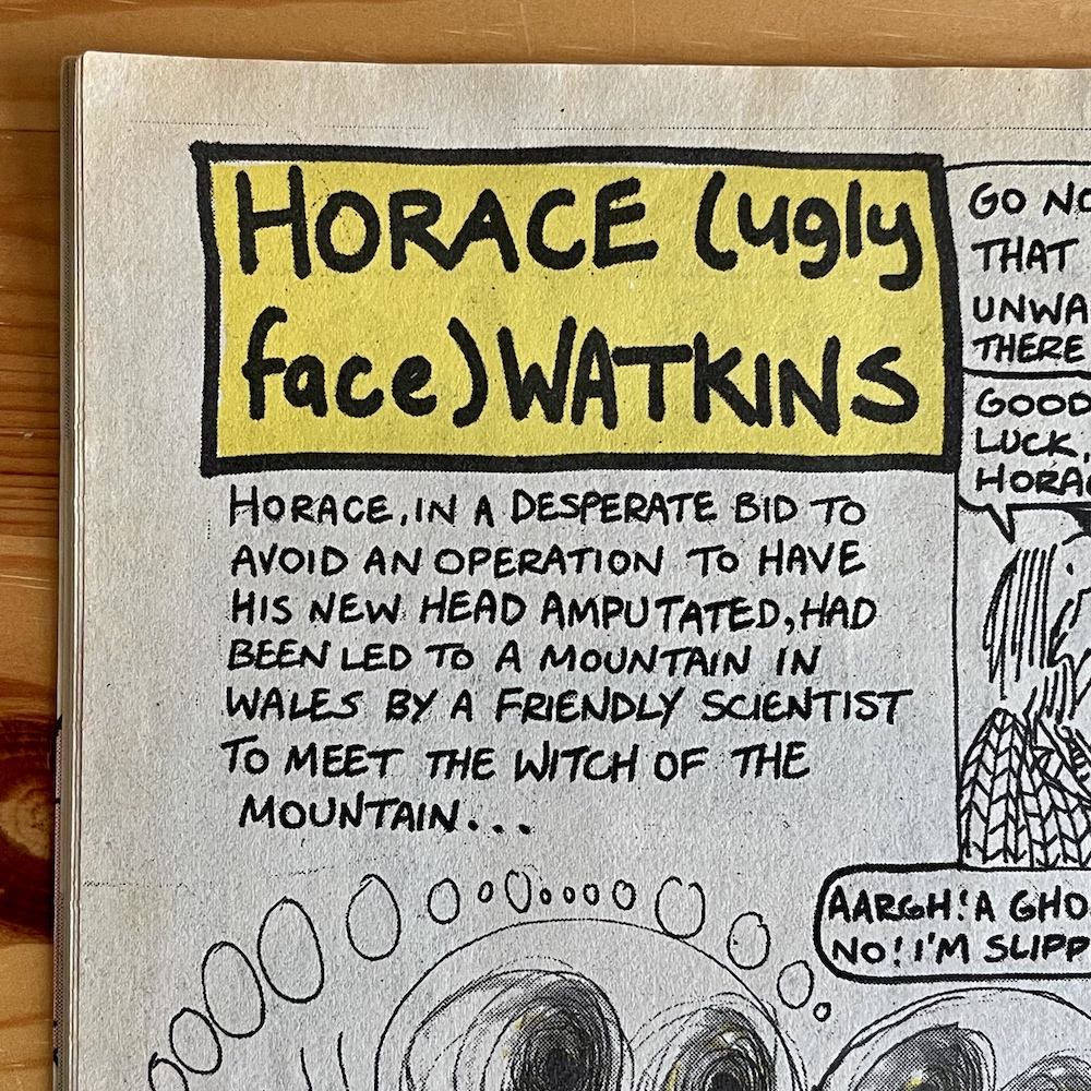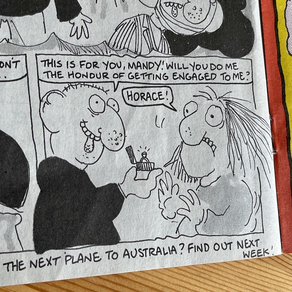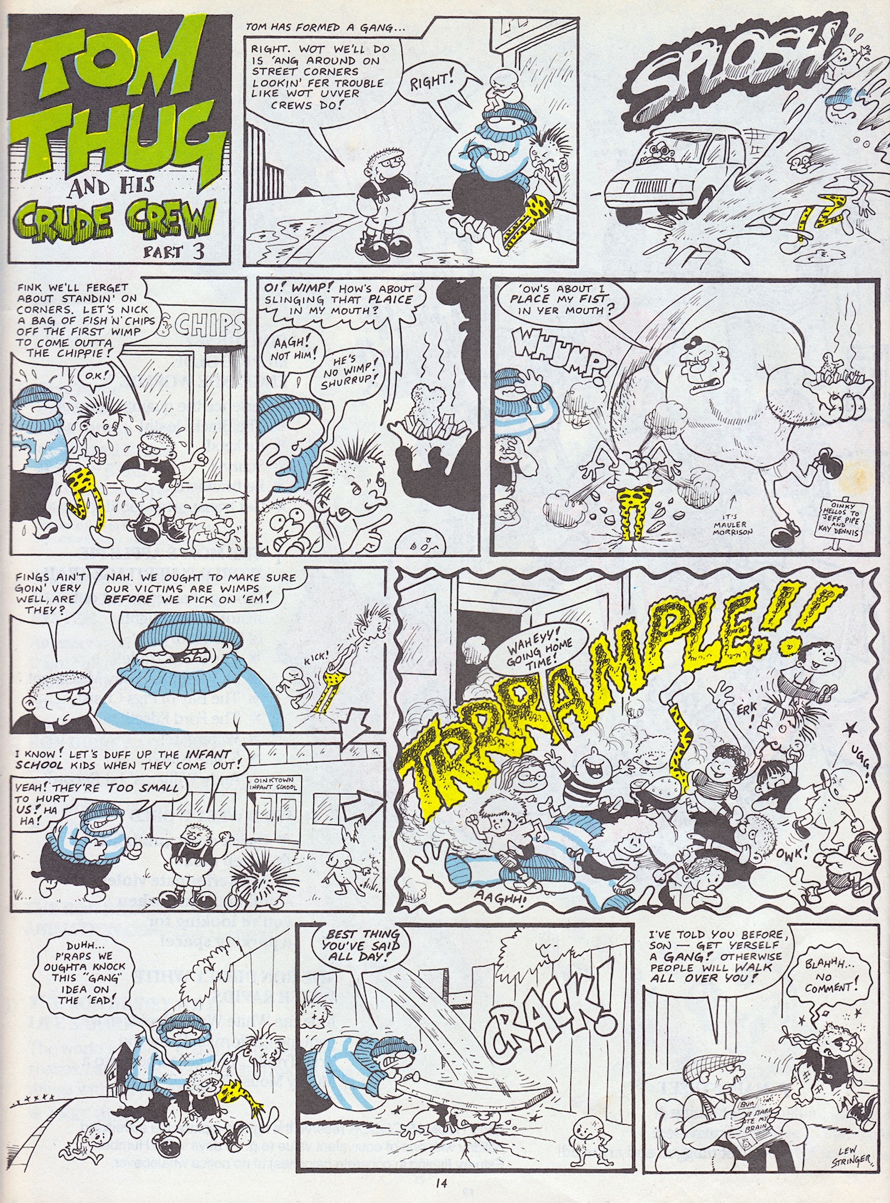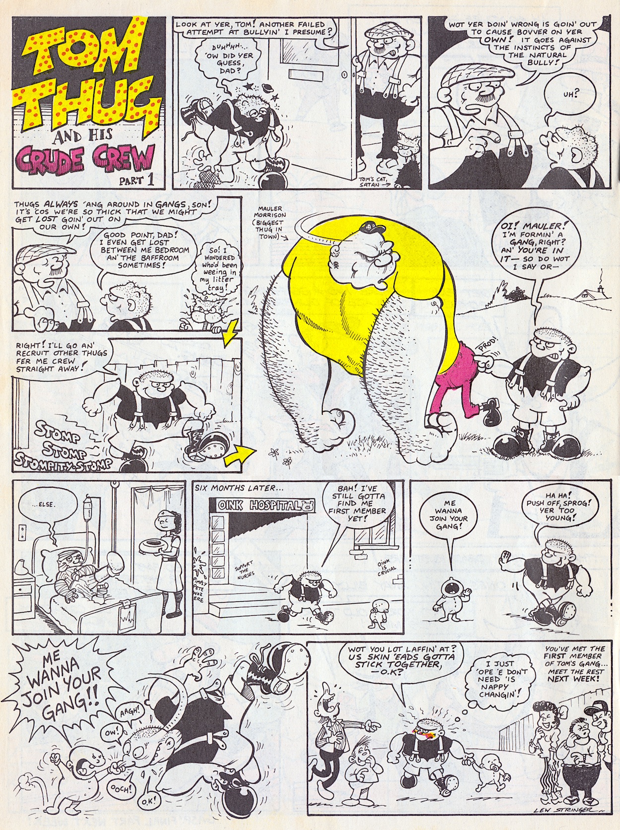Fittingly, one of the pages that mentions this is the final issue is co-editor Tony Husband’s Horace (Ugly Face) Watkins in which he laments the end of the comic (as do watching aliens) before he and Mandy decide to cheer up by getting married. Tom Thug’s strip begins with him telling us he’s received some terrible news and we think it’s about OiNK, but actually he’s just been offered a job. A job he ultimately fails at on day one, naturally.