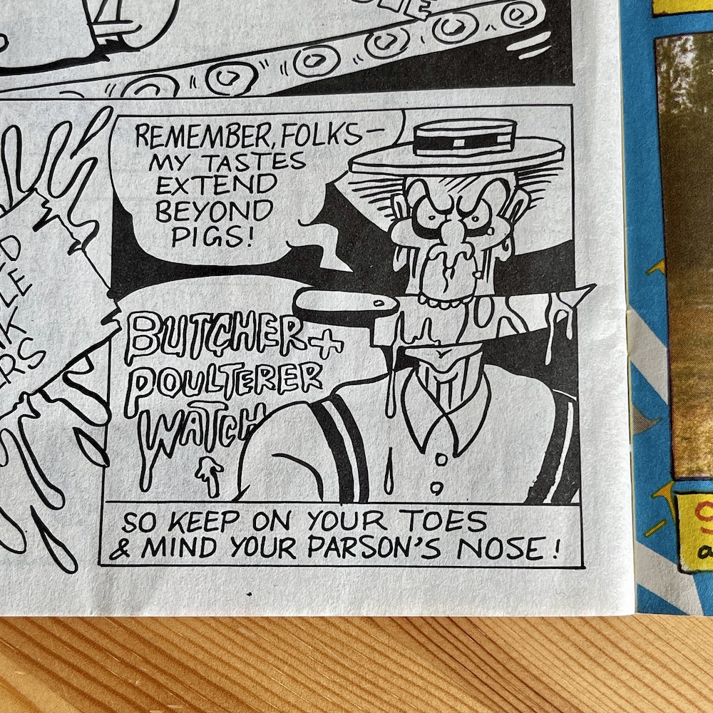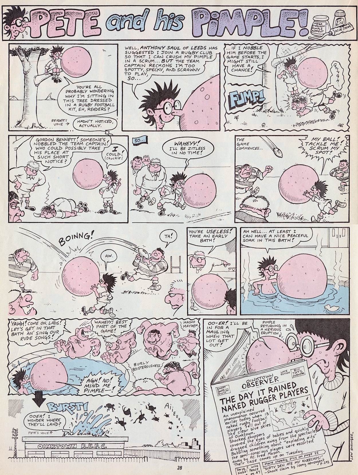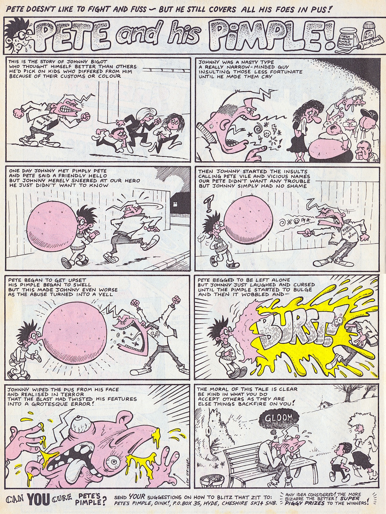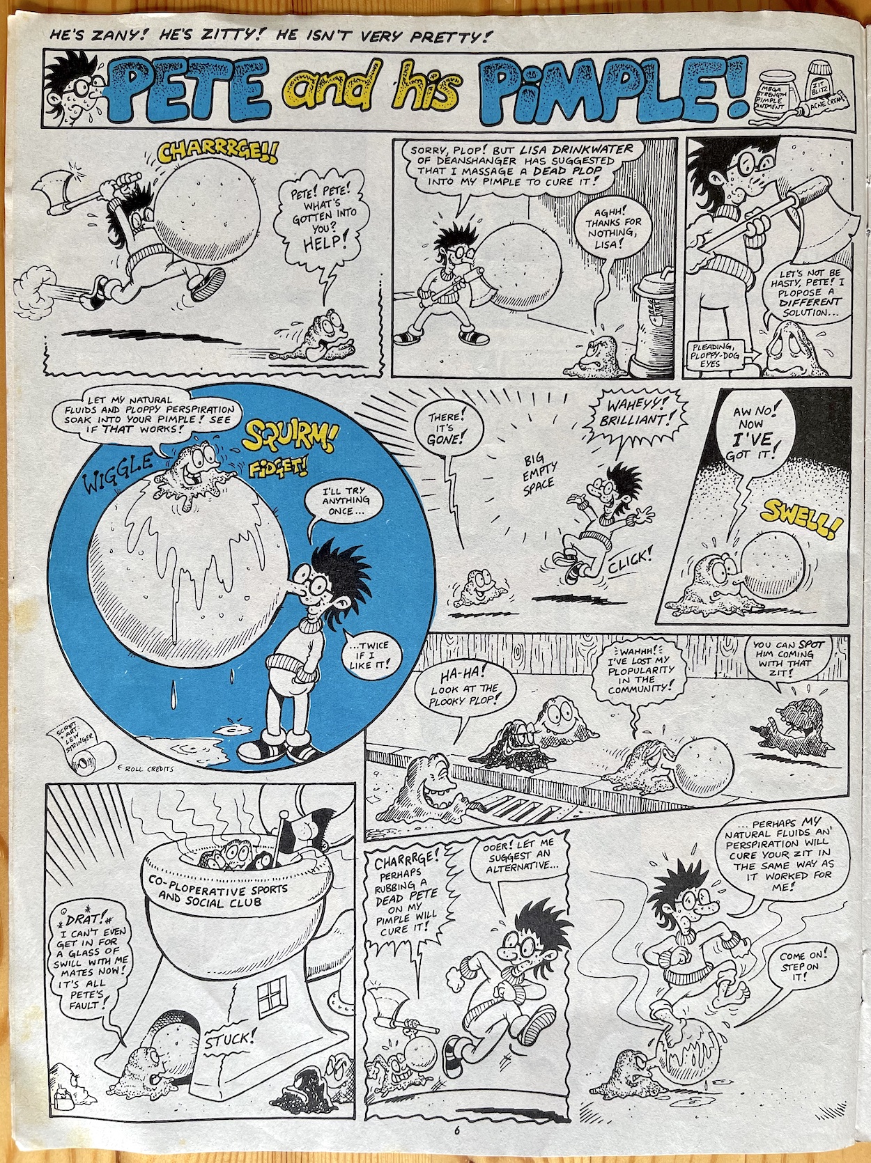 Children’s television presenter and artist Tony Hart and his plasticine pal Morph are the subject of a spoof in the shape of The Amazing Adventures of Murph and in a three-page Pete and his Pimple strip he’s daydreaming about being a superhero called Zit Man. Thankfully his arch nemesis Mister Squeeze trips over his own words, quite literally, in the nick of time and falls into his own death trap. Ingenious stuff.