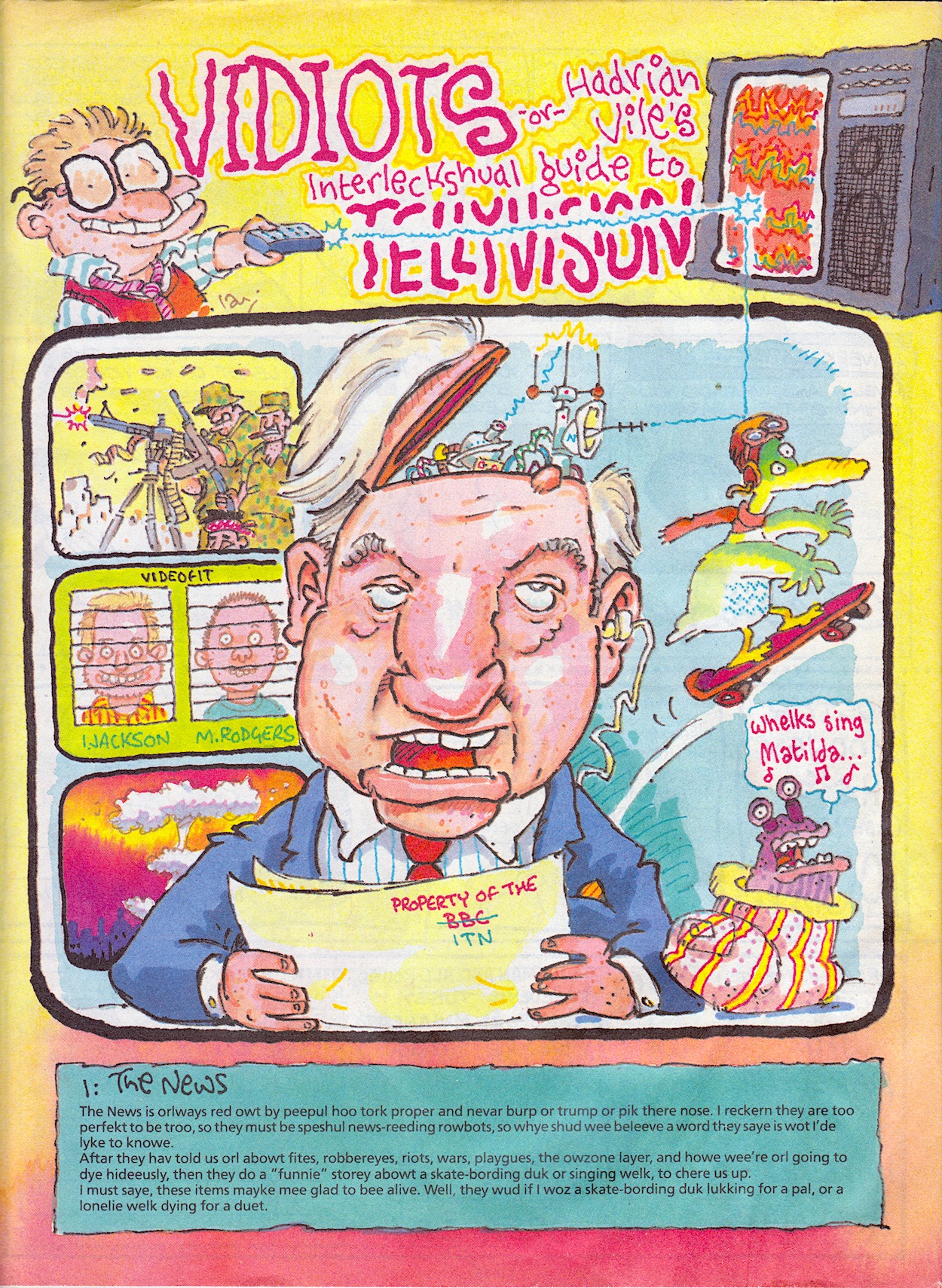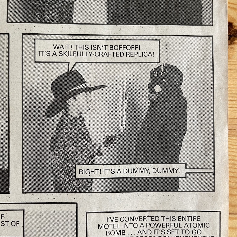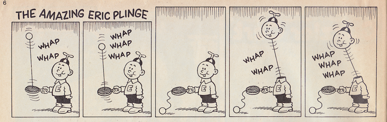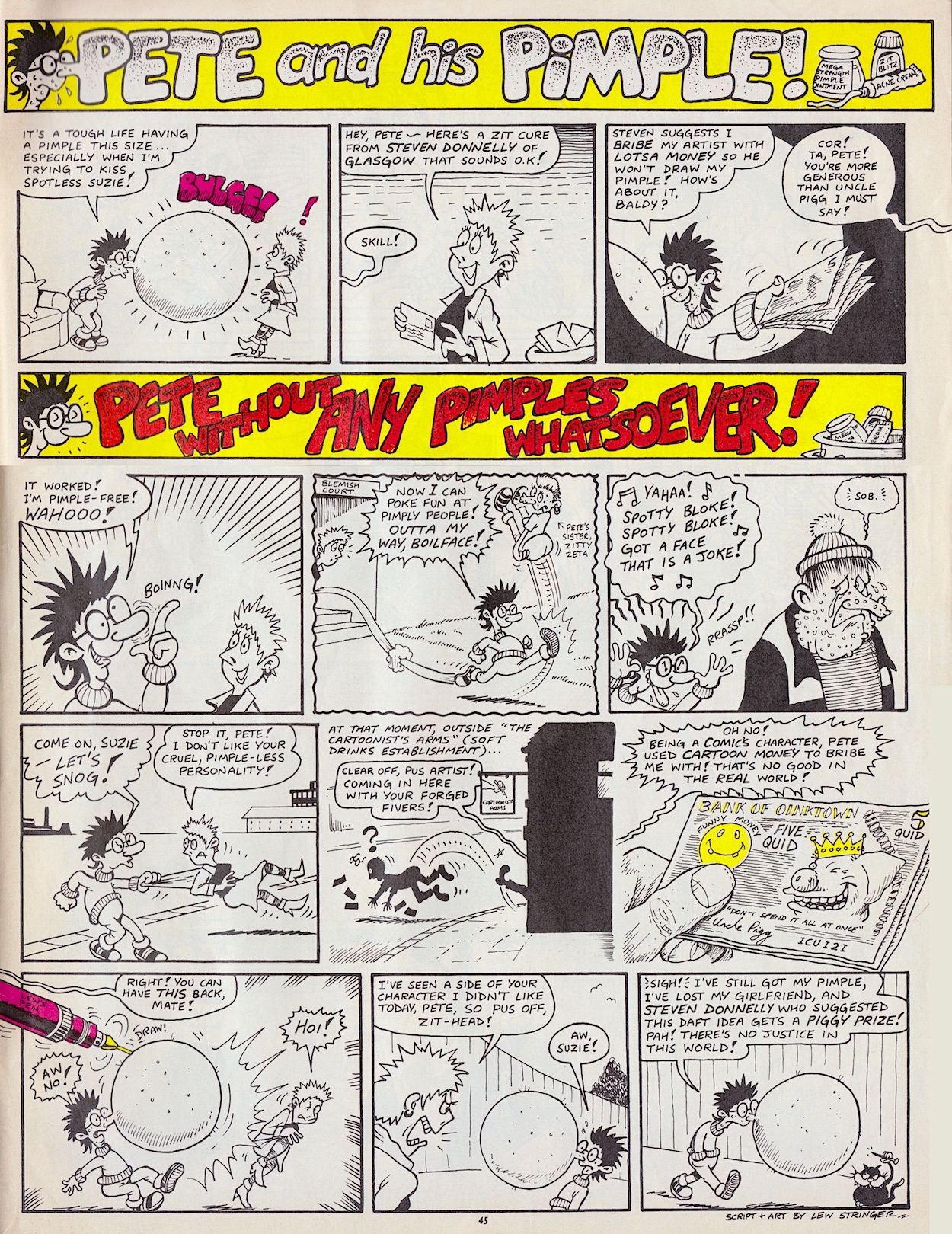 Children’s television presenter and artist Tony Hart and his plasticine pal Morph are the subject of a spoof in the shape of The Amazing Adventures of Murph and in a three-page Pete and his Pimple strip he’s daydreaming about being a superhero called Zit Man. Thankfully his arch nemesis Mister Squeeze trips over his own words, quite literally, in the nick of time and falls into his own death trap. Ingenious stuff.