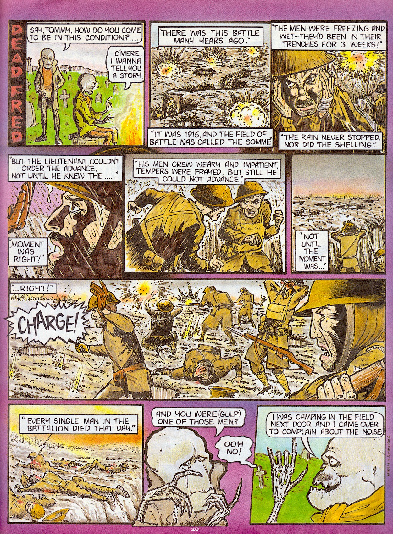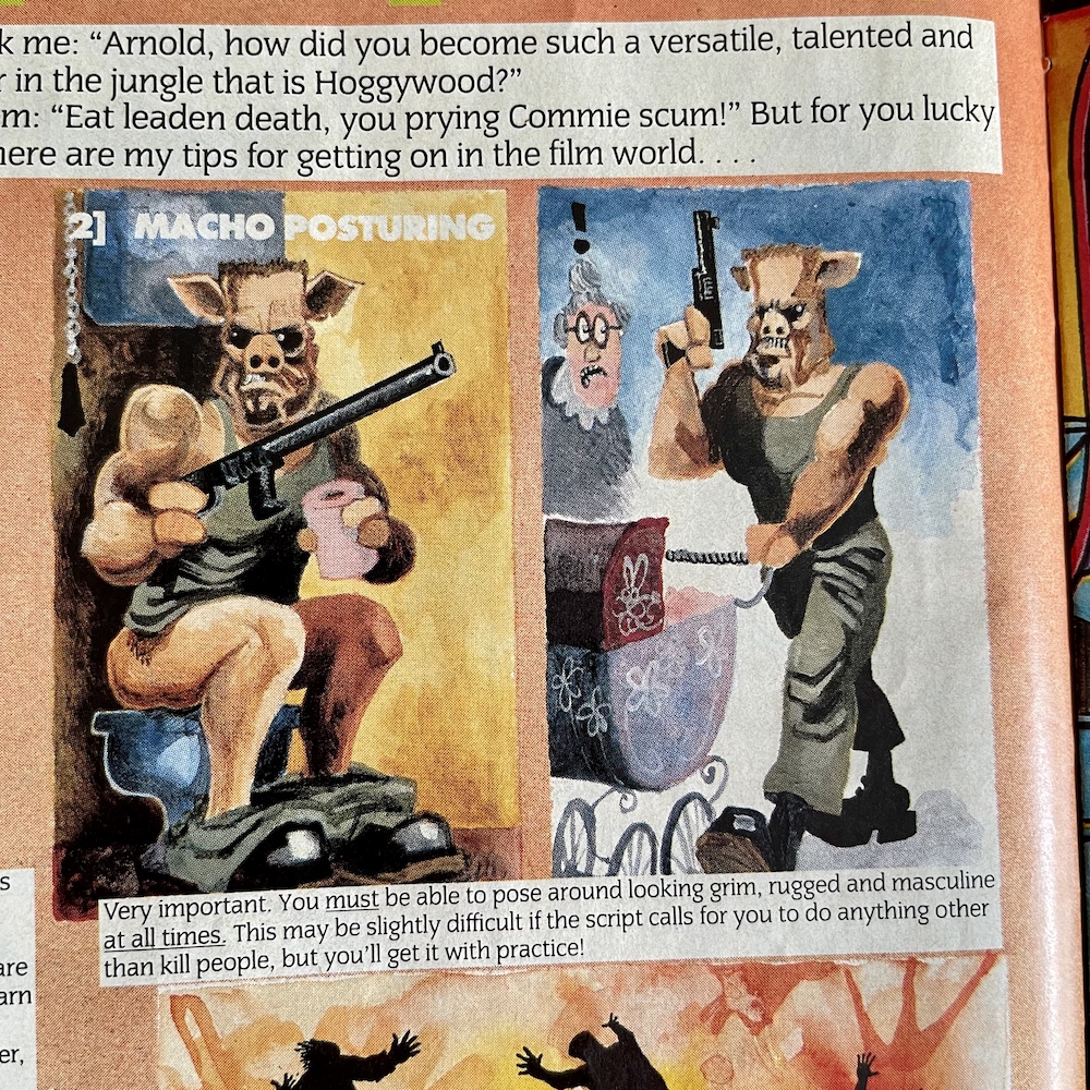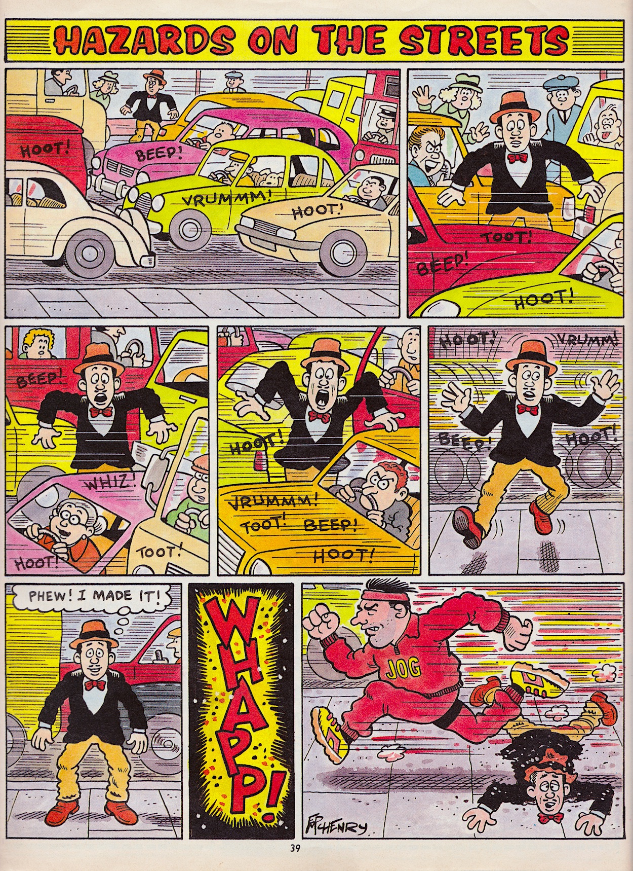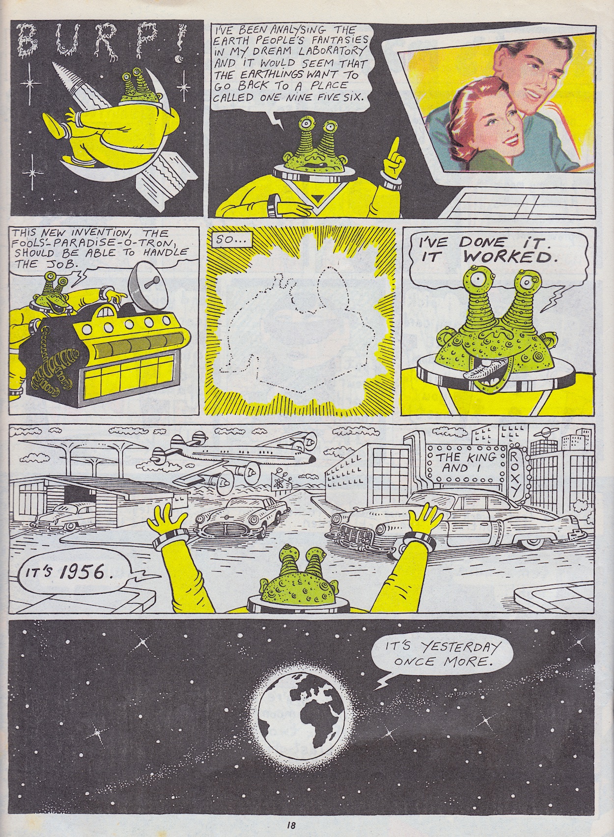 Children’s television presenter and artist Tony Hart and his plasticine pal Morph are the subject of a spoof in the shape of The Amazing Adventures of Murph and in a three-page Pete and his Pimple strip he’s daydreaming about being a superhero called Zit Man. Thankfully his arch nemesis Mister Squeeze trips over his own words, quite literally, in the nick of time and falls into his own death trap. Ingenious stuff.