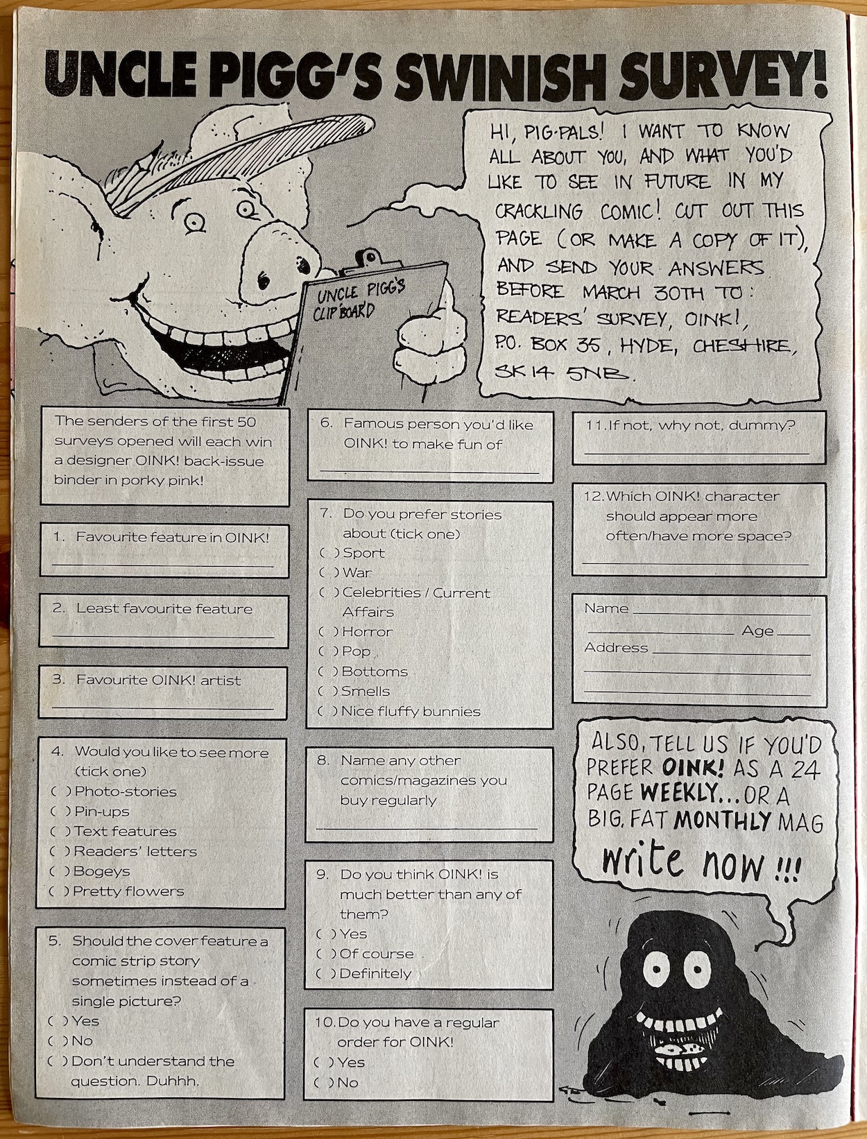 This is by no means the end of OiNK on its own blog! There’s a wealth of extra features for our favourite comic already on here and a ton of OiNK content to come over the next few years at least, I promise. Actually, the read through itself isn’t even finished yet with four more editions to come over the next two years and yes, I’m going to make you wait for each of them, just as I have to wait until their real time release dates to read them. The first of these will be The OiNK! Book 1989’s review which will be published on Christmas Day 2023. Perfect anarchic post-dinner laughs, I think.