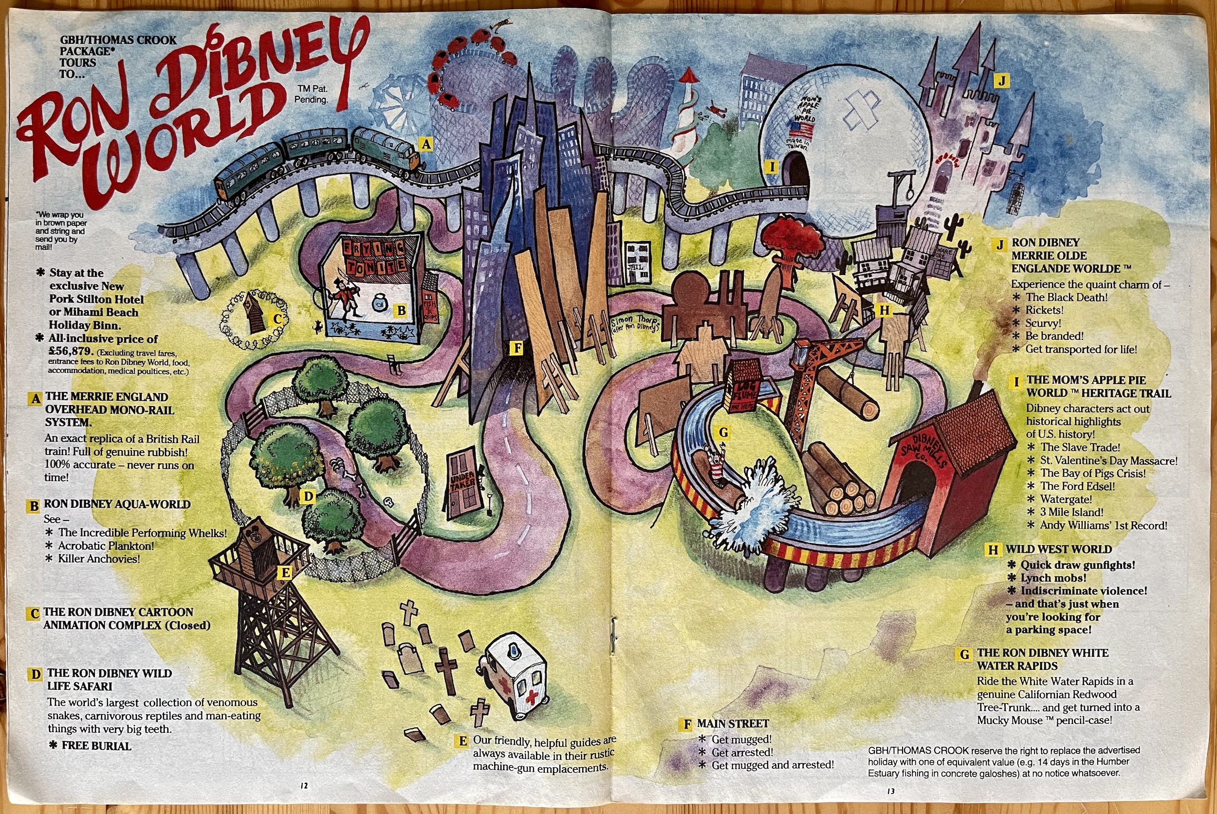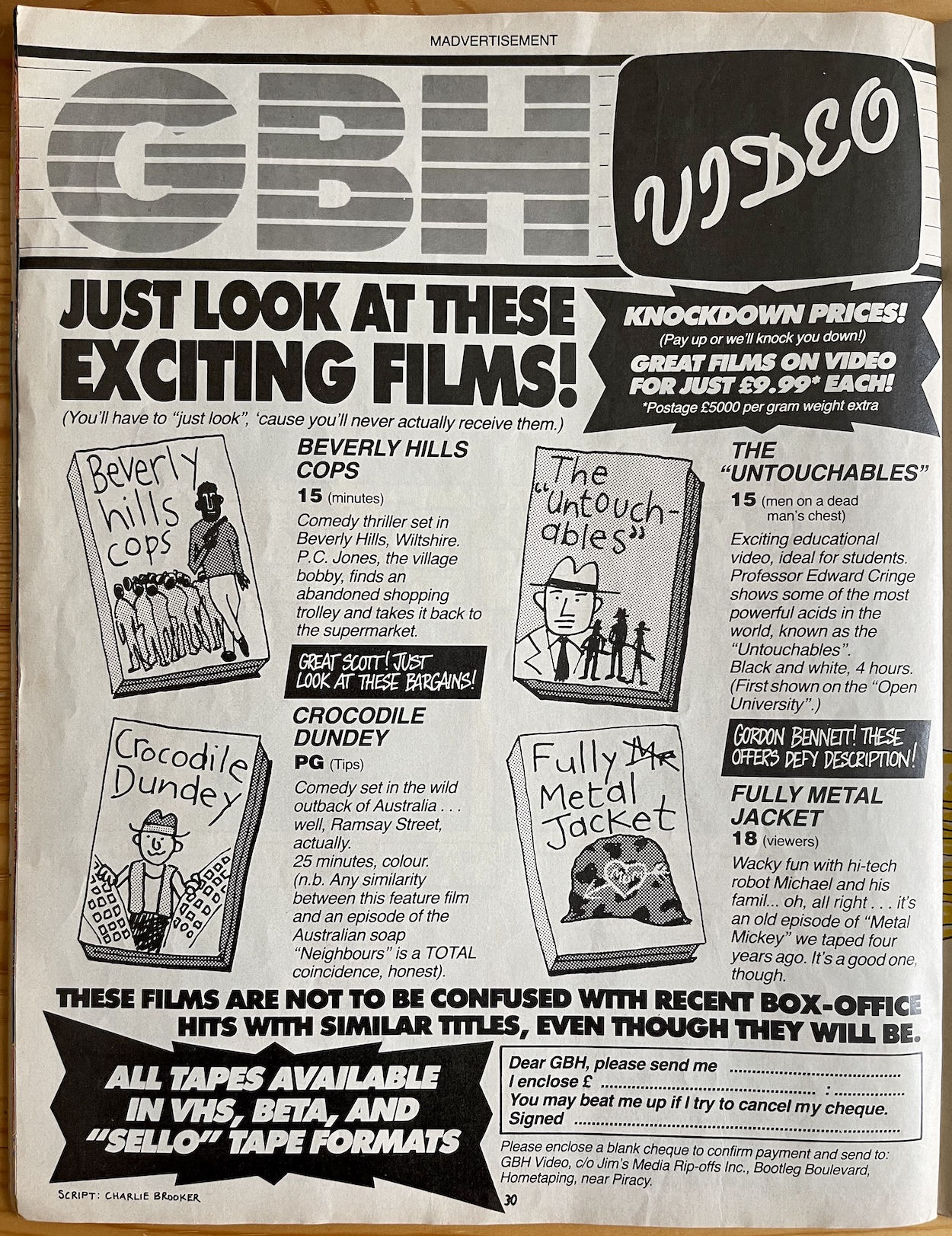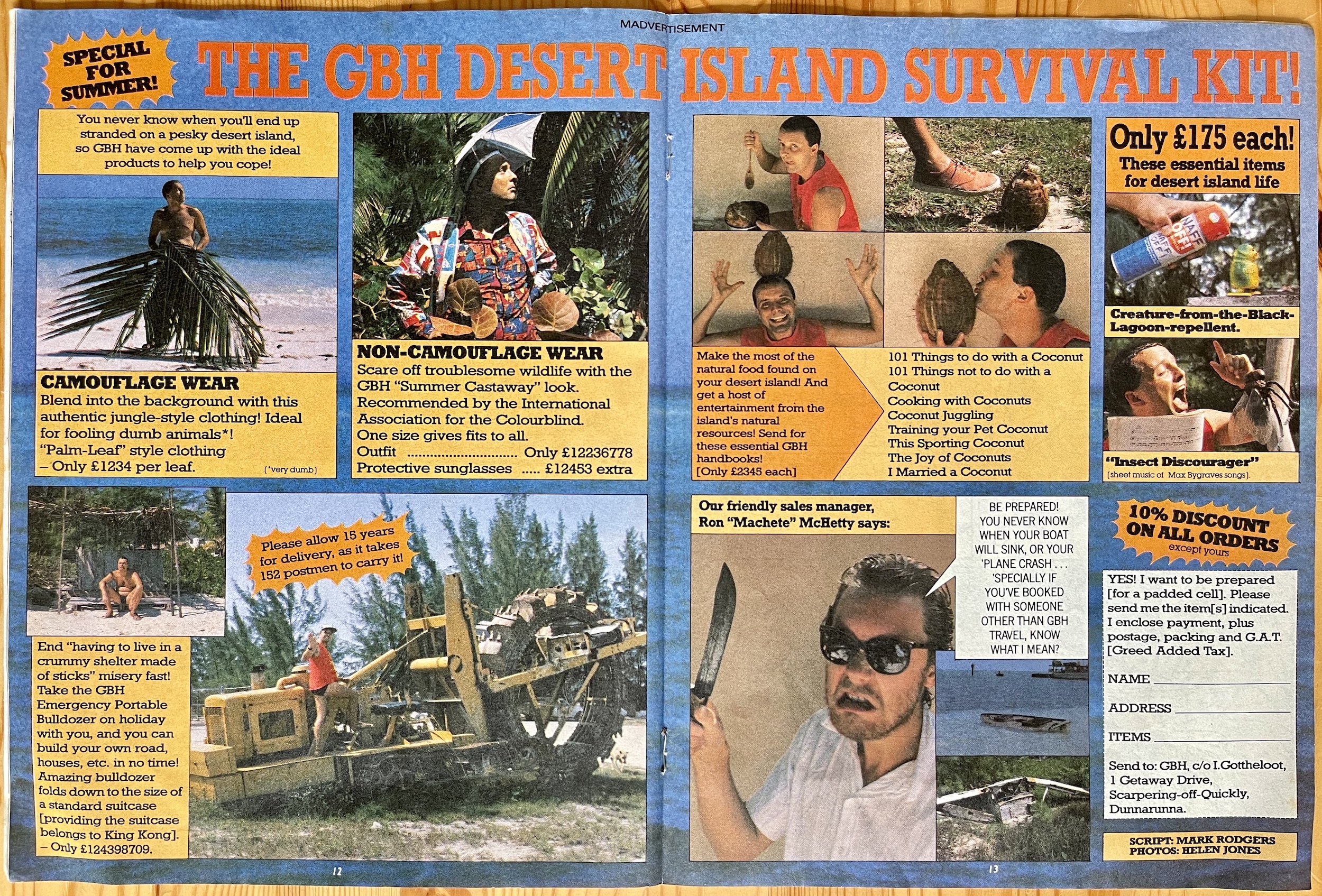 For their final regular attempt to extort as much money as possible from people the gangsters at GBH pulled out all the stops with a middle-page spread of the ultimate luxury in holiday travel, on a cruise. Thomas Crook was a name used already by Simon Thorp in previous Madvertisements but this is surely the funniest of the lot. I love the sheer audacity to list off all of the gags! This kept me giggling for a good while in both 1988 and 2023 and is one of my favourite GBH entries from the entire series. Please take your time and savour every little bit of this one.