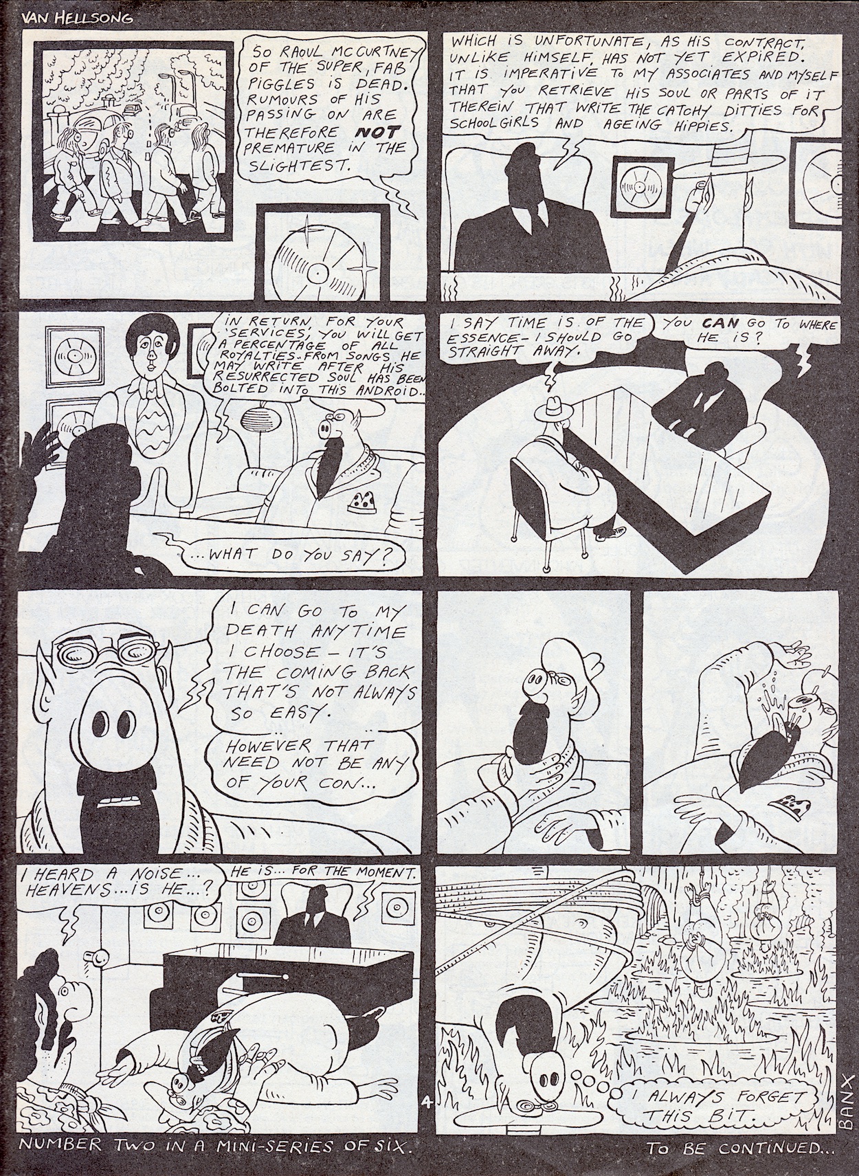 It seems if OiNK were to continue one of Kev’s Three Scientists from #66 was going to be making an Alfred Hitchcock-esque cameo in every issue. Did you spot him above? In this issue Kev brings us not only this and the Rotten Rhyme above but also his take on Jack & Jill and Who Killed Cock Robin?, spoofs of 80s car commercials and weather forecasts, and last but by no means least the brilliantly titled The Plop Factory – The Studios of Britain’s top record producers Sock, Bacon and Waterworks.