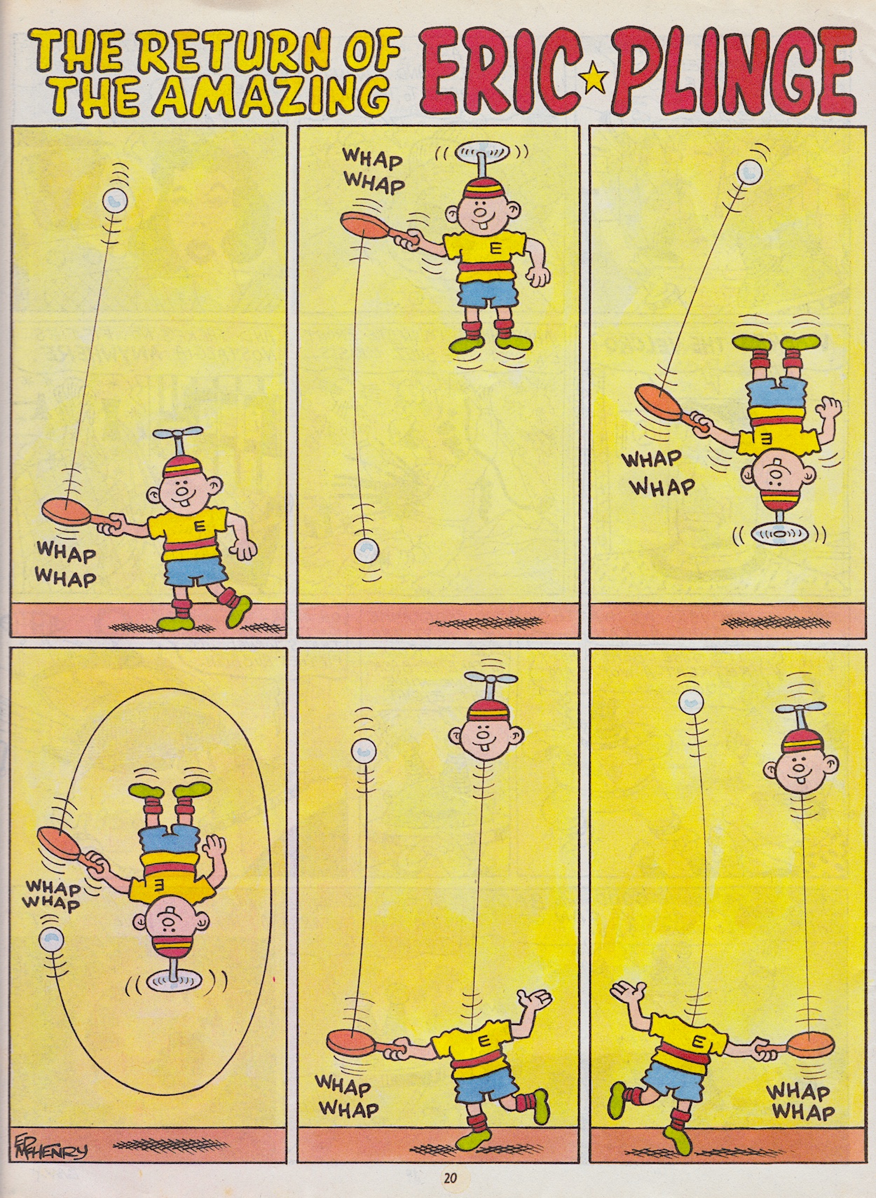From one OiNK star to two at once. Two cartoonists decided to create something similar to each other’s, a visual gag only achievable in this medium and one where OiNK was the perfect place to try it. So Charlie Brooker’s Freddie Flop and Brian Luck return for their final appearances and, suitably for the last issue, the randomly-appearing Mr Plinge returns for one last time and with a twin sister in tow alongside (or rather above) a one-off Mr Girth.