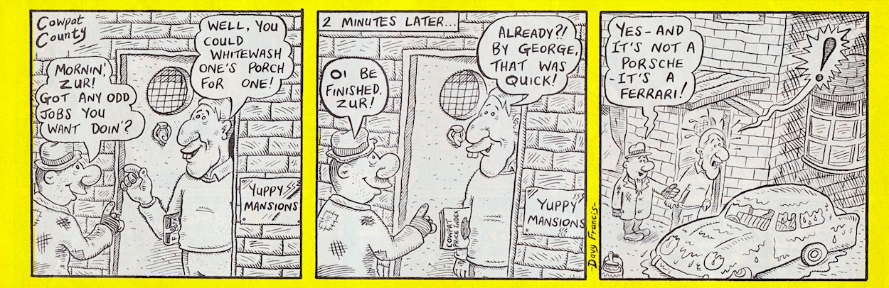 The final strip I’m going to show you (although not the final image) from all 68 regular OiNKs should really be a large, multi-page affair, shouldn’t it? Some big, grand gesture to round things off with. Nope. One of the biggest laughs in this issue comes from a tiny little quarter-page strip of Ed McHenry‘s Wally of the West. A simply perfect example of the mini-strips crammed into each issue and how OiNK could generate a ton of laughs from content of all shapes and sizes.