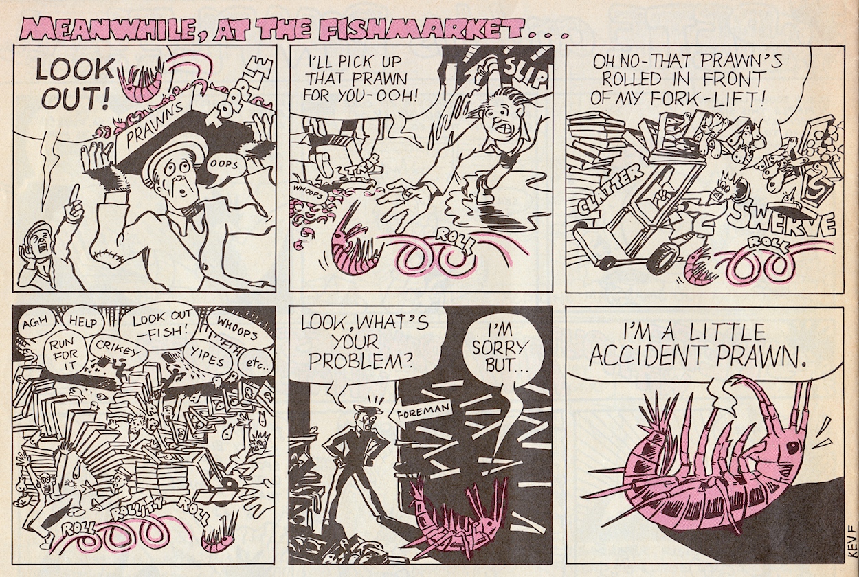 Meanwhile, Kev F Sutherland must’ve created a lot of content for forthcoming issues because it appears it’s all been collected together here. Just like Ian Jackson and Jeremy Banx before him, Kev’s work is synonymous with OiNK in my eyes and here he has eight strips in total to his name across a whopping ten pages. His Meanwhile… series was always a highlight so I couldn’t let this issue go without including at least one, and it’s one which got a memorable roar of laughter out of me at ten-years-of-age.