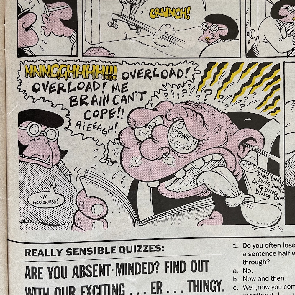 Placed nowhere near each other in the issue, the joyous surprise at seeing the same gag played out after enjoying it so much the first time is a delight. It reminds me of my embarrassing moment in the hospital waiting room when I discovered a second Herbert Bowes strip in the first OiNK Holiday Special! Thankfully this time I was reading alone.