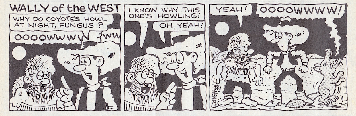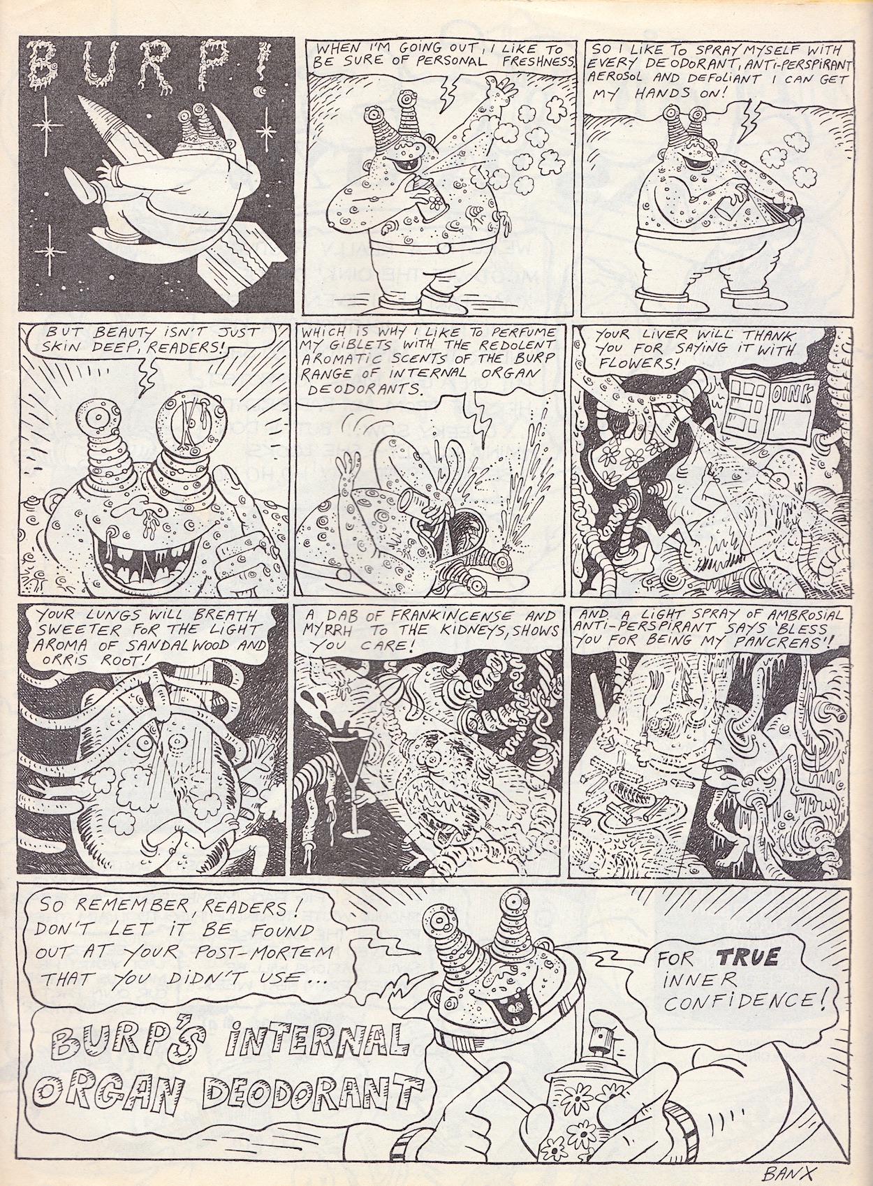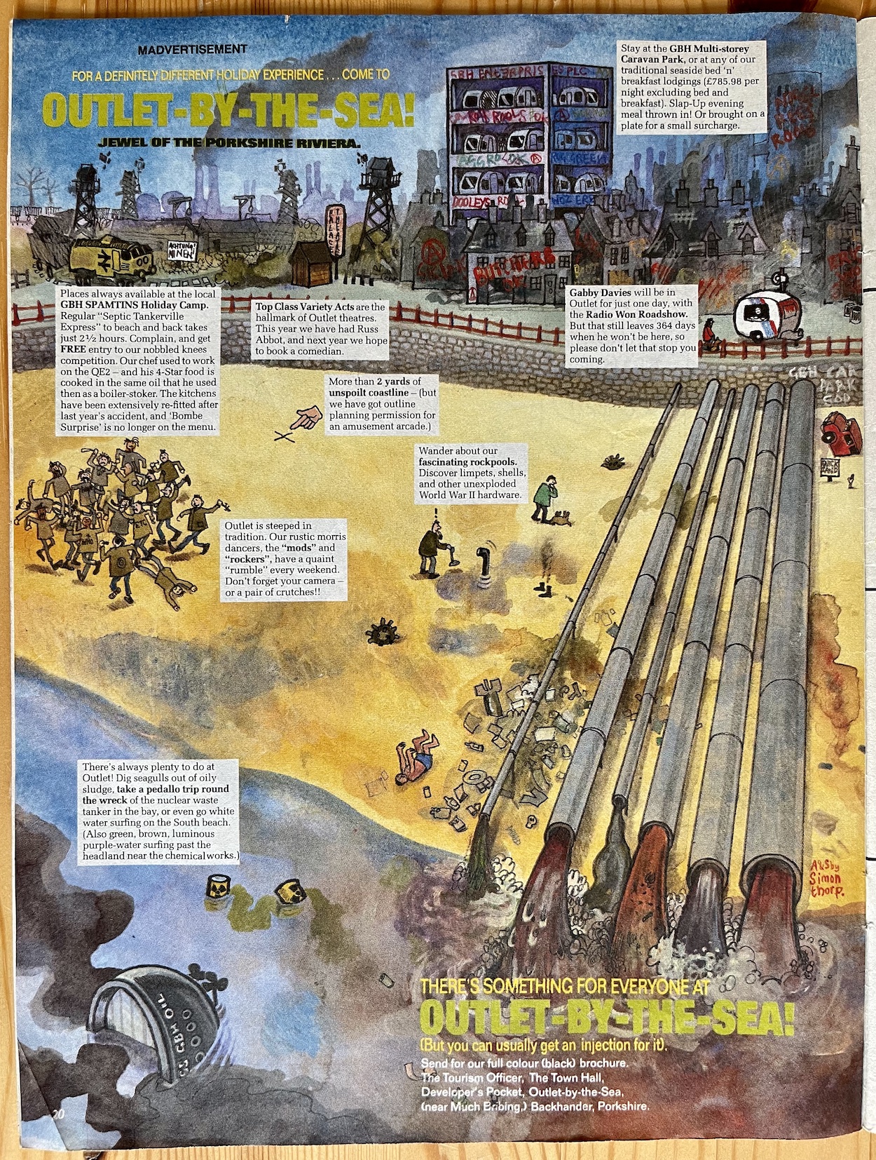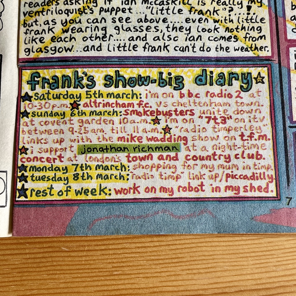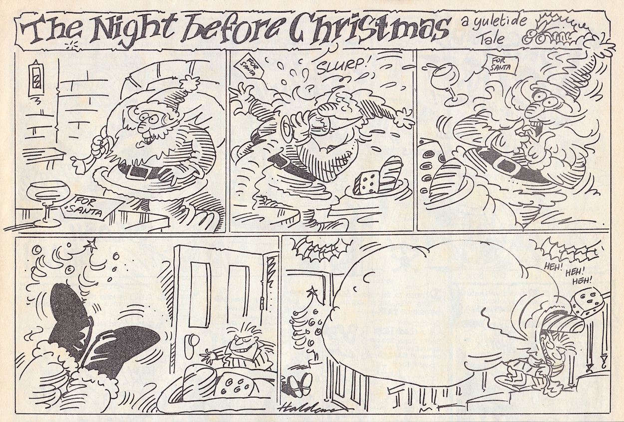 This issue leans more towards the text-heavy pages than normal and there are more examples of the partnership that seems to have blossomed between young writer Charlie Brooker and the unique art of Steve Gibson on these pages, specifically Doctor Jonathan Swiller’s Home Health Check-Up. The character is a parody of Dr Jonathan Miller, a physician who also happened to be a director, author and actor, and was well known in the 1980s.