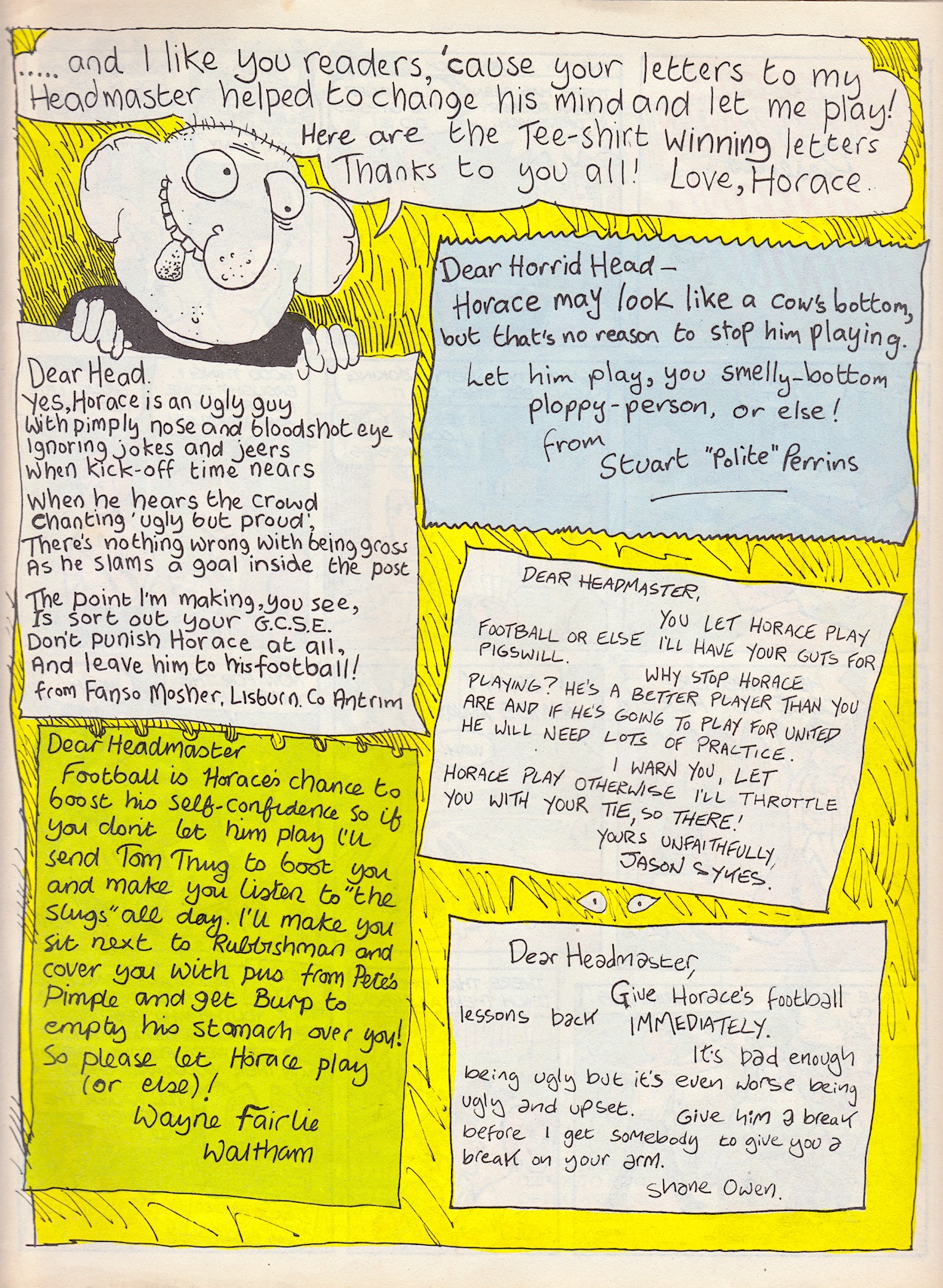 A couple of quick Lew Stringer highlights next. A quite monumental moment was approaching for Tom Thug, something that had never happened before in children’s funny comics. Reminding me somewhat of how The Sekret Diary ov Hadrian Vile saw his mum go through an actual pregnancy before his new baby sister appeared in the story, Tom would actually leave school and go out into the adult world. But he still has to finish his final year of course. Then in Pete and his Pimple, with the Zitbusters from #41 back a lucky reader got to see themselves as the person who saves the day! Sort of. Well, basically how Lew imagined they might look anyway.
